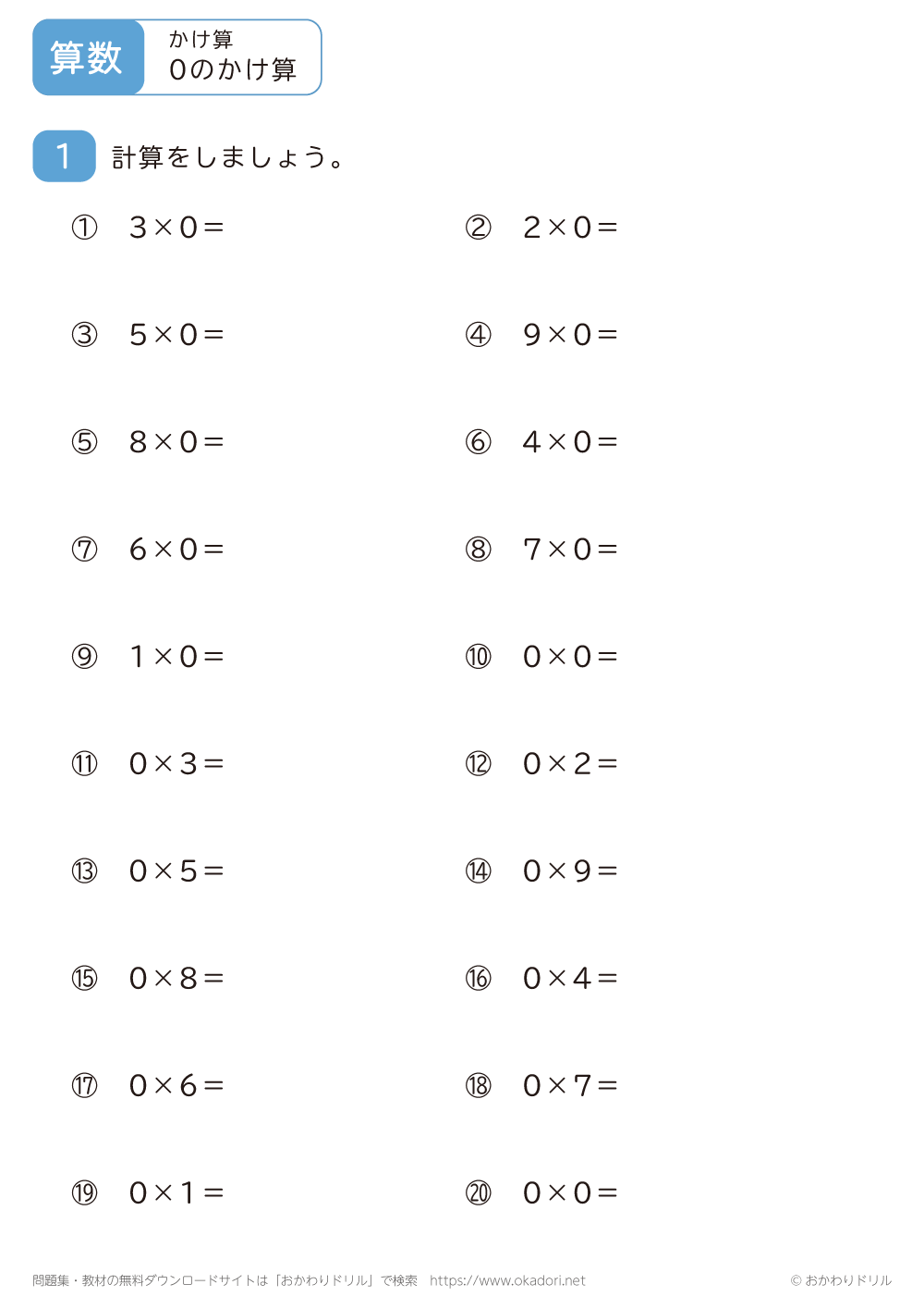 0のかけ算の問題です。0のかけ算の問題を解いてみましょう。