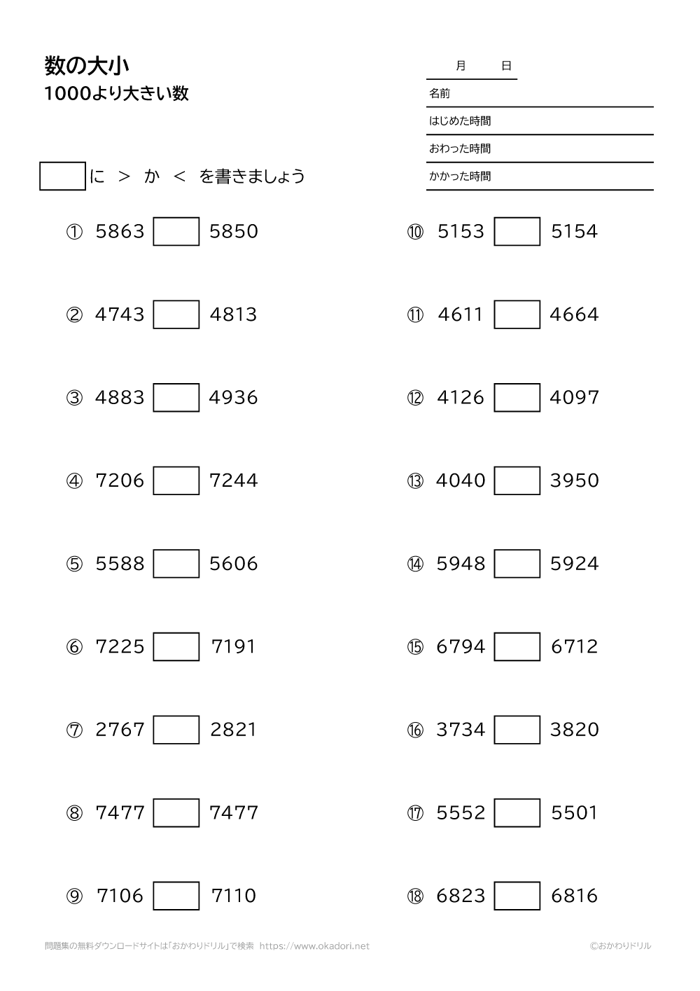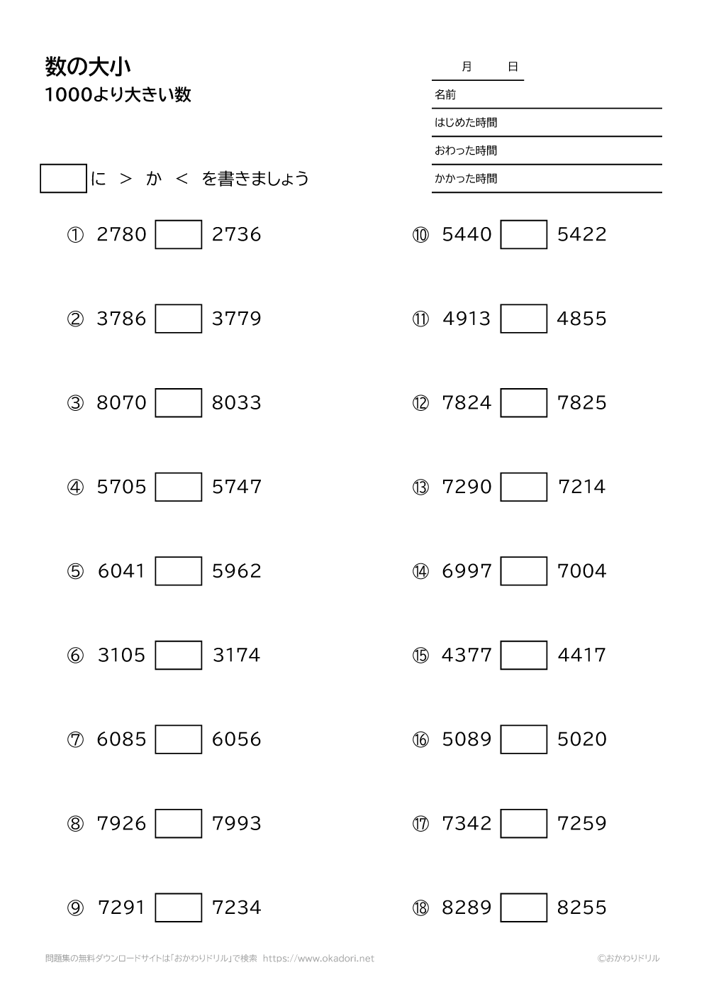 ・一万までの数の大小を、>や<の不等号であわらすことを学びます。