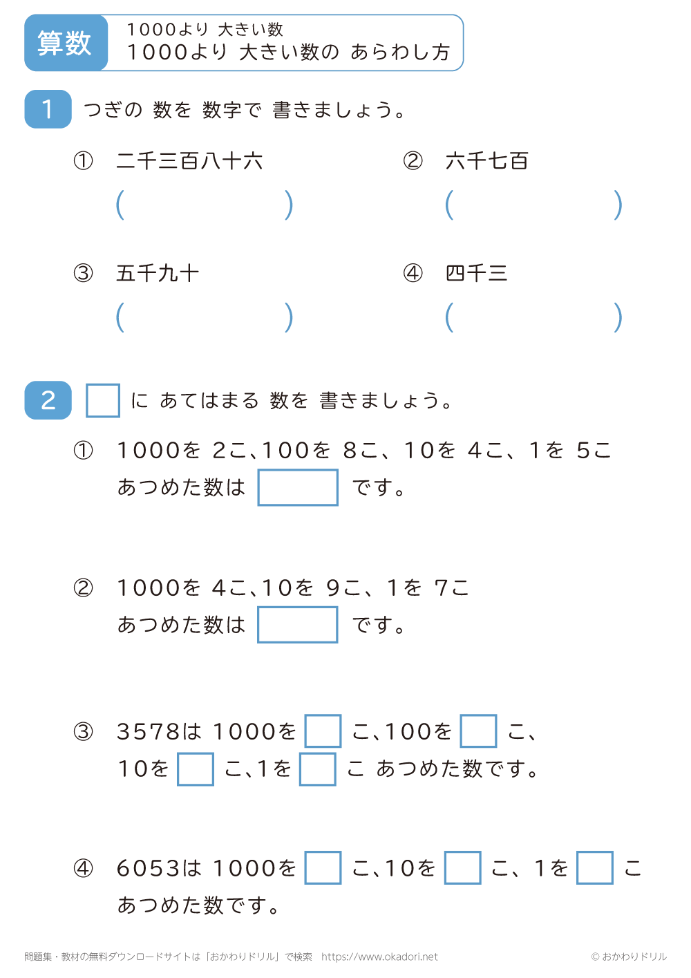 このページは、小学2年生で習う「1000より大きい数のあらわし方」が学習できるページです。