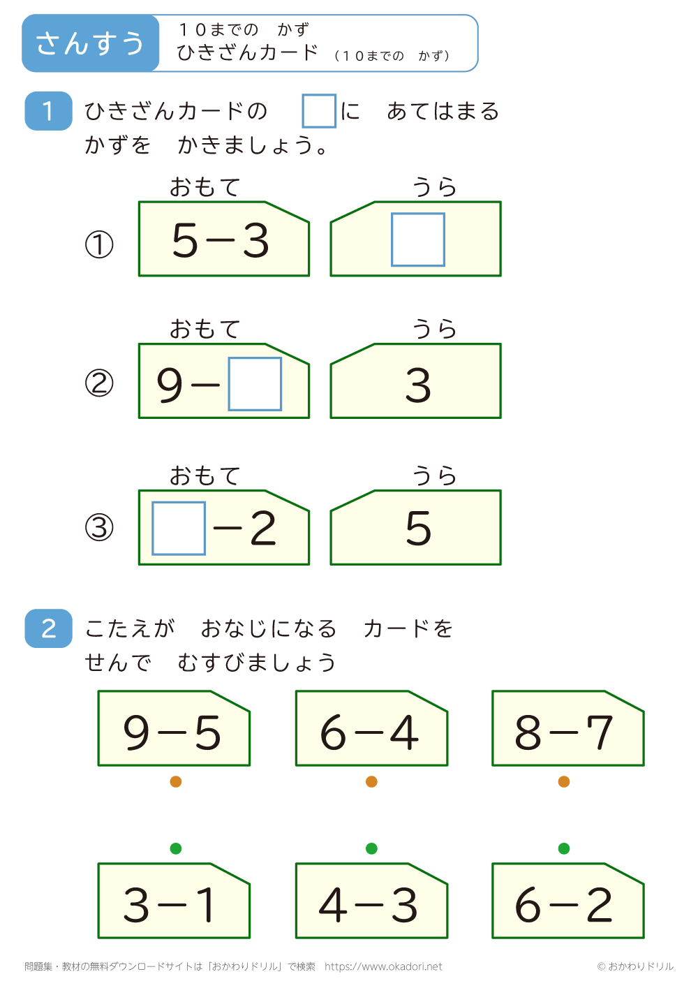 引き算カードの問題です。10までの数の引き算カードを計算してみましょう。