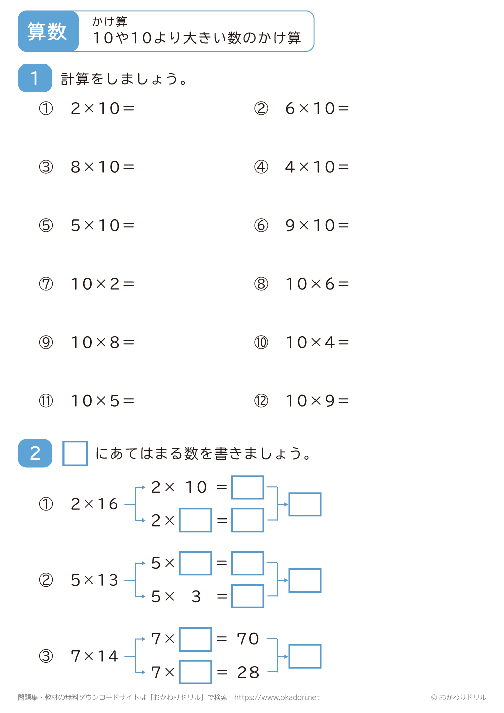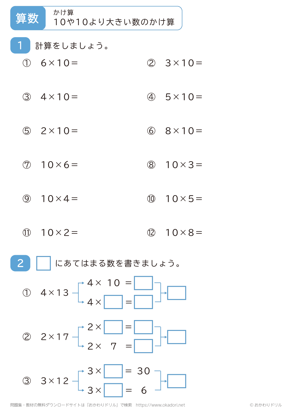 このページは、小学3年生で習う「10や10より大きい数のかけ算」が学習できるページです。