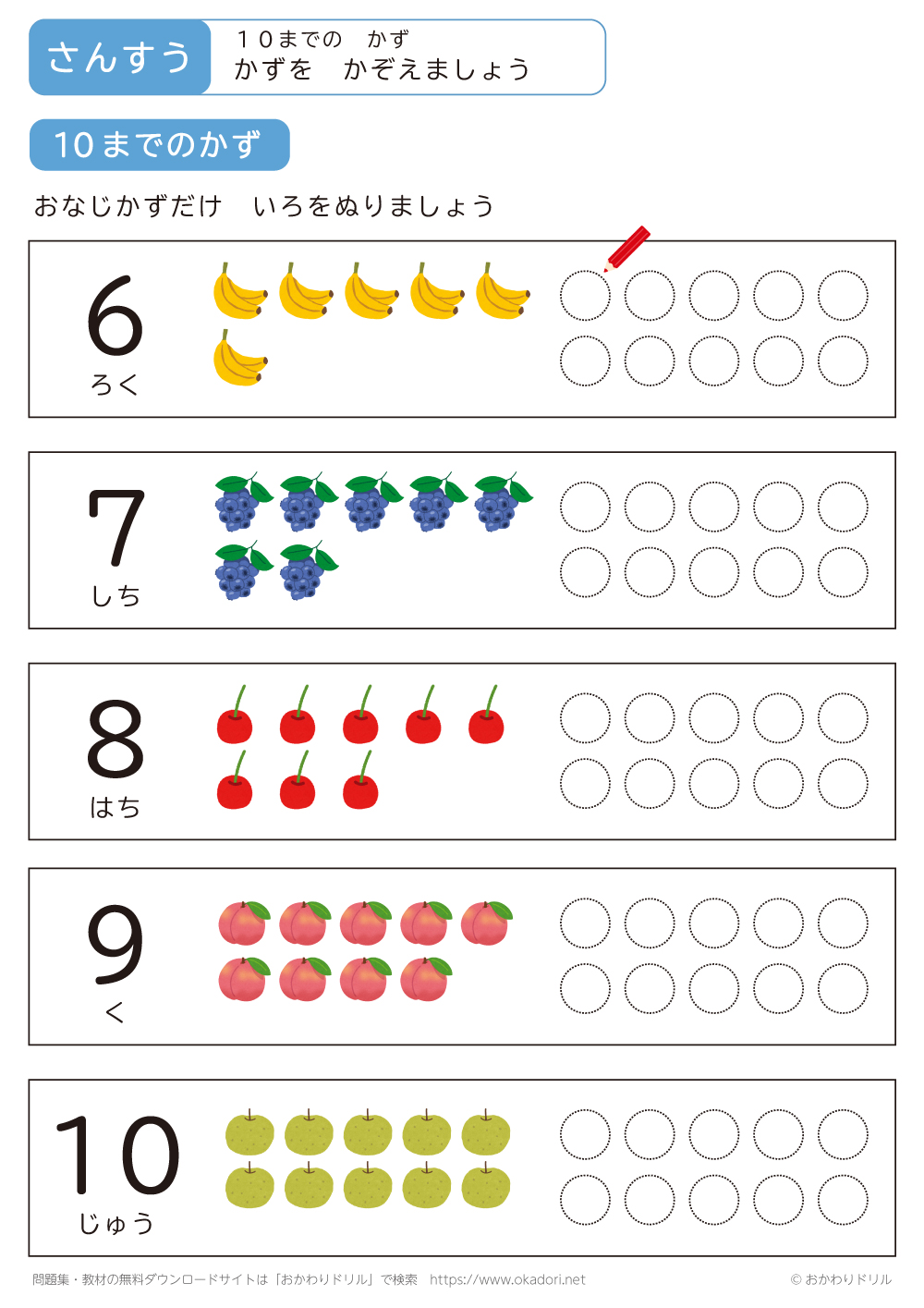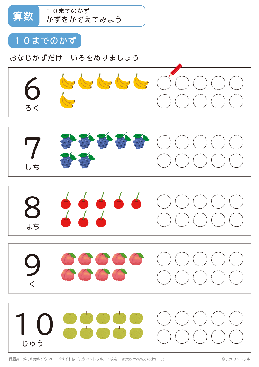 10までの数をかぞえます。1から10までの数をかぞえて、色をぬりましょう。