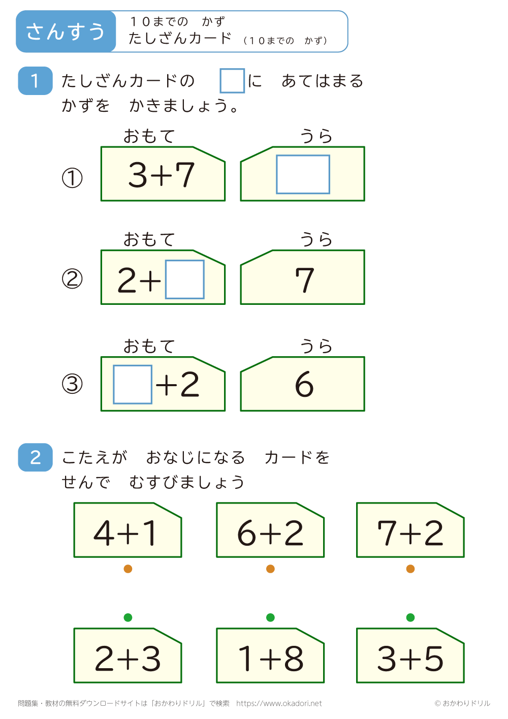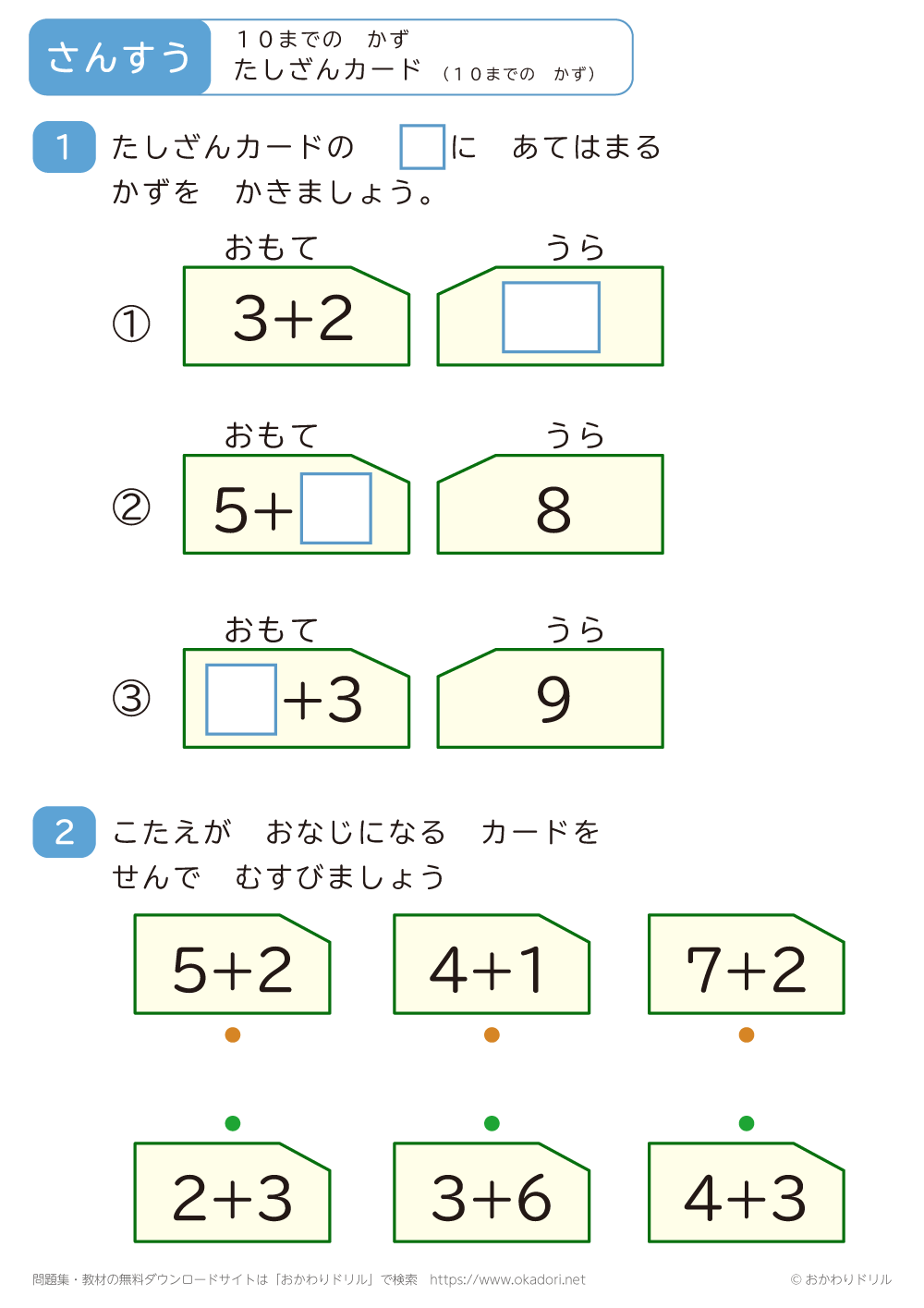 足し算カードの問題です。10までの数の足し算カードを計算してみましょう。