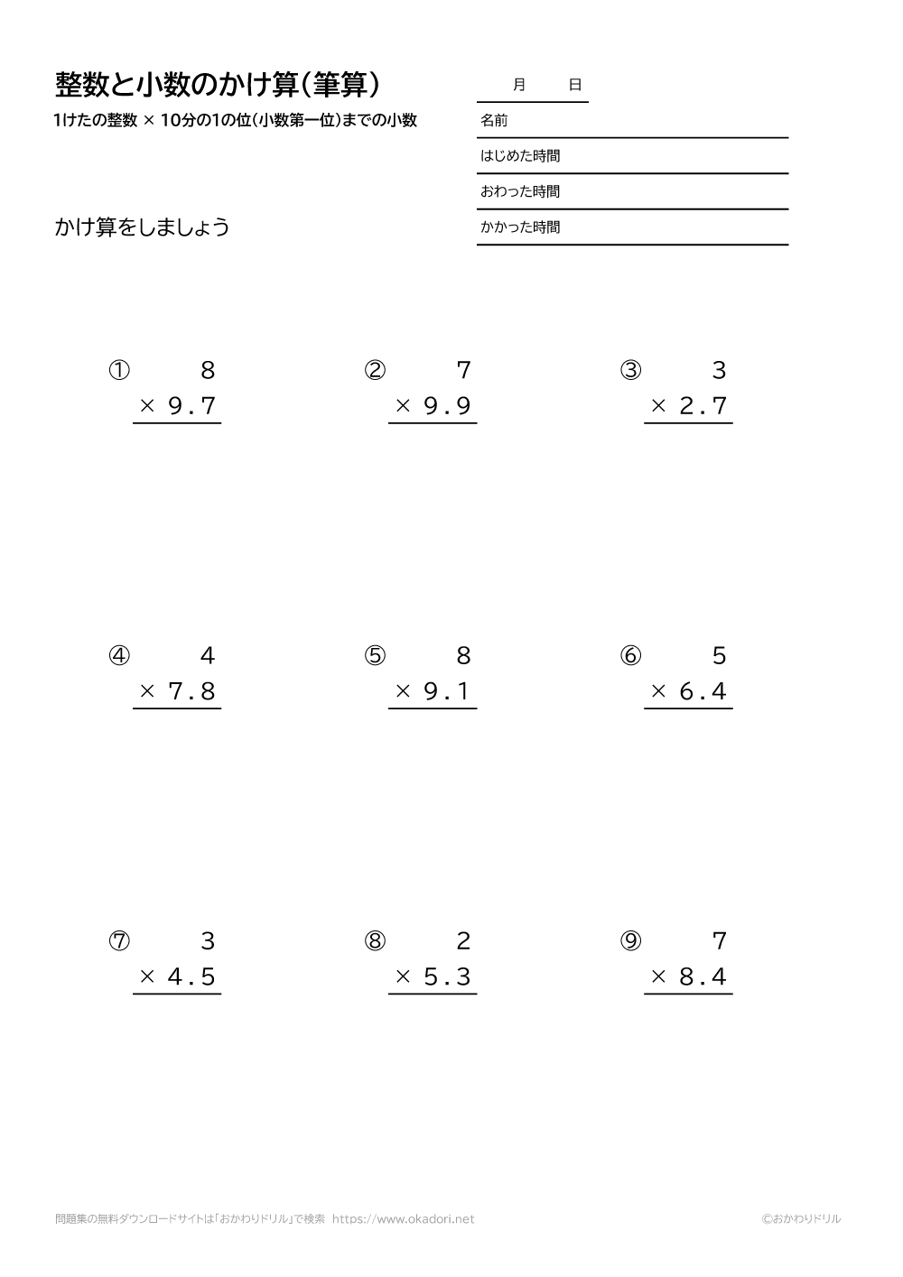 ・1桁の整数に、10分の1の位(小数第一位)までの小数を掛ける問題です。