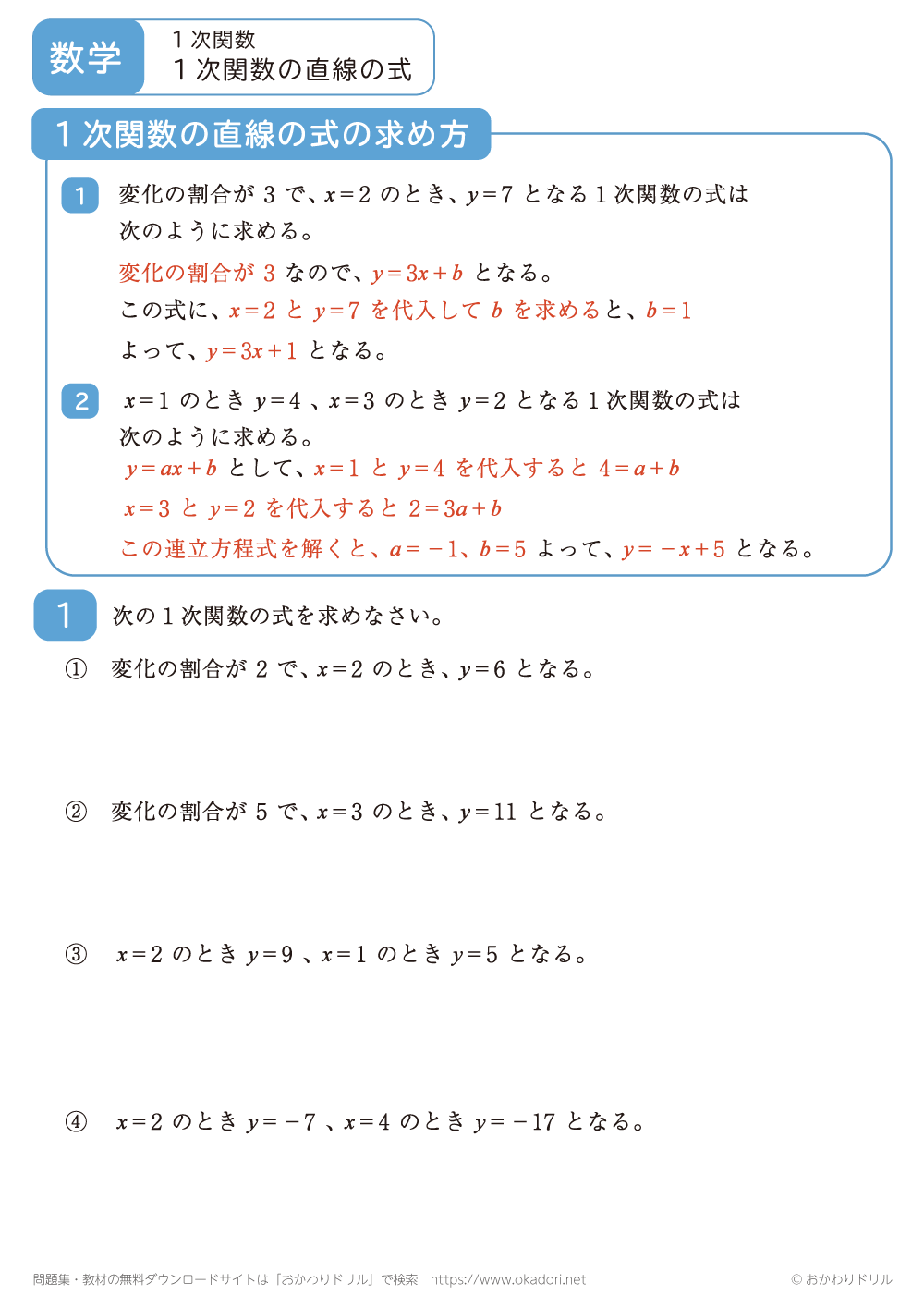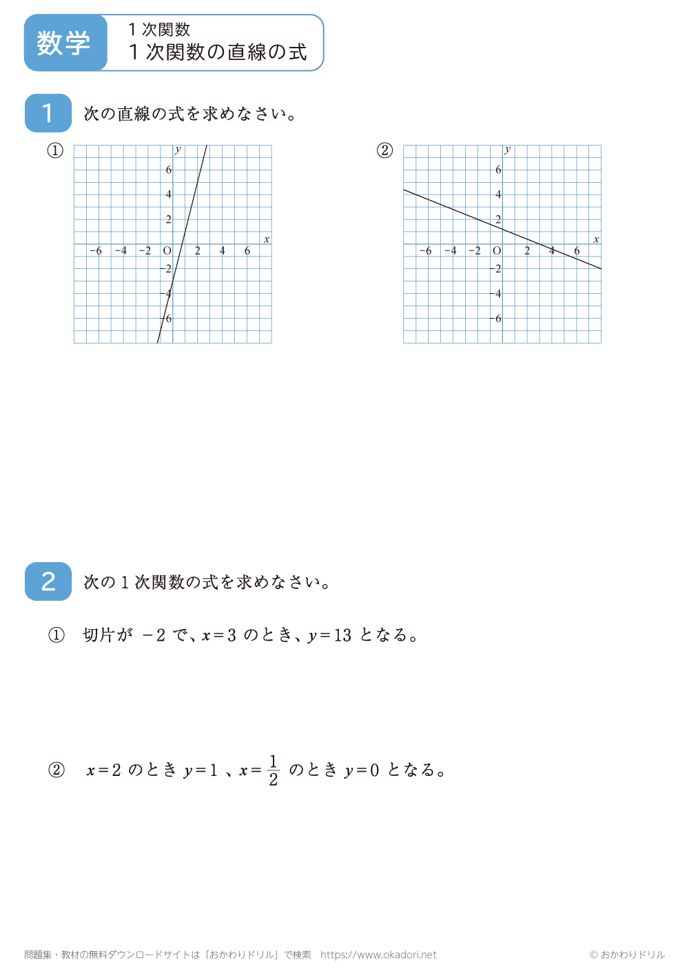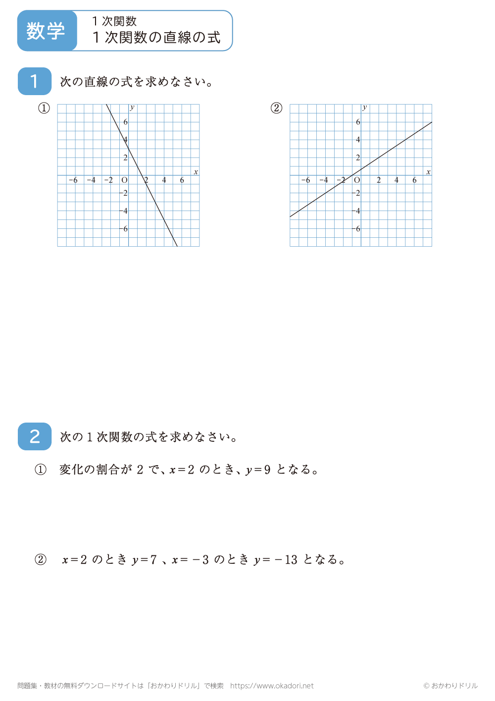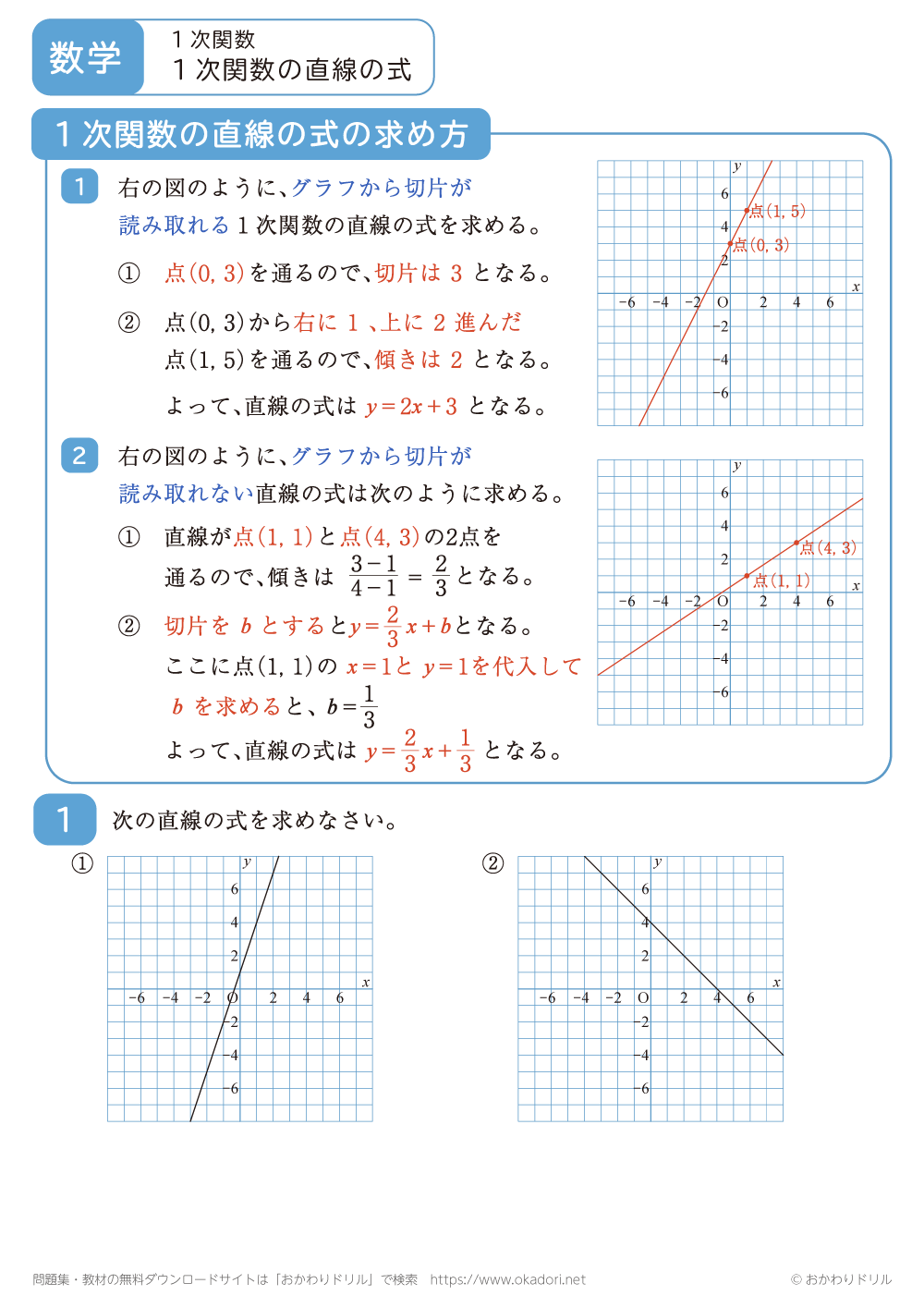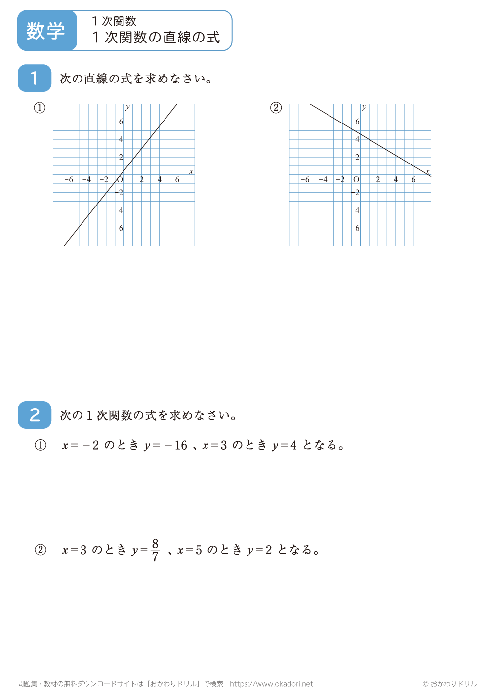 このページは、中学2年生で習う「1次関数の直線の式」が学習できるページです。