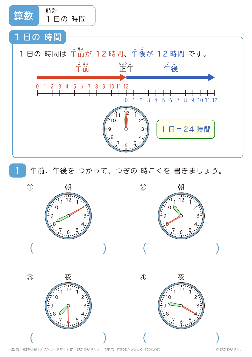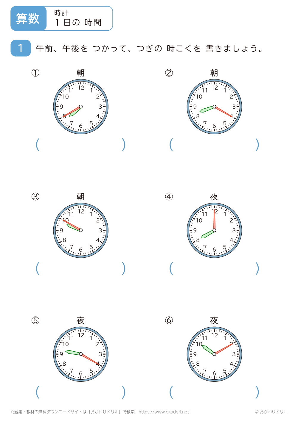1日の時間の問題です。午前や午後を使って時刻を考える問題を解いてみましょう。