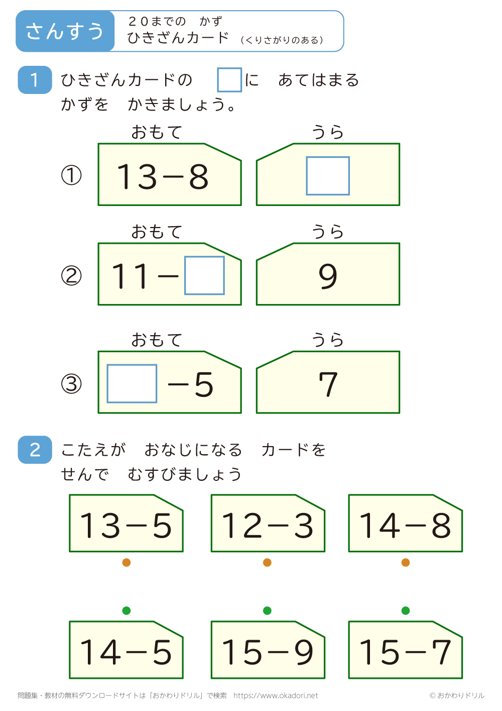 このページは、小学1年生で習う「20までの数の引き算(くり下がりのない)」が学習 ...