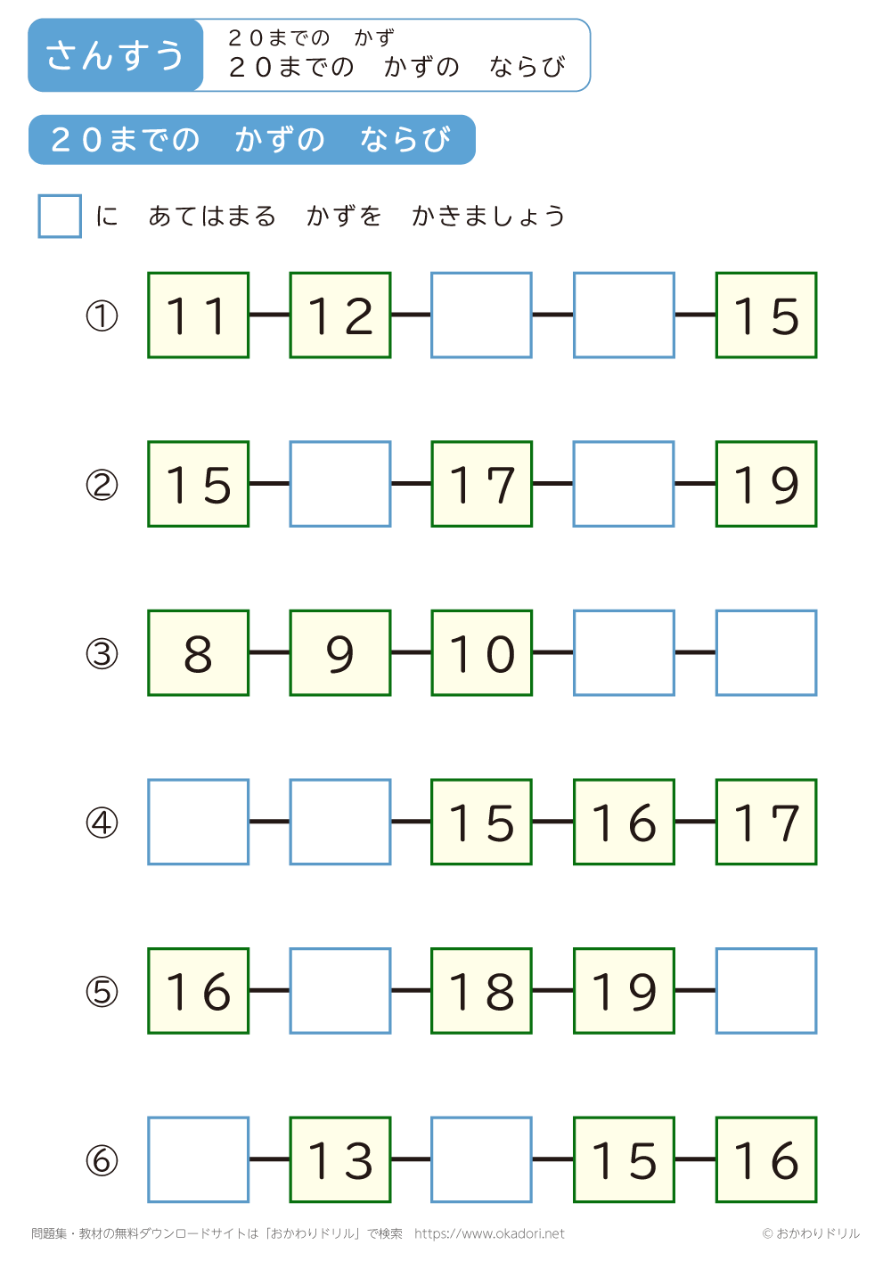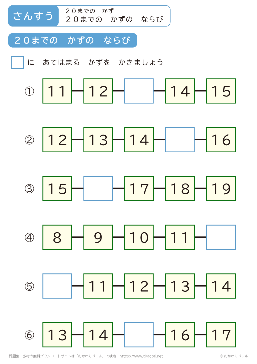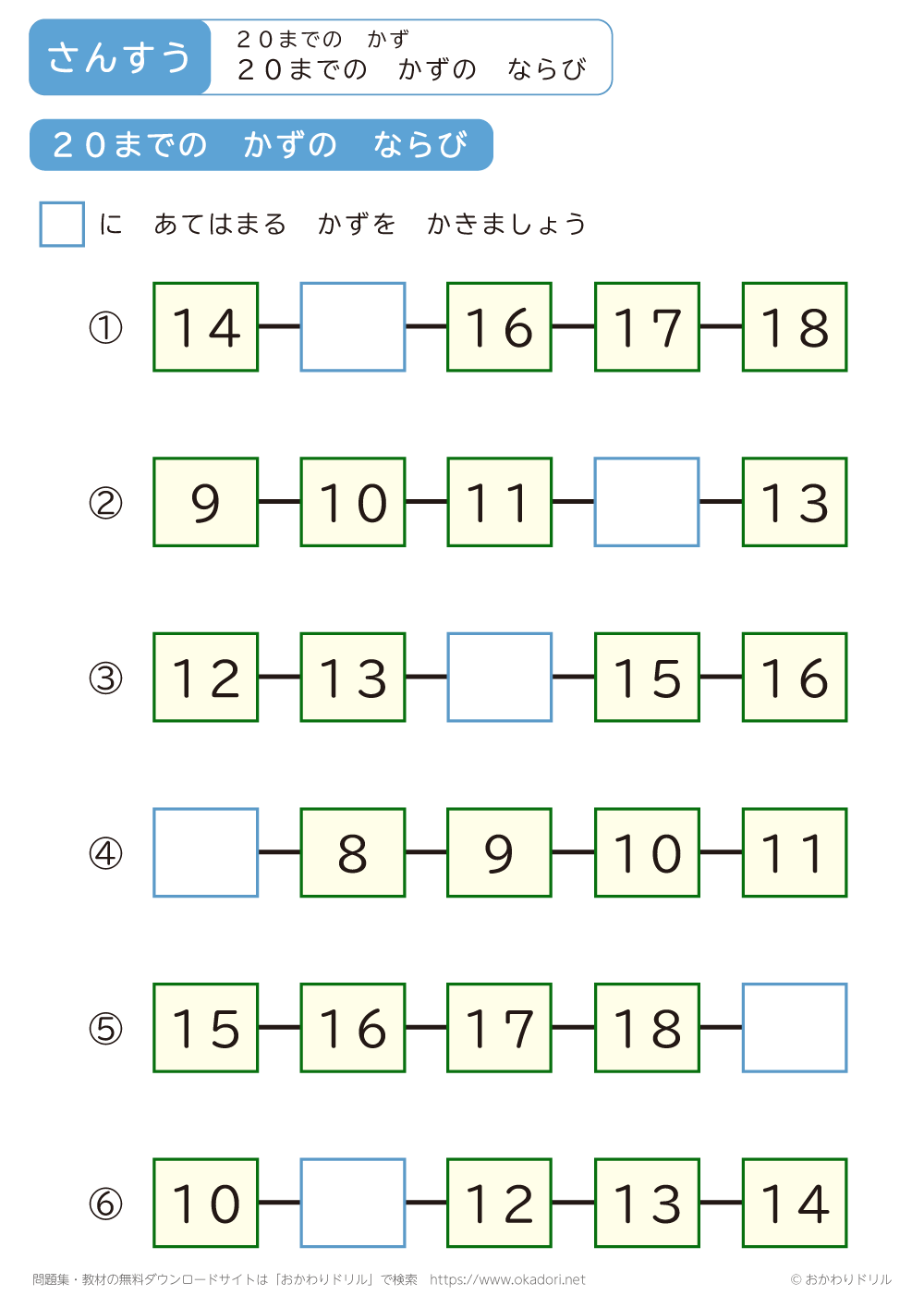 「20までの数のならび」の学習プリントはこちら