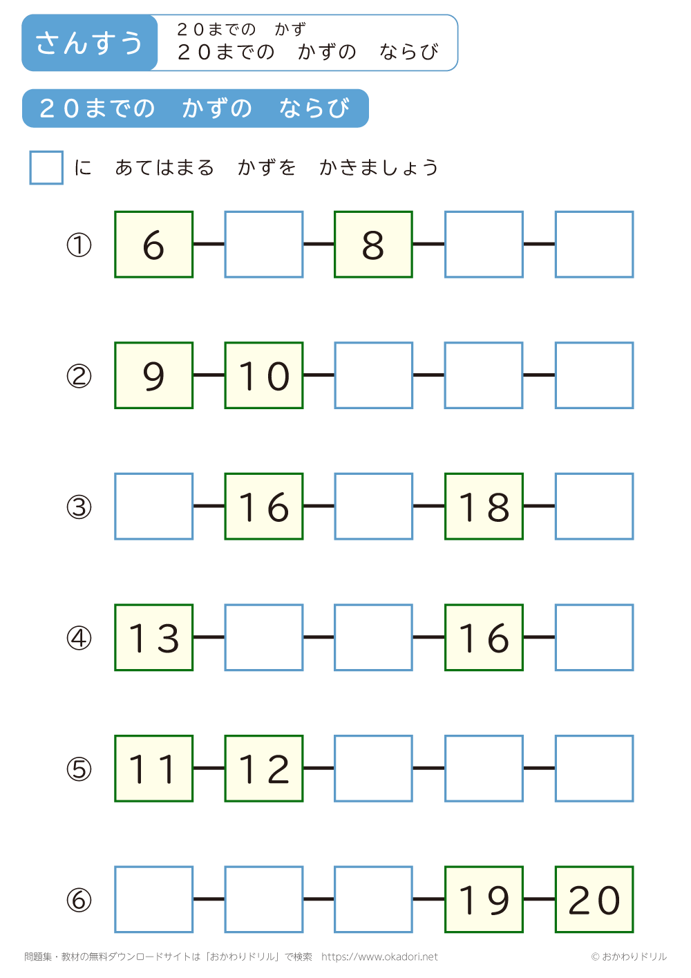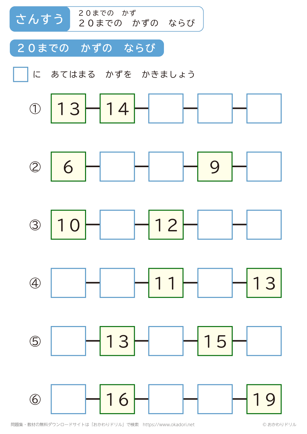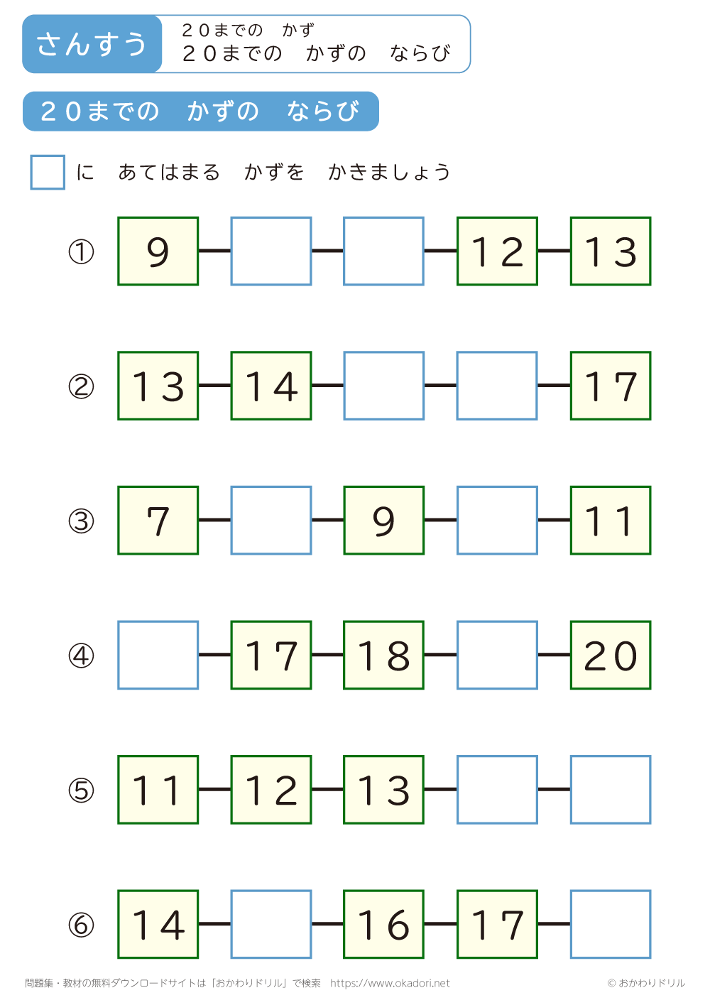 「20までの数のならび」の学習プリントはこちら