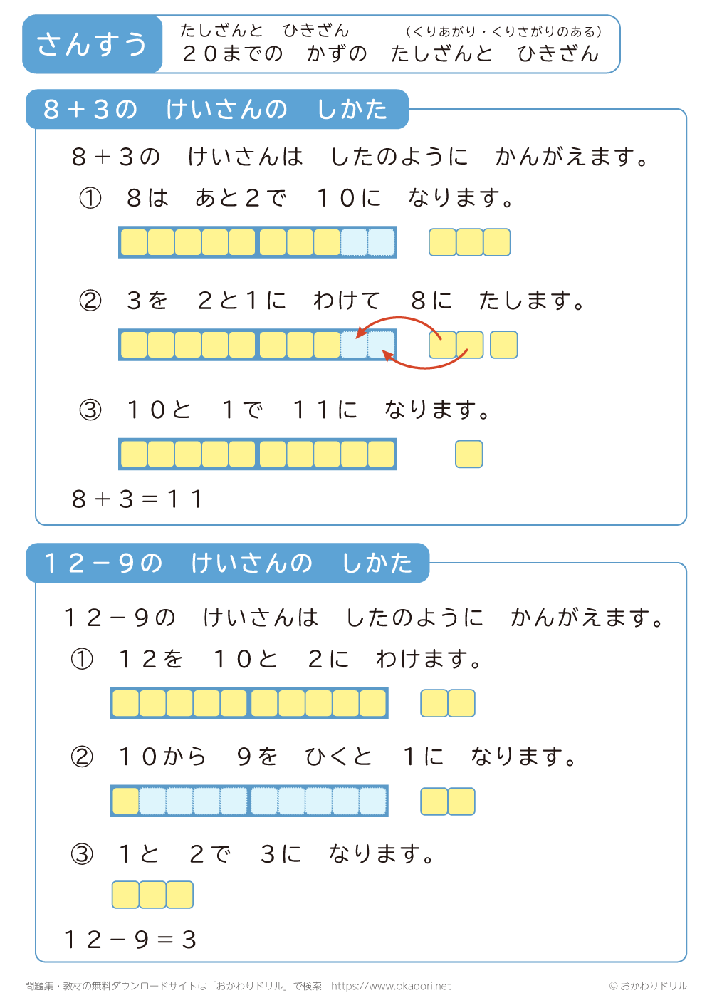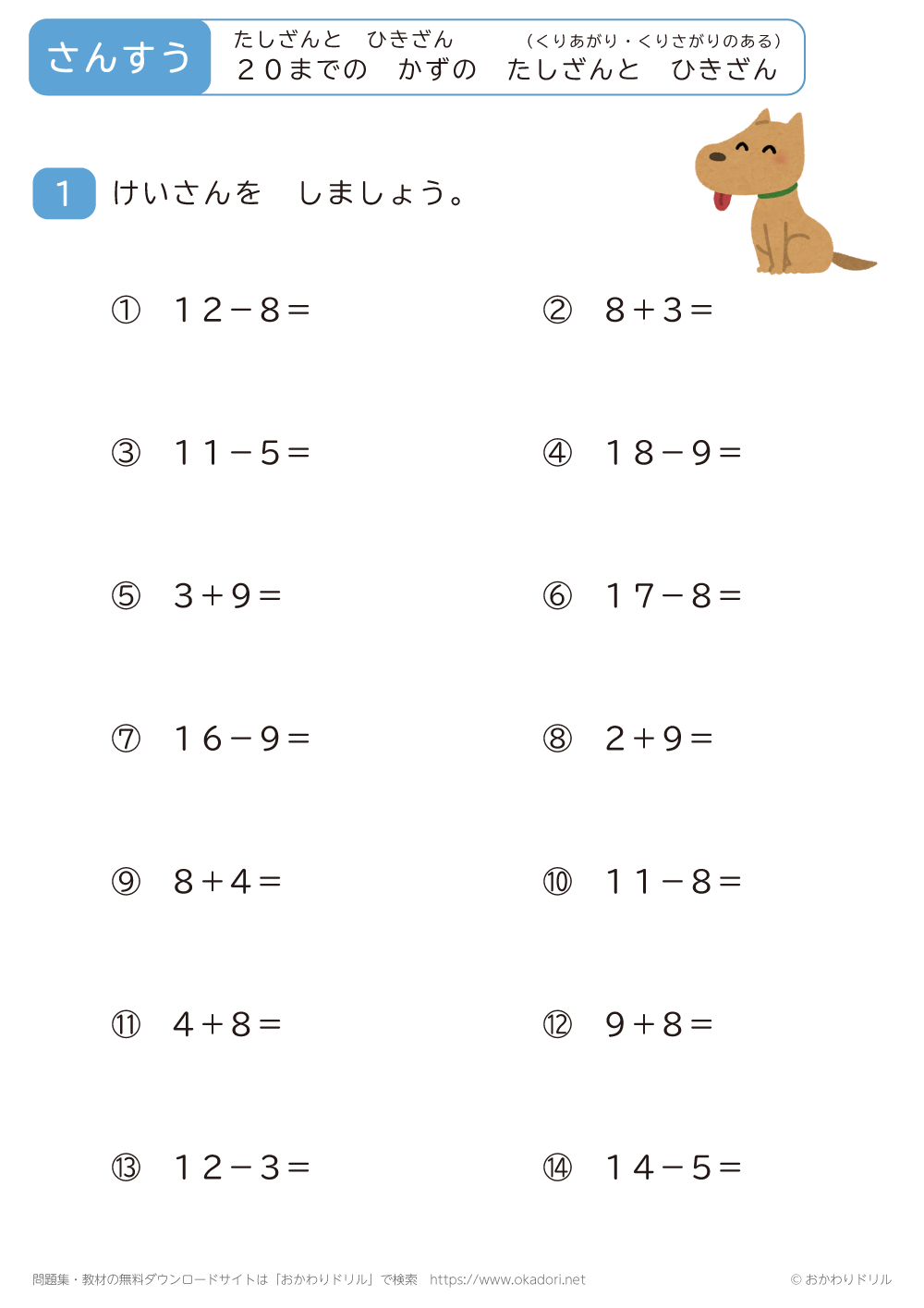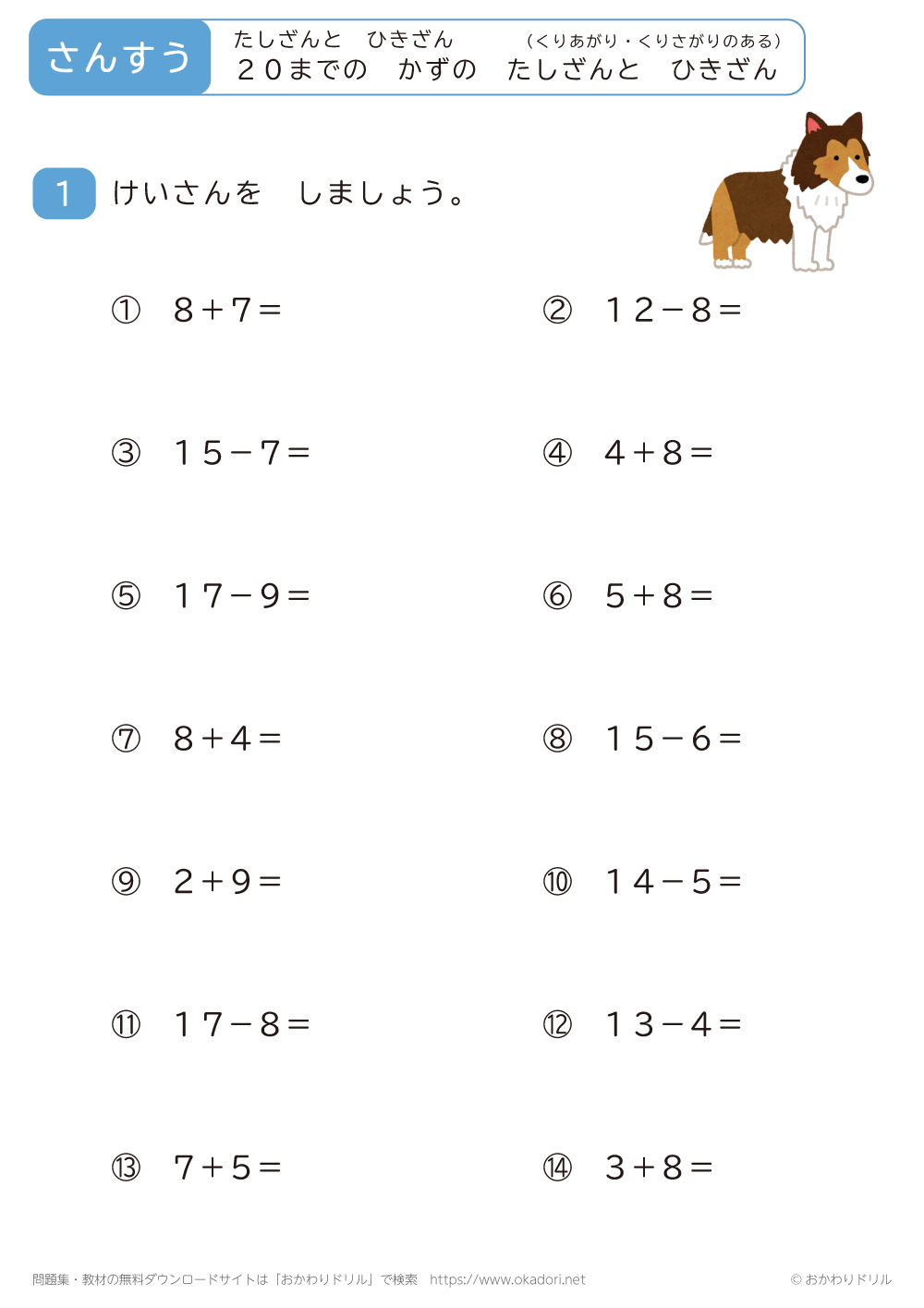 20までの数の足し算・引き算です。くり上がりのある足し算や、くり下がりのある引き算で、20までの数の計算をしてみましょう。