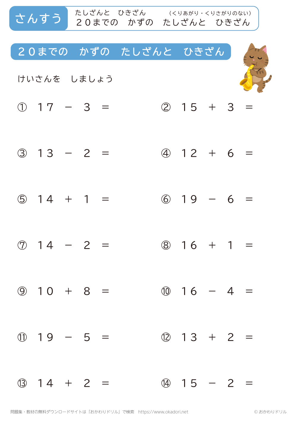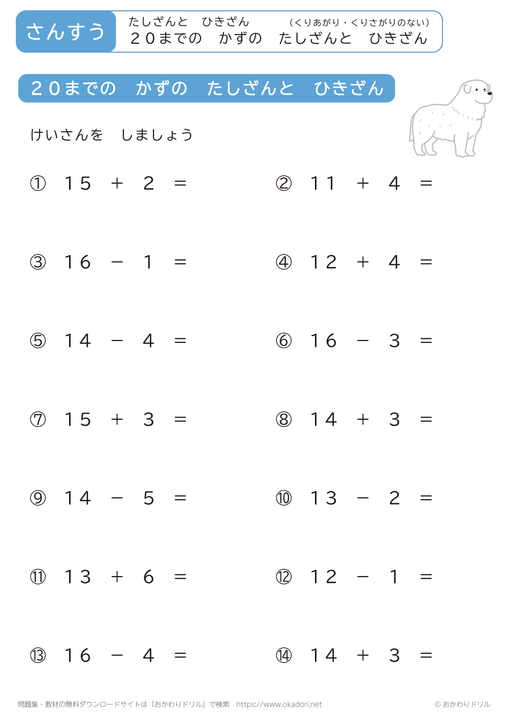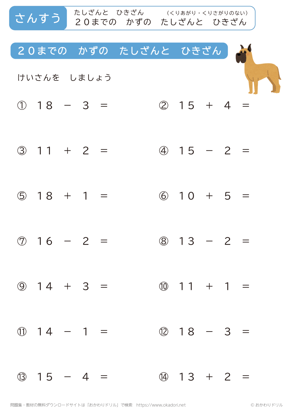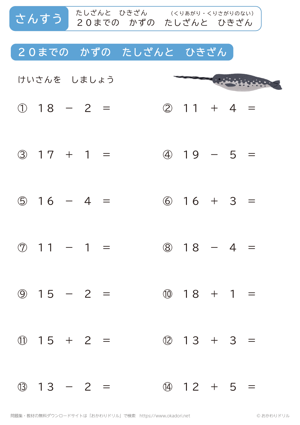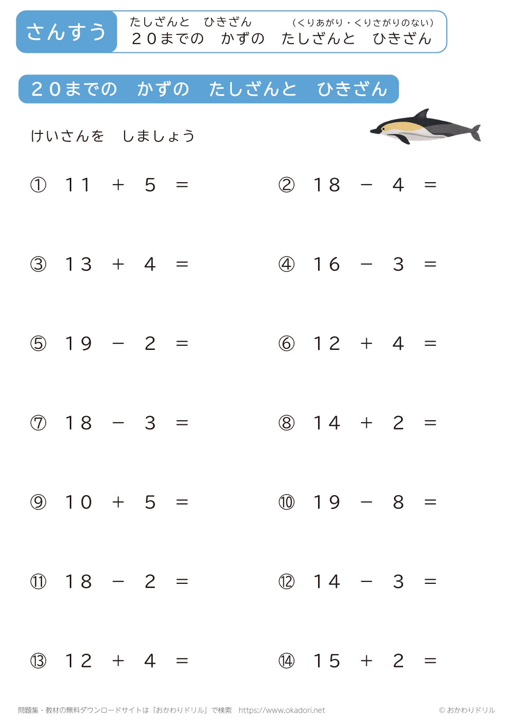 20までの数の足し算・引き算です。くり上がりのない足し算や、くり下がりのない引き算で、20までの数の計算をしてみましょう。