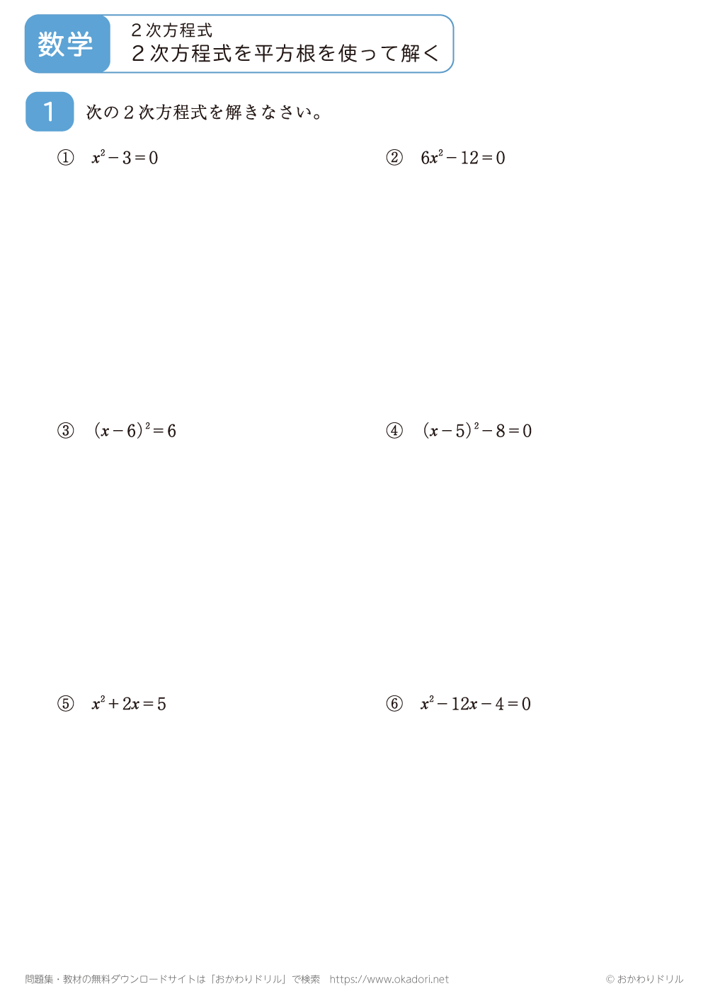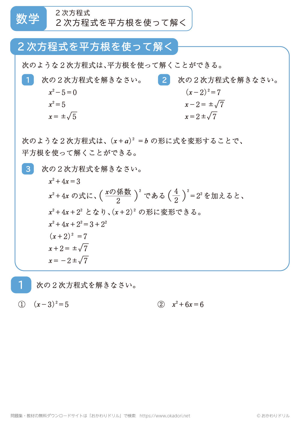 2次方程式を平方根を使って解く問題です。いろいろな2次方程式を平方根を使って解いてみましょう。