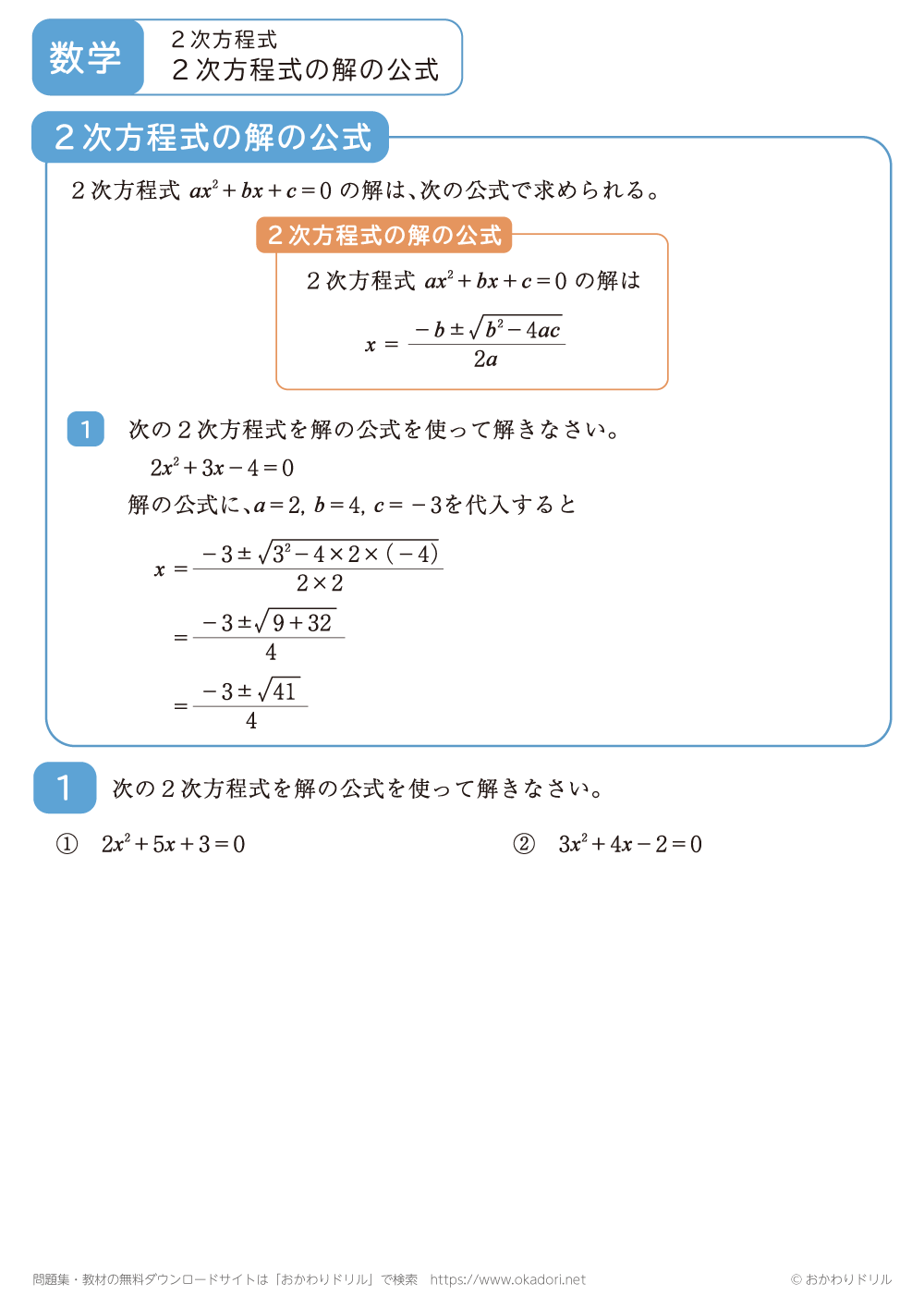 このページは、中学3年生で習う「2次方程式の解の公式」が学習できるページです。
