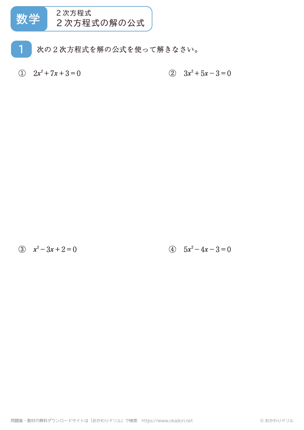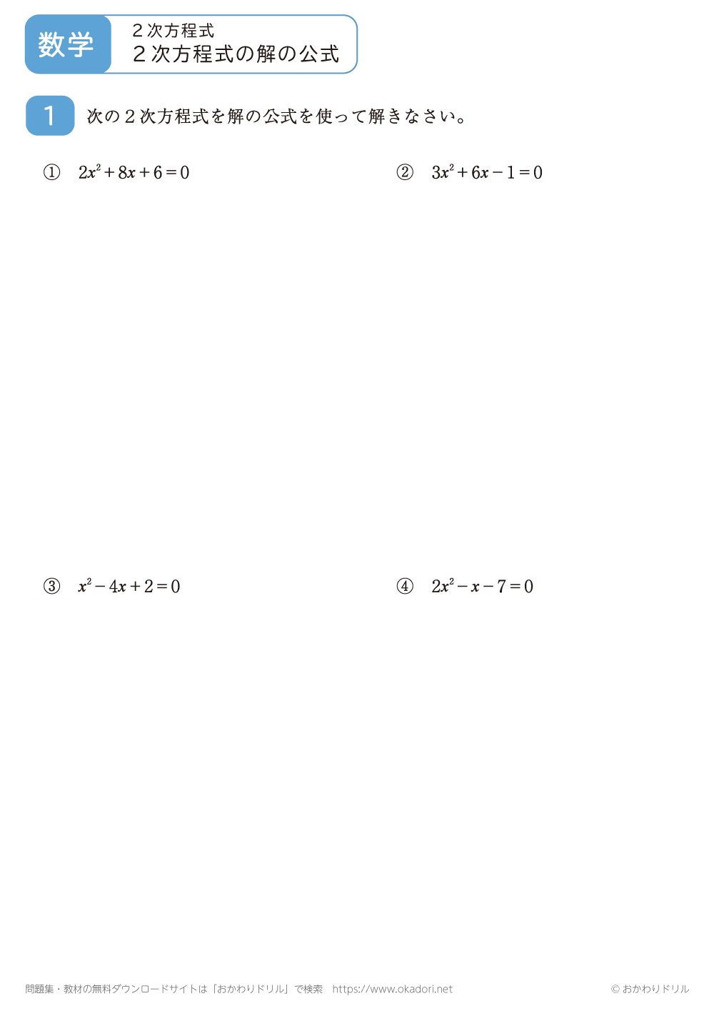 2次方程式の解の公式を使う問題です。いろいろな2次方程式を解の公式を使って解いてみましょう。