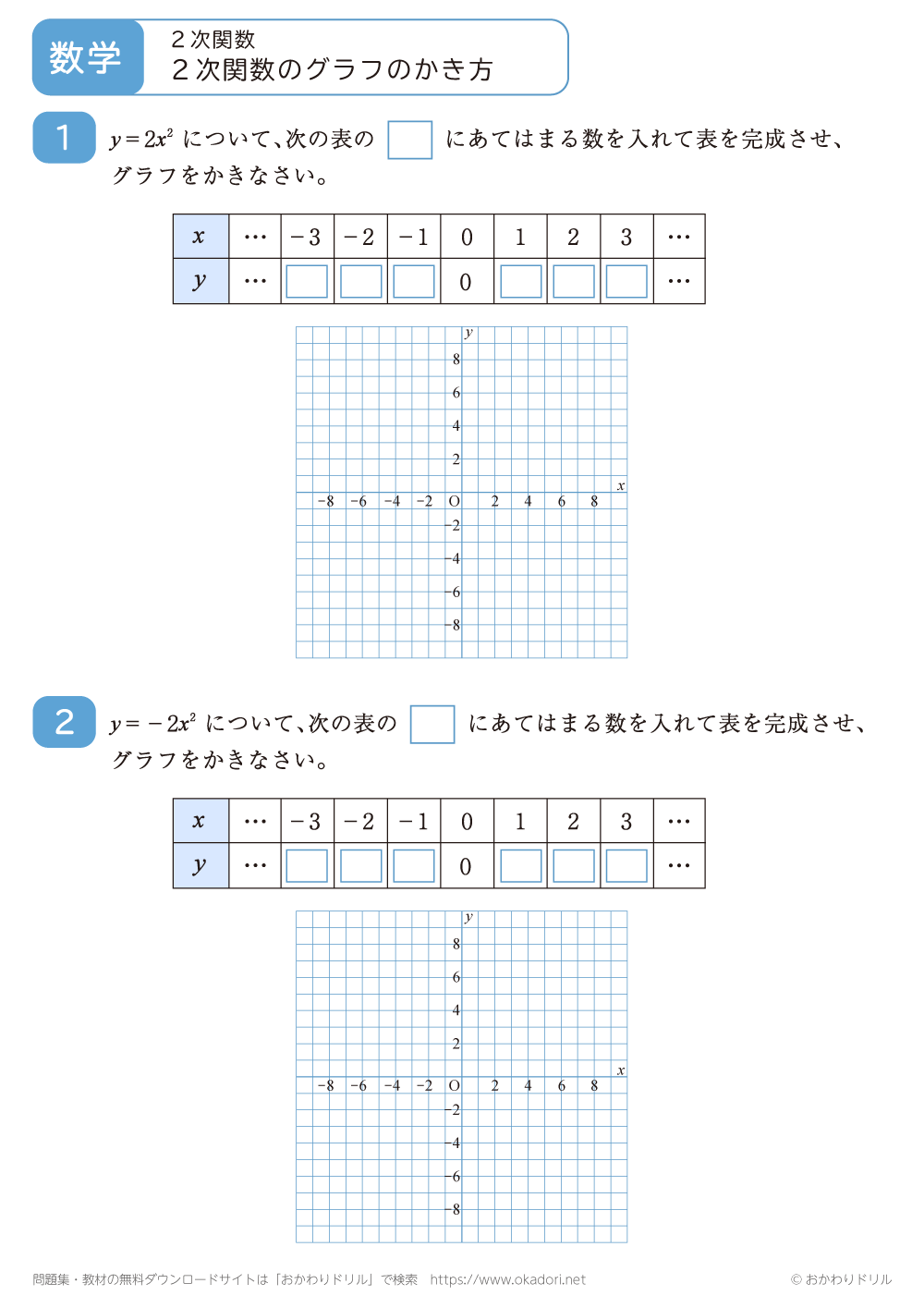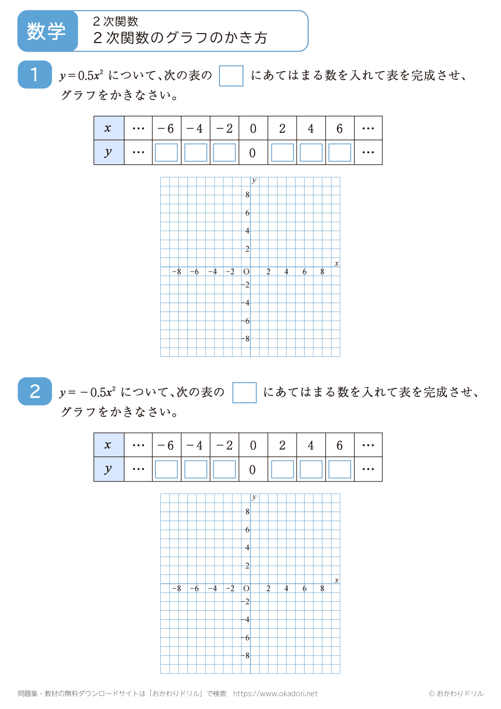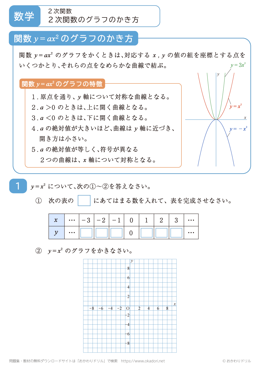 2次関数のグラフをかく問題です。関数y=ax2のaの値がいろいろなときに、どのようなグラフになるか考えながら問題を解いてみましょう。