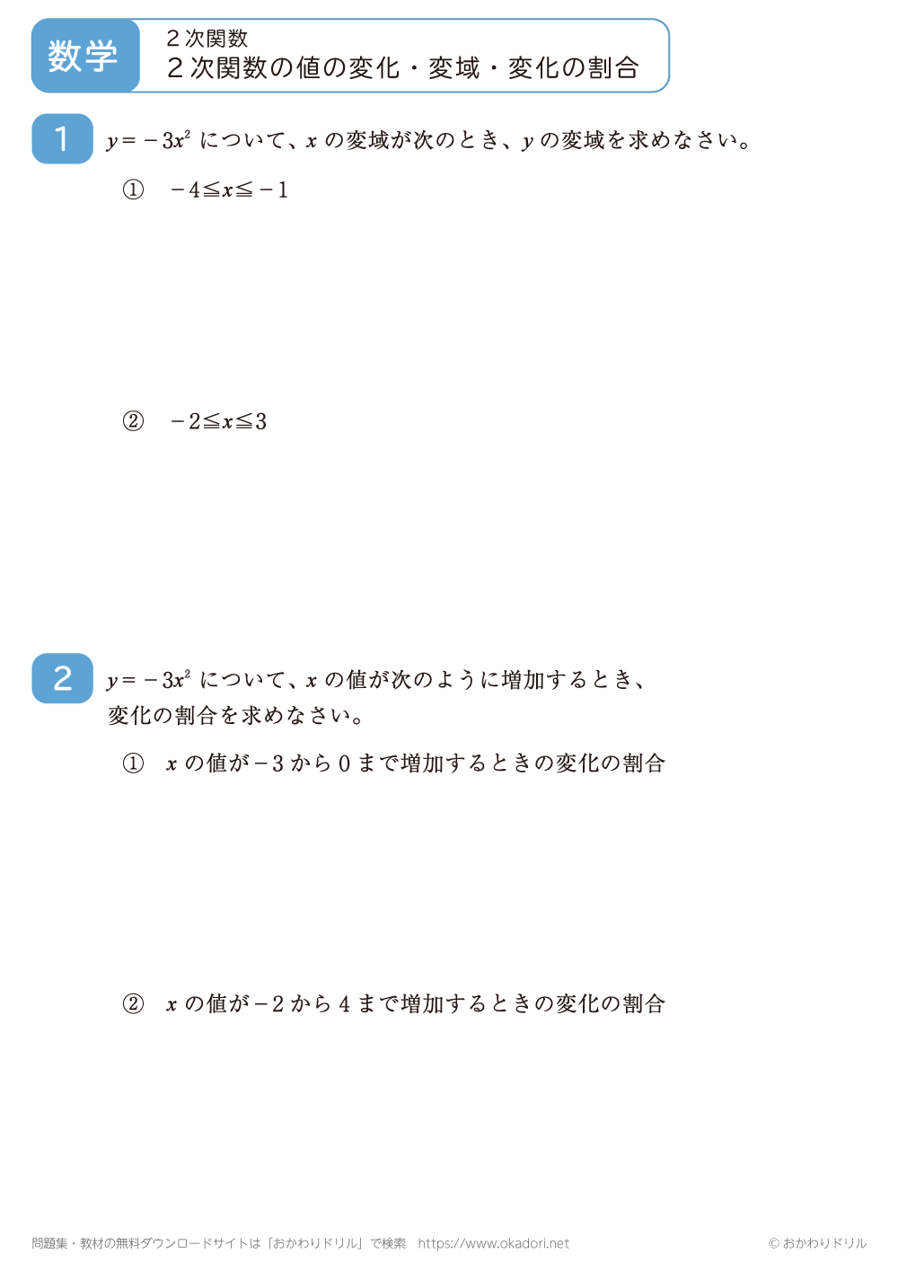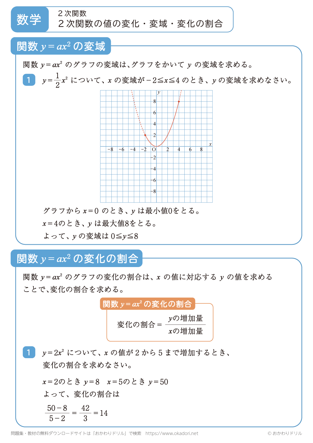 このページは、中学3年生で習う「2次関数の値の変化・変域・変化の割合」が学習できるページです。