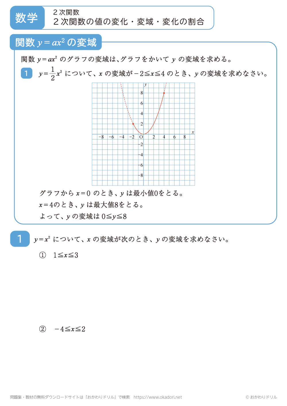 ・関数y=ax2の変域を求めるときは、グラフをかいてyの変域を求めます。
