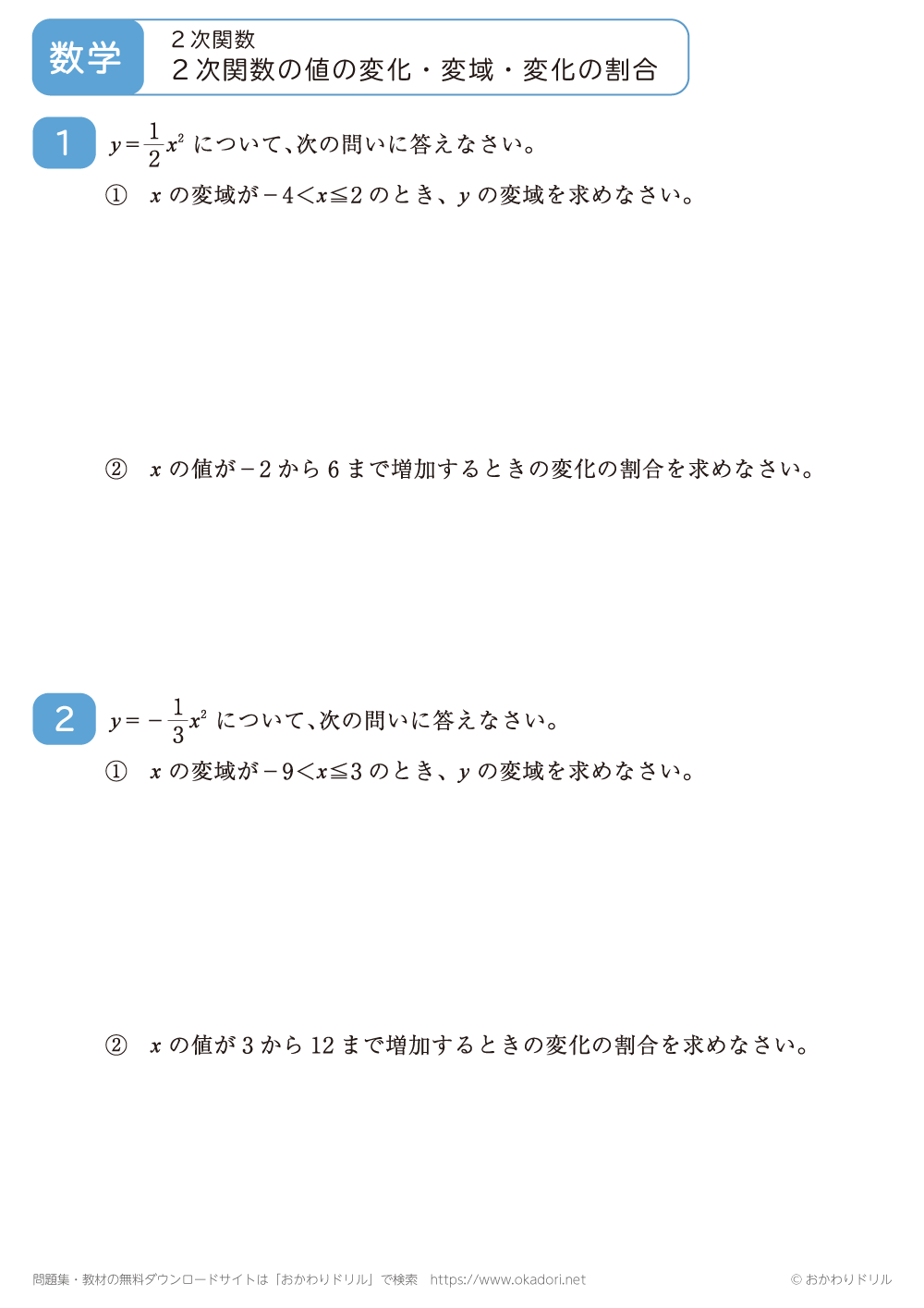 2次関数の値の変化、変域、変化の割合の問題を解いてみよう!