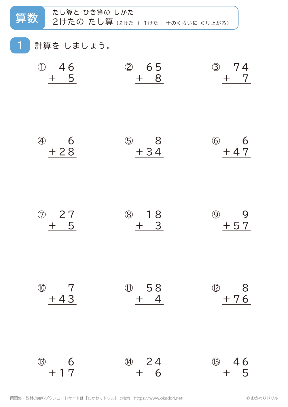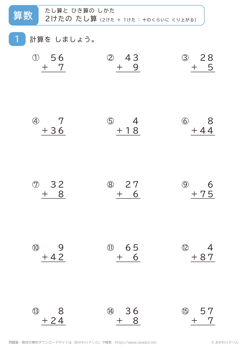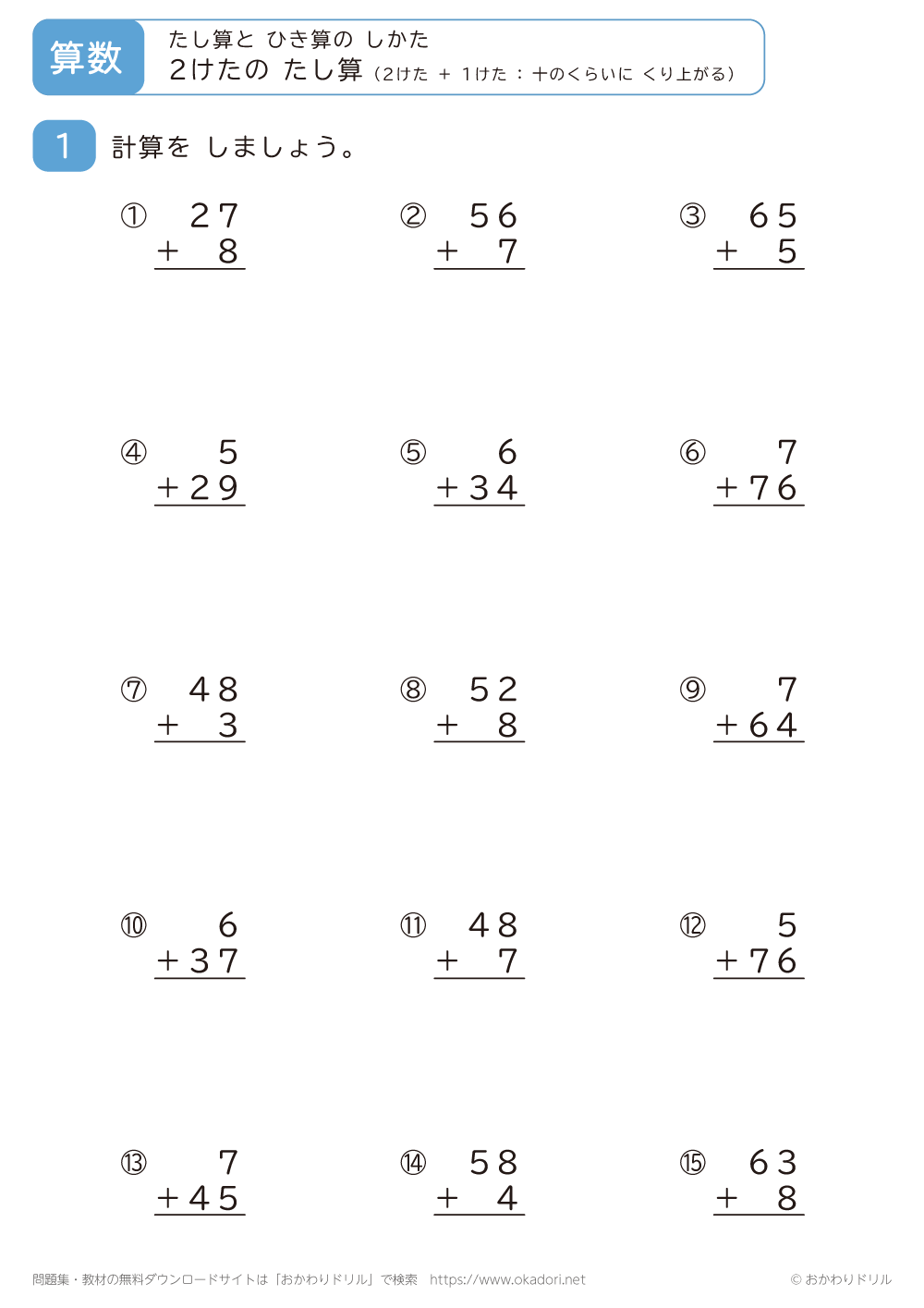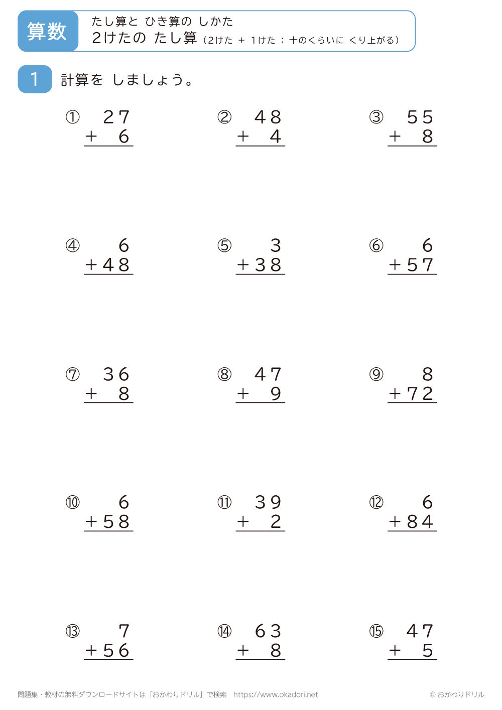 このページは、小学2年生で習う「2桁+1桁の足し算の筆算(十の位にくり上がる)」 ...