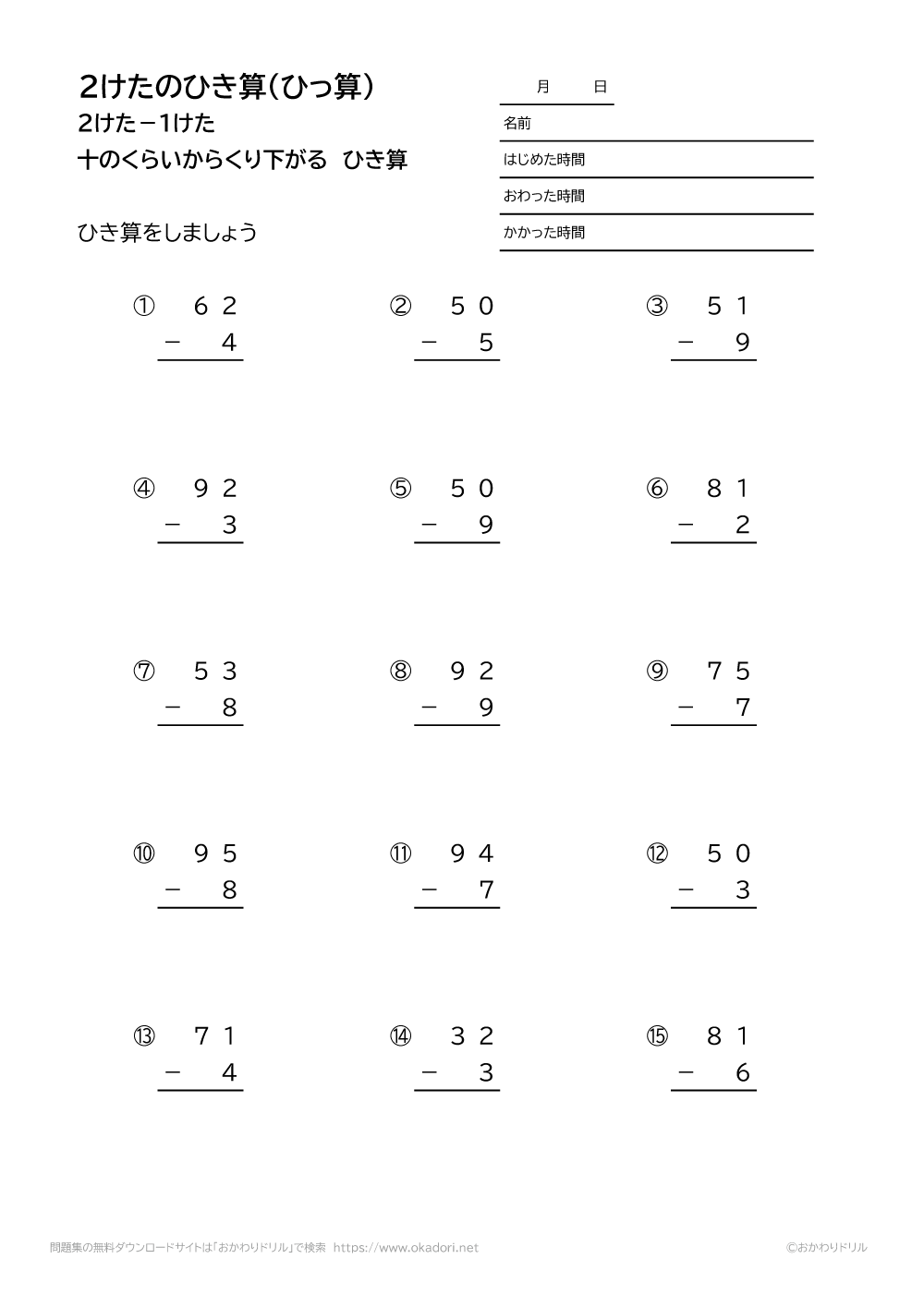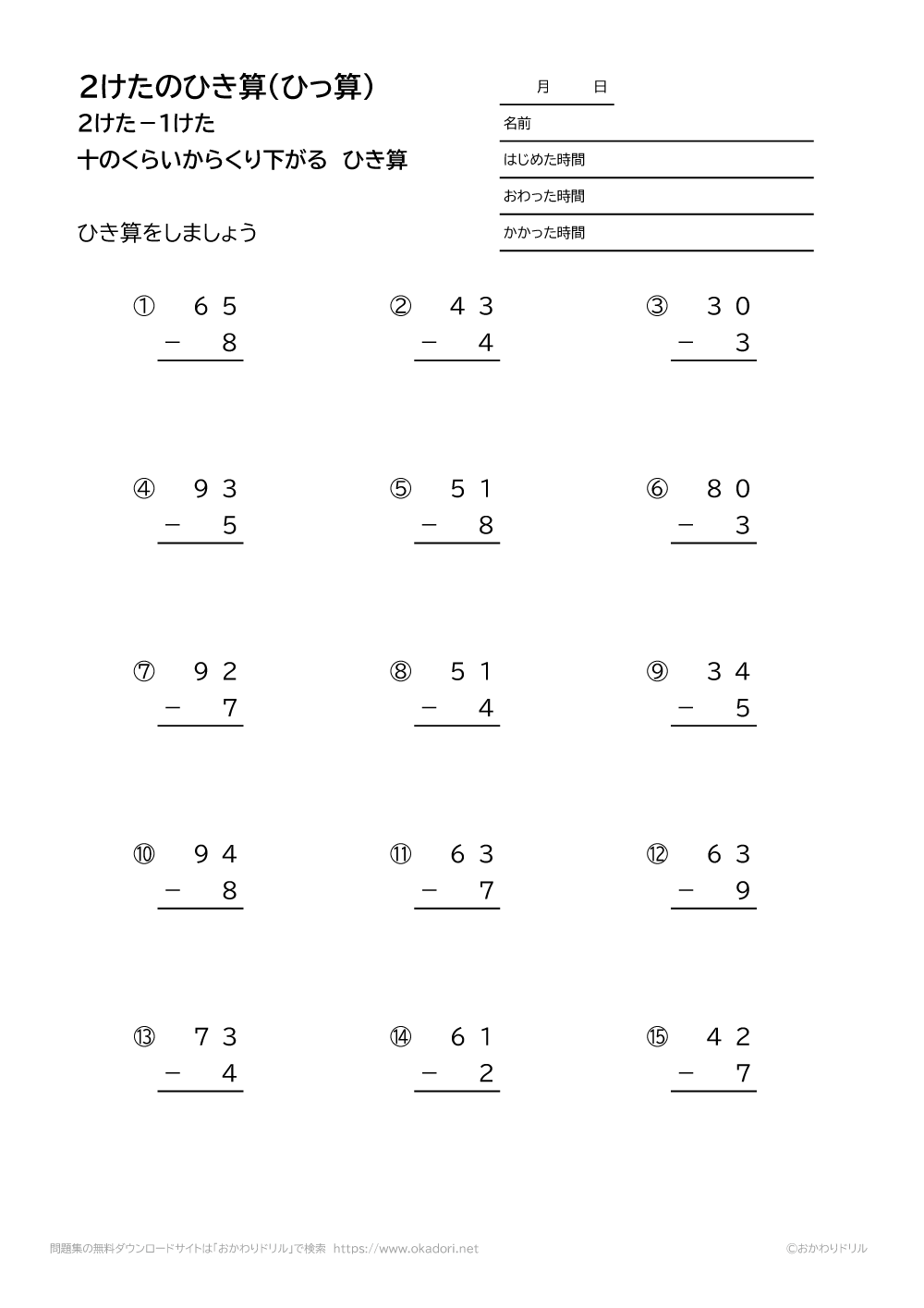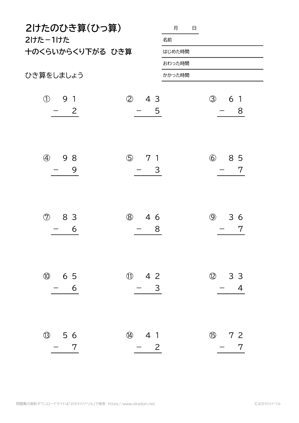 このページは、小学2年生で習う「2桁-2桁の引き算の筆算(十の位からくり下がる) ...