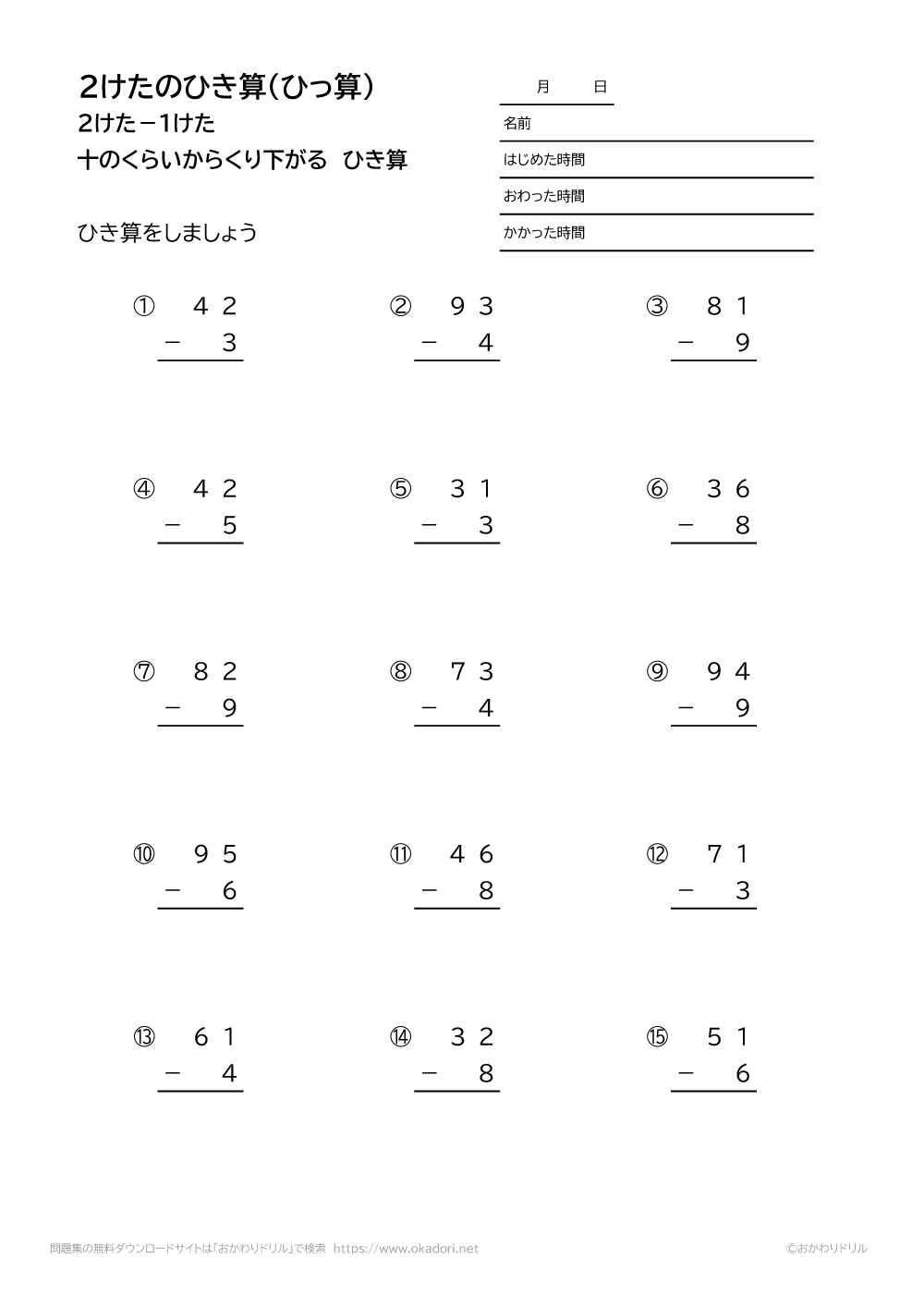 このページは、小学2年生で習う「2桁-1桁の引き算の筆算(十の位からくり下がる) ...