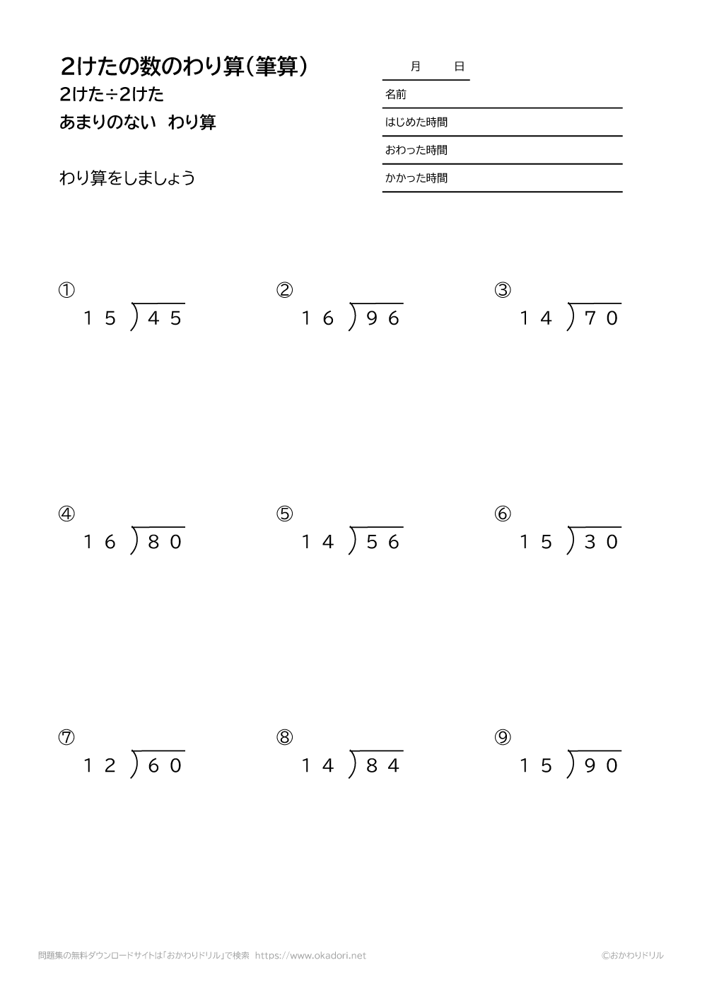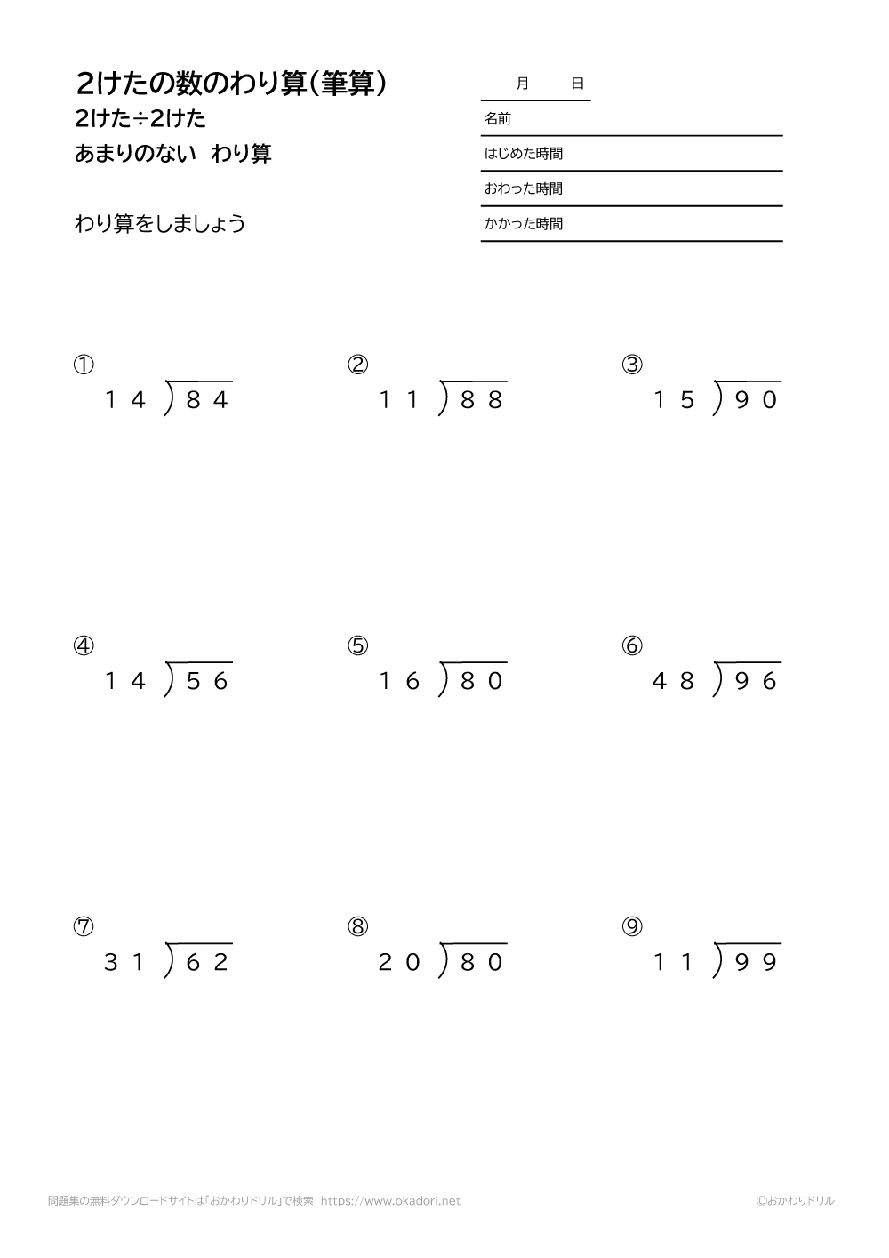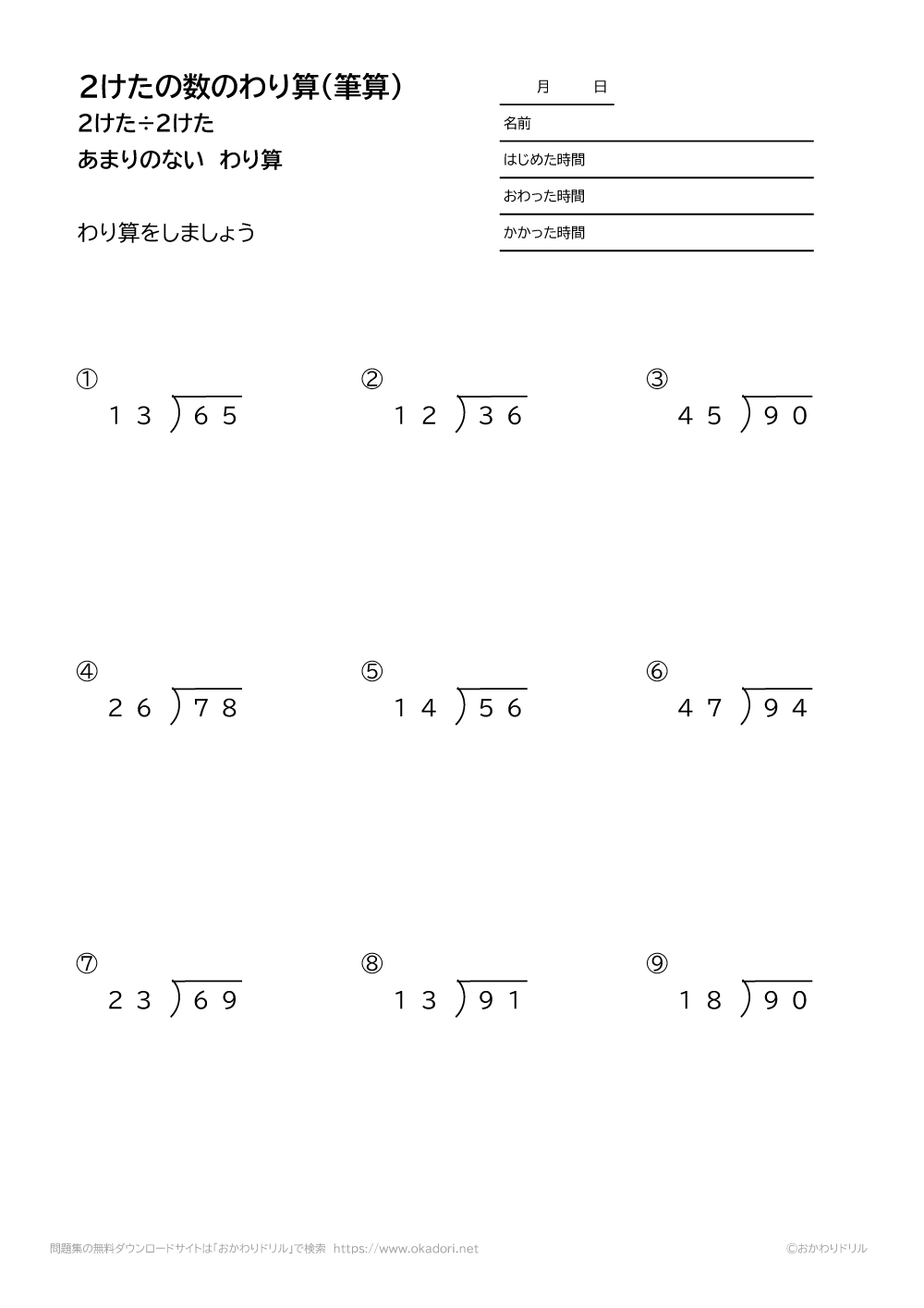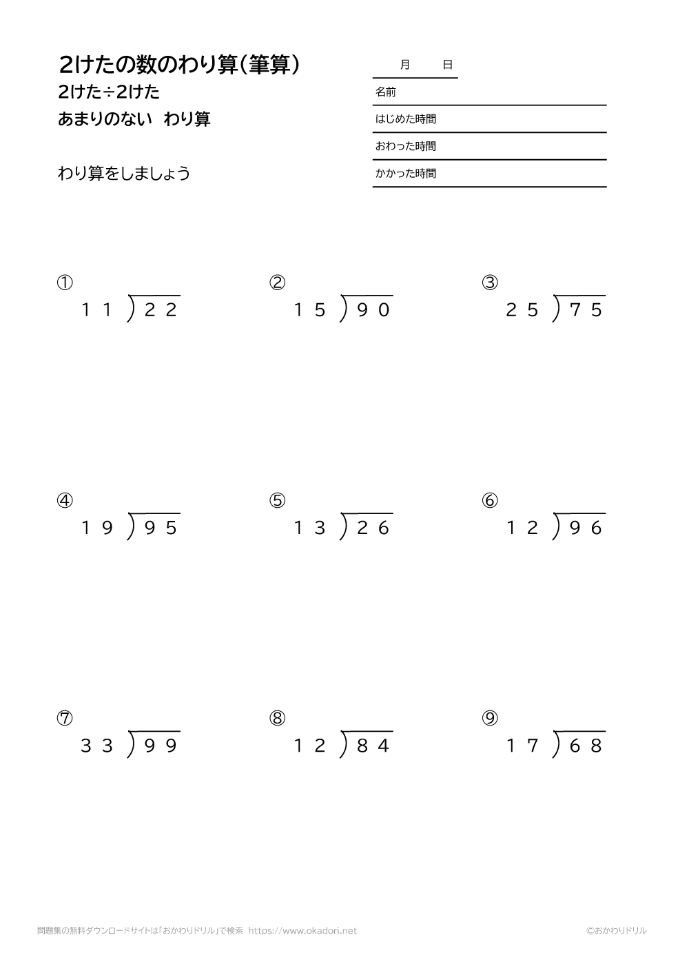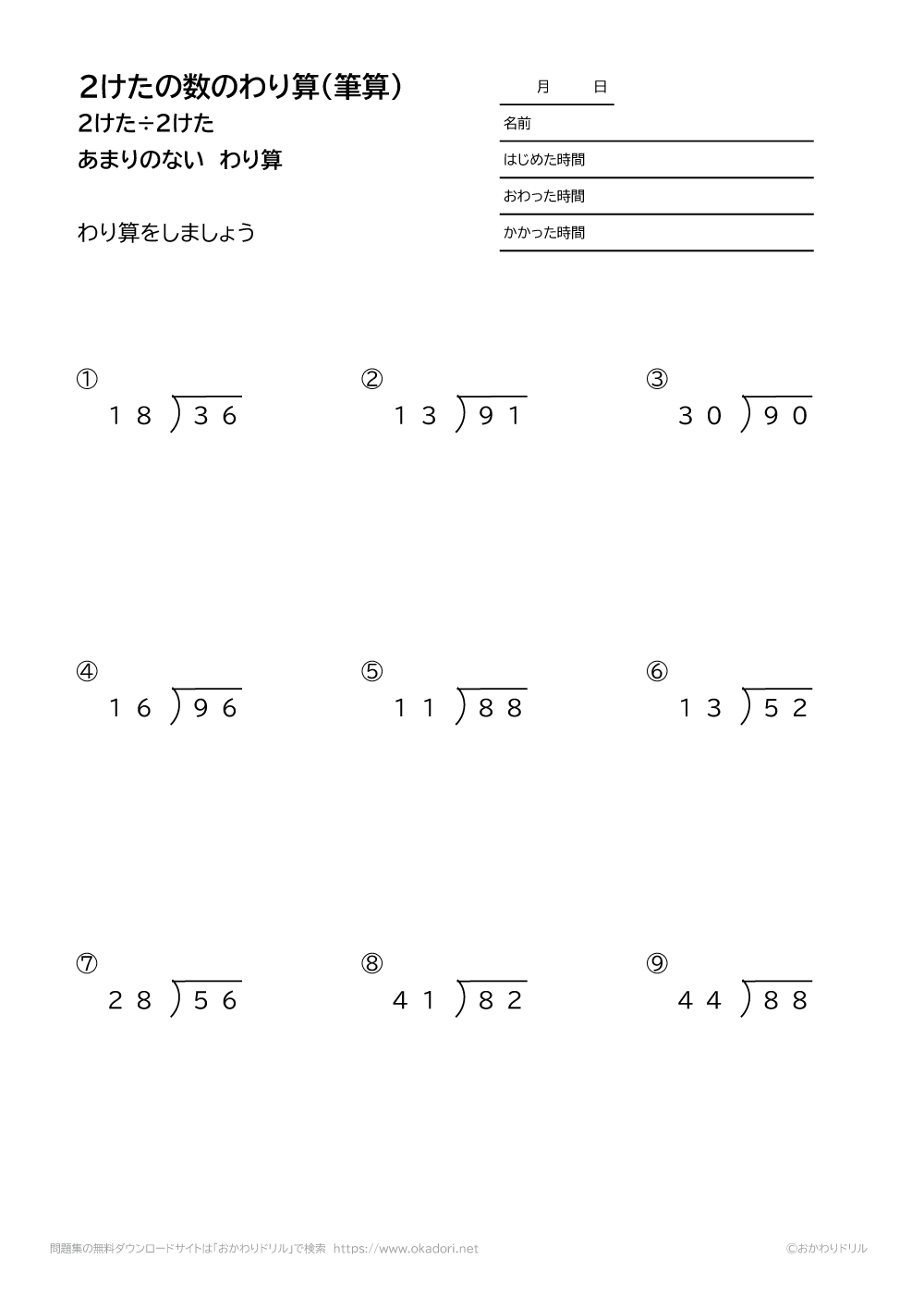 このページは、小学4年生が割り算の筆算を学習するための「2桁÷2桁の余りの無い割り算」が学習できるページです。