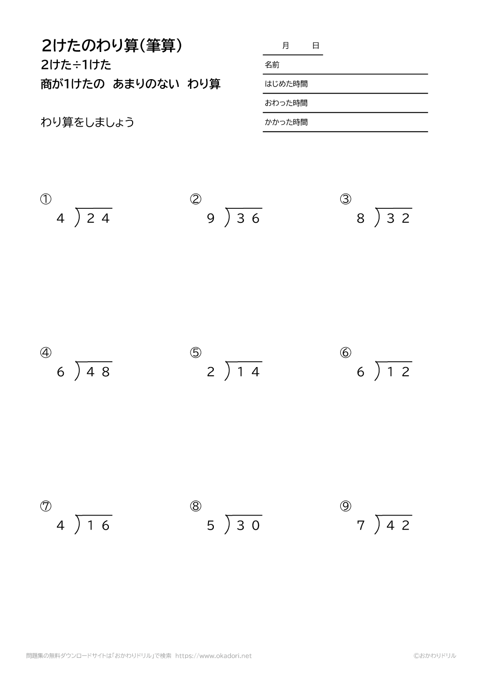 - 2桁÷1桁の商が1桁になる割り算の筆算