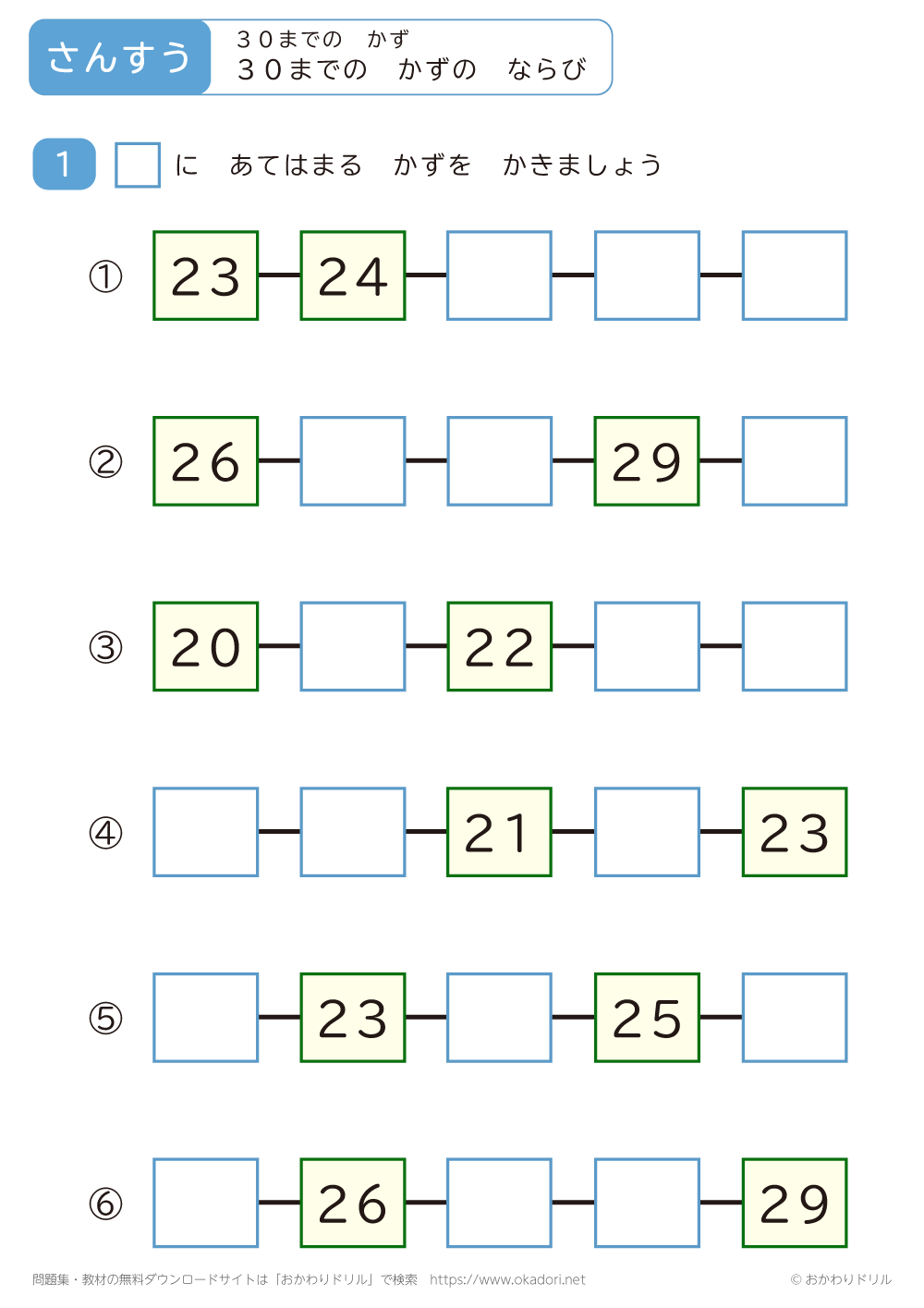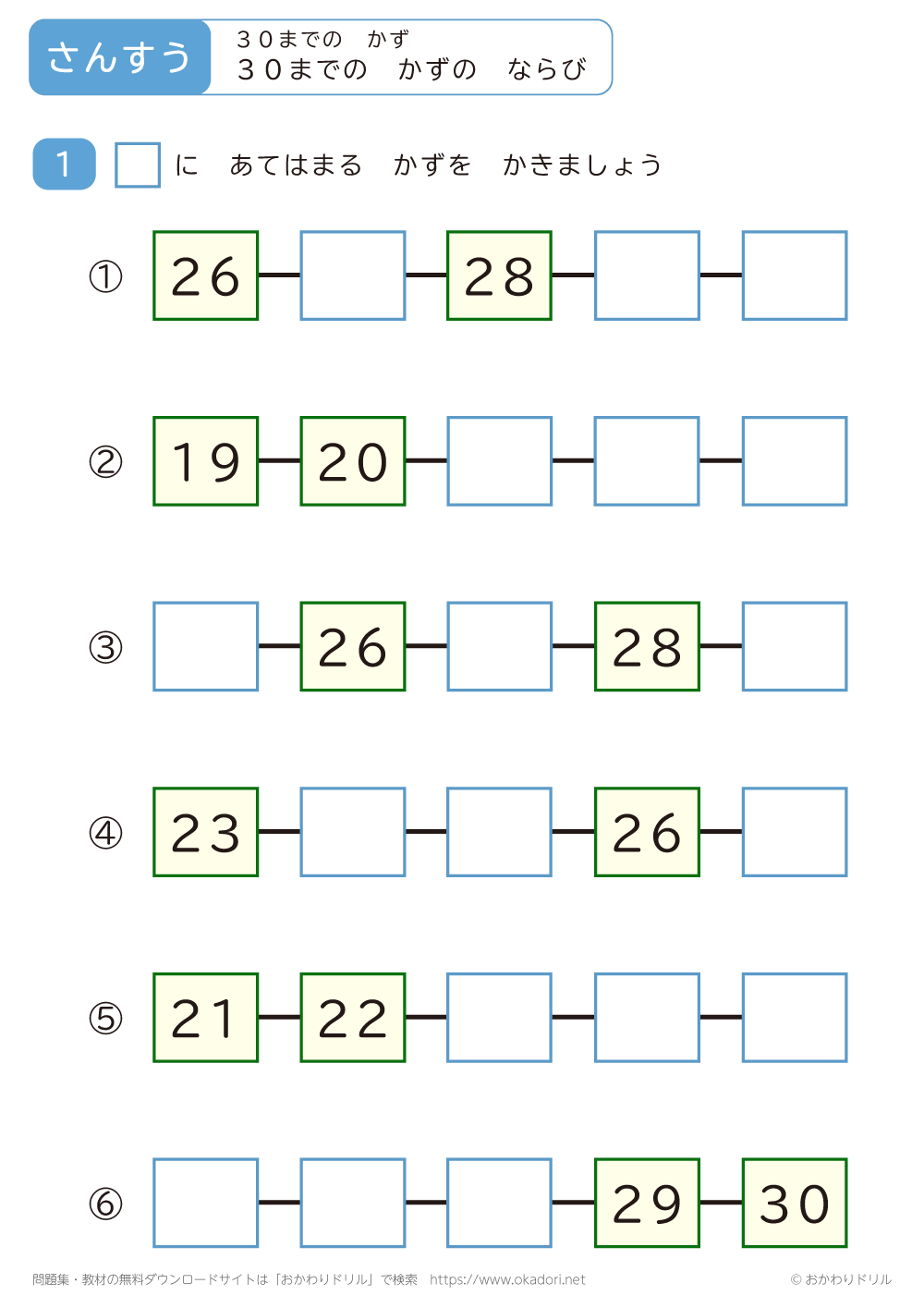 30までの数のならびの問題です。30までの数の順番を考えてみましょう。