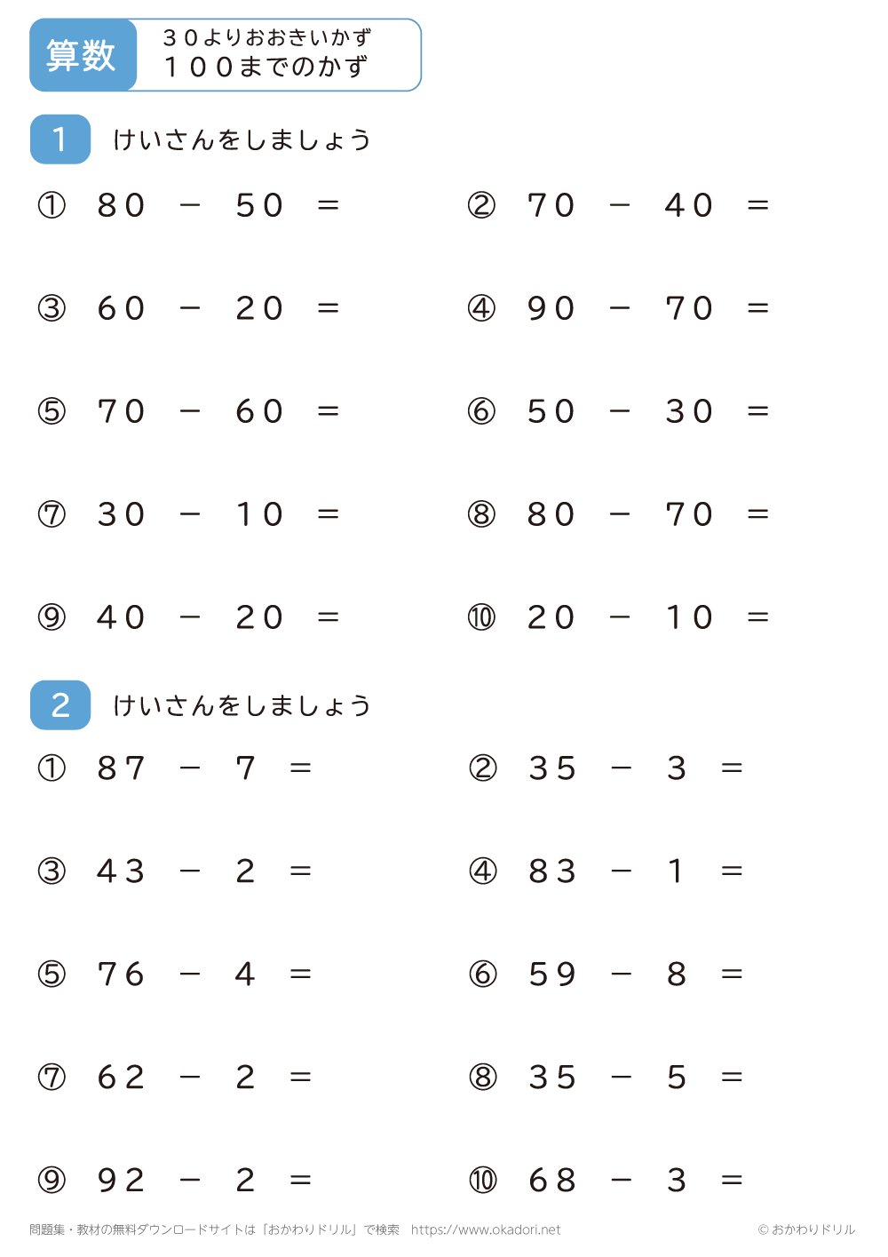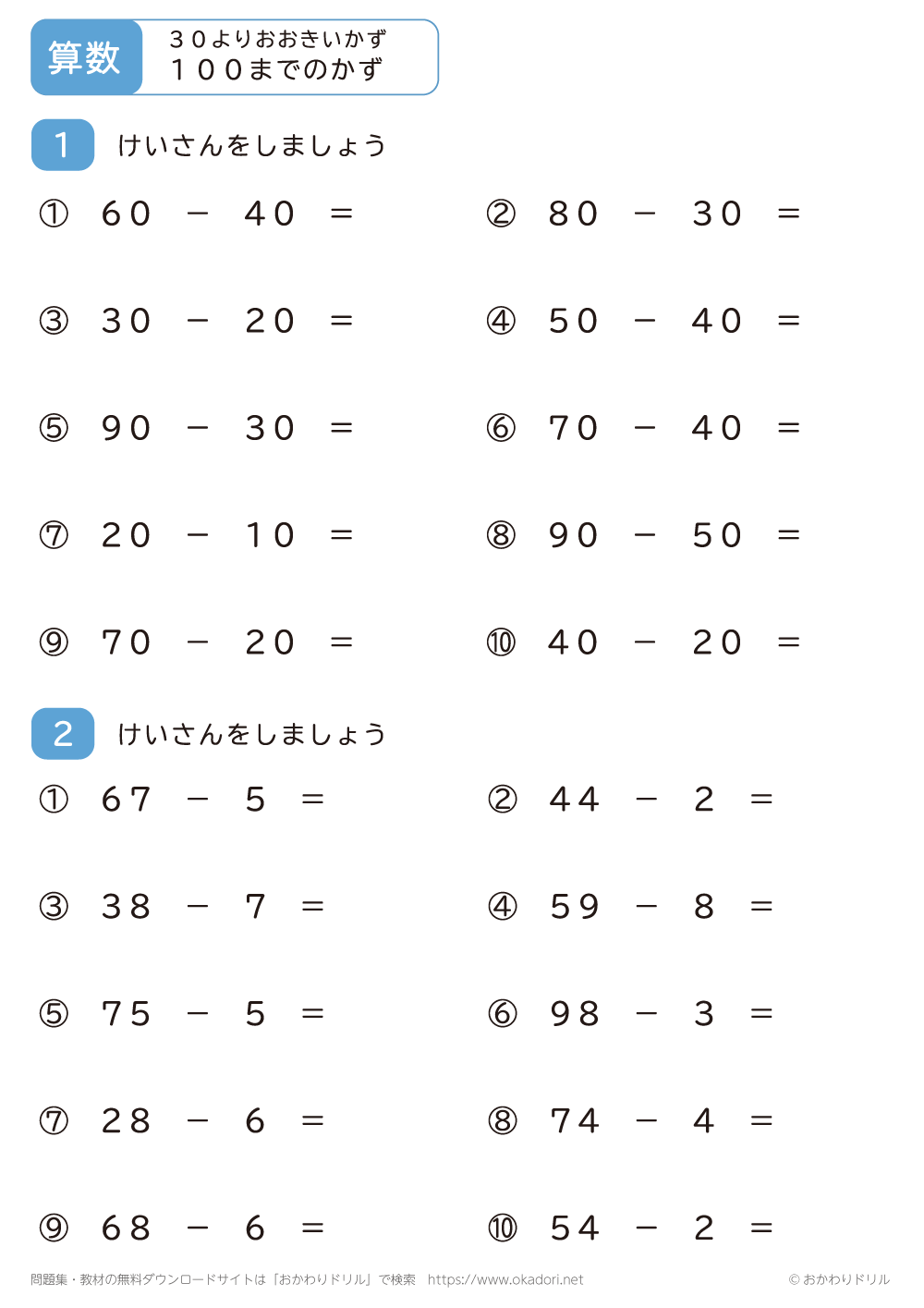 このページは、小学1年生で習う「30より大きい数の引き算」が学習できるページです。