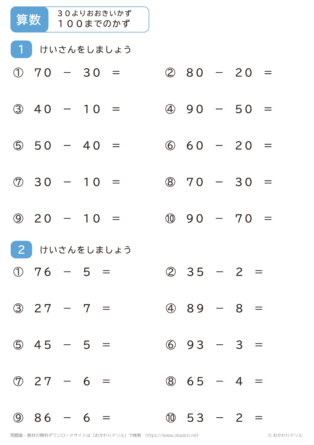 30より大きい数の引き算です。大きな数の引き算を計算してみましょう。
