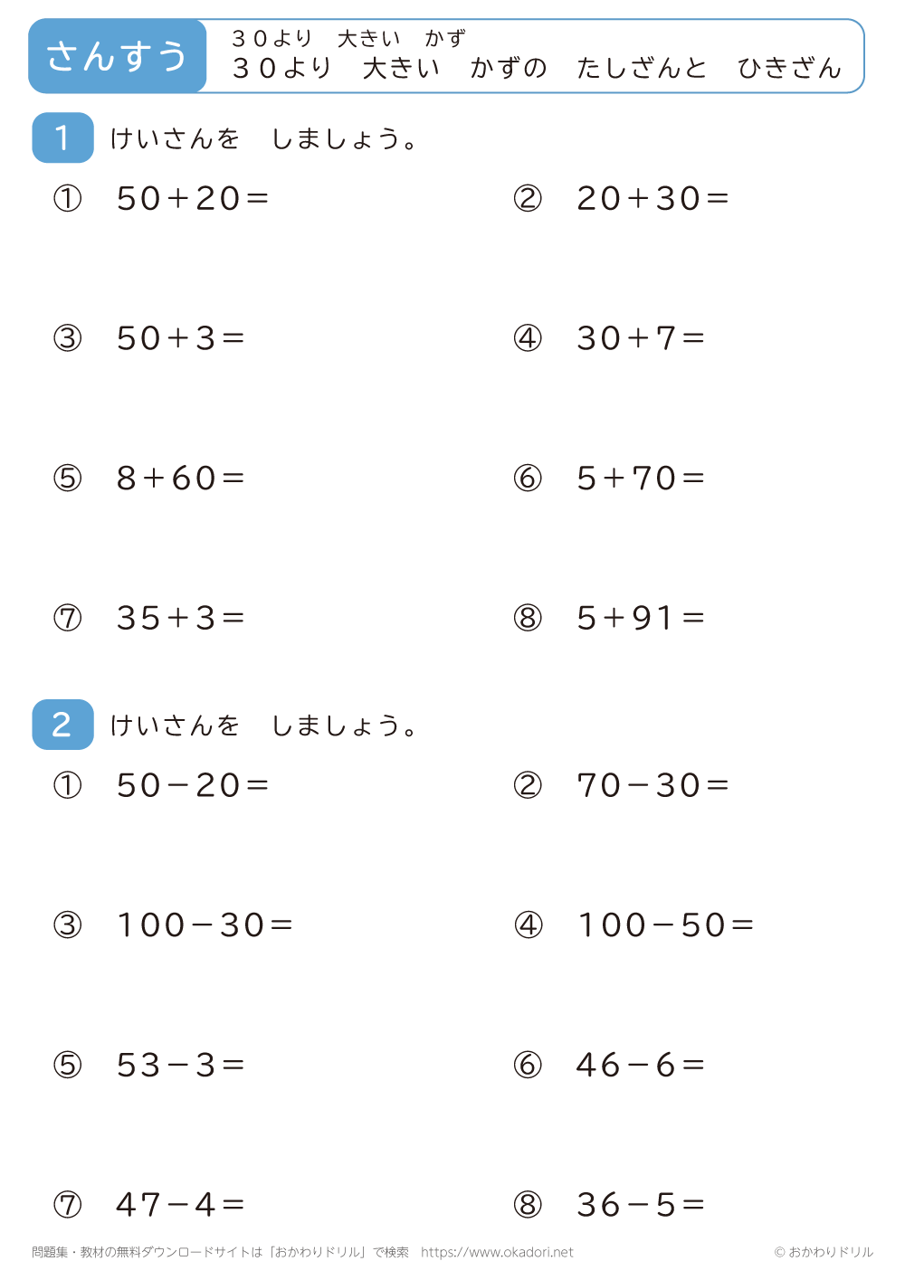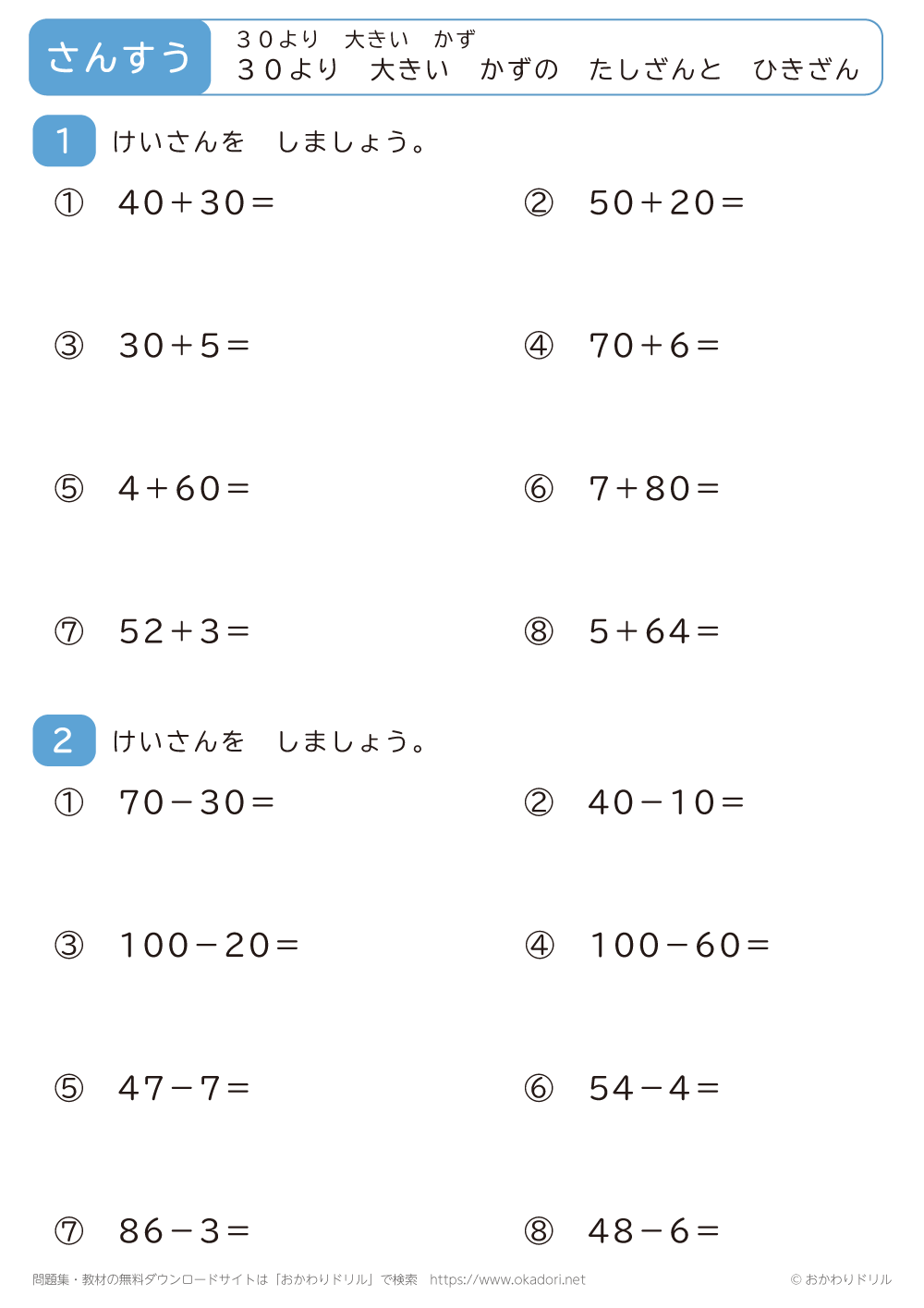 30より大きい数の足し算・引き算です。大きな数の足し算や引き算を計算してみましょう。