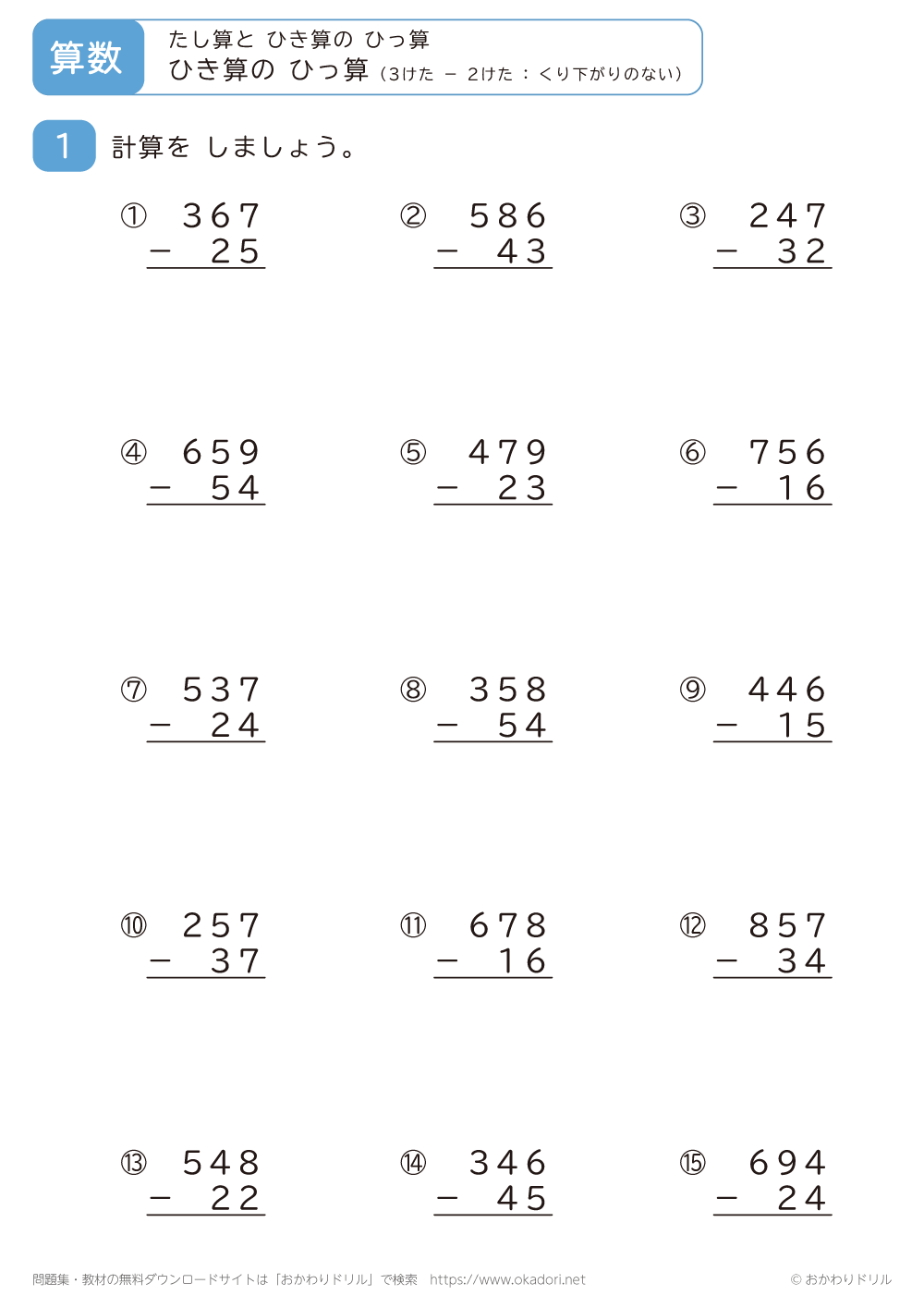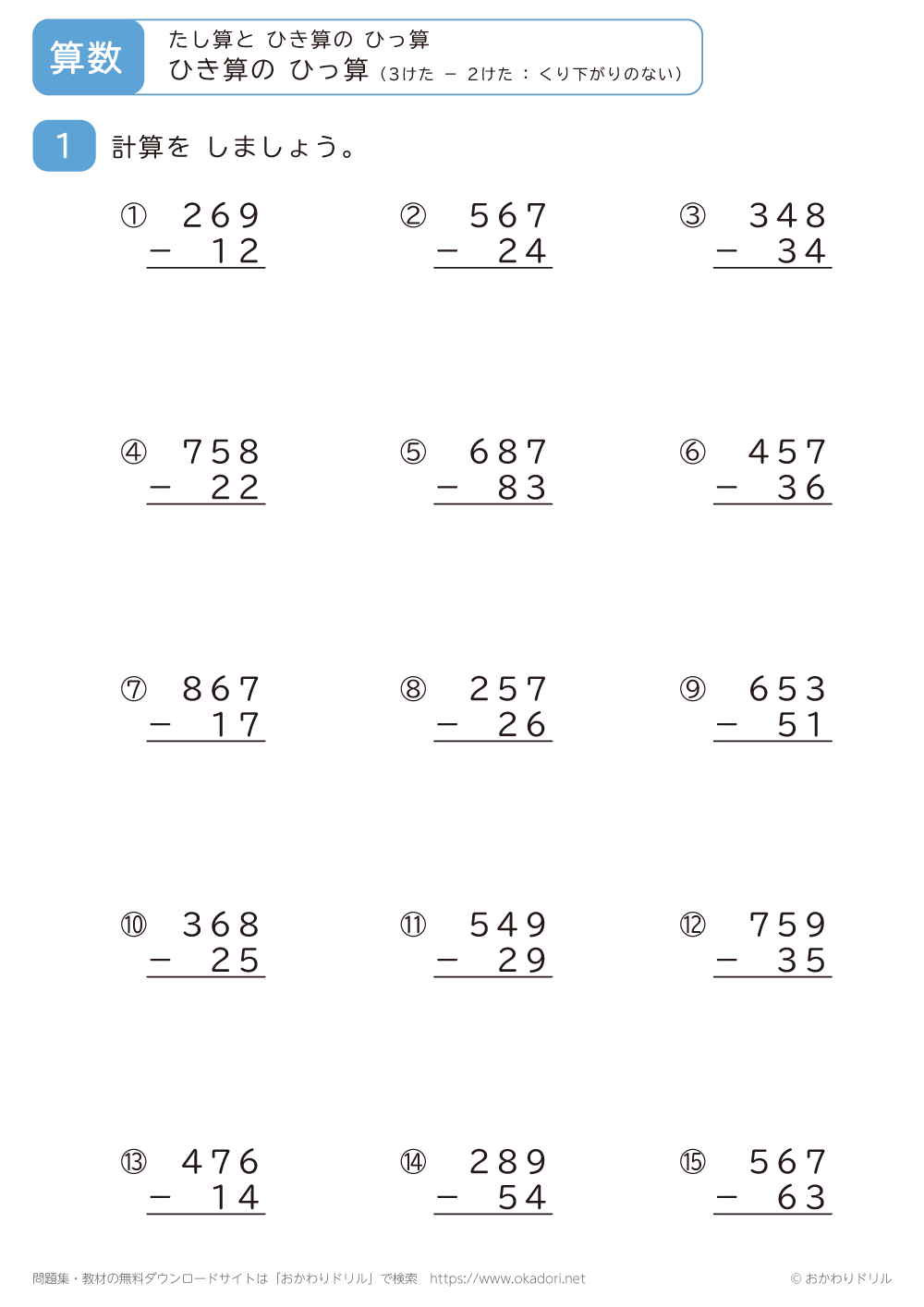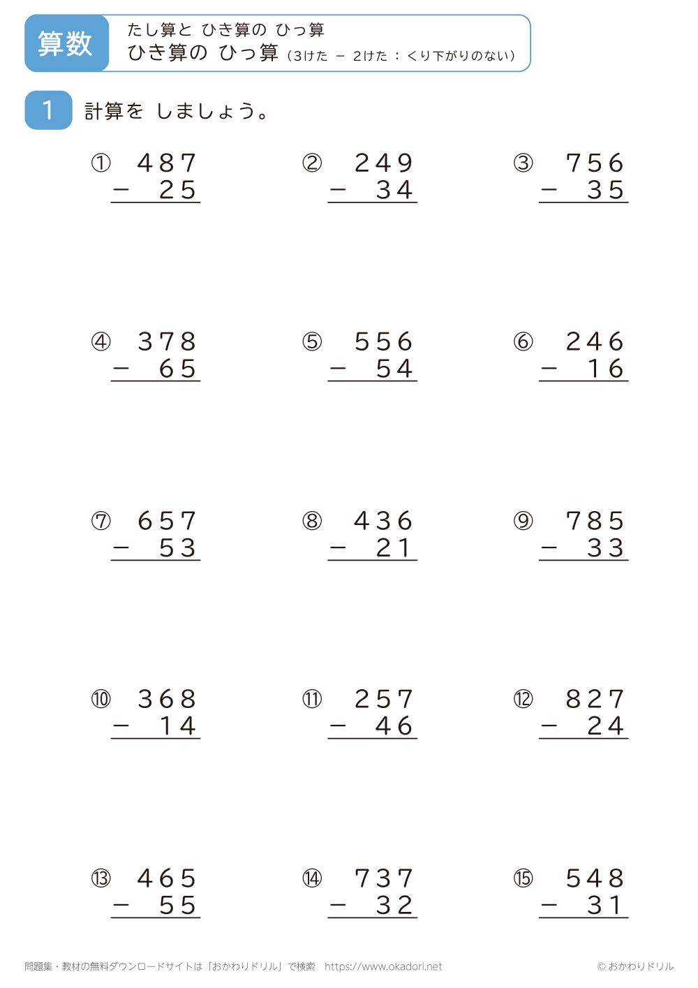 「3桁-2桁の引き算の筆算(くり下がりのない)」の学習プリントはこちら