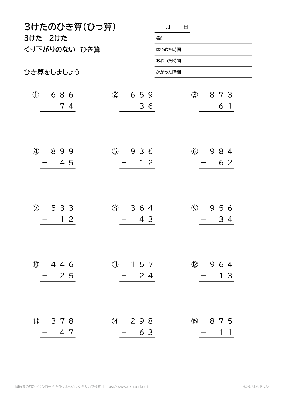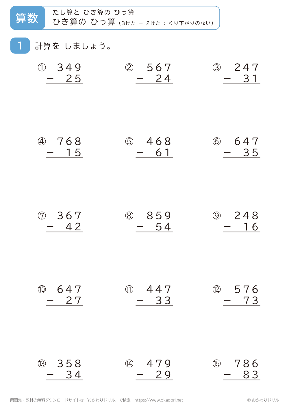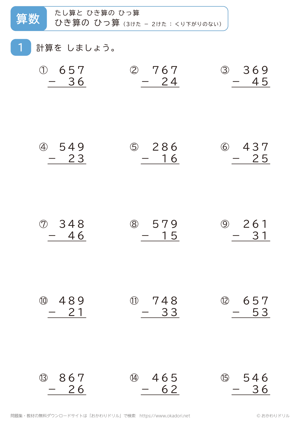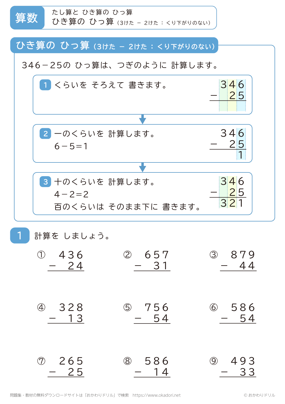 「3桁-2桁の引き算の筆算(くり下がりのない)」の学習プリントはこちら