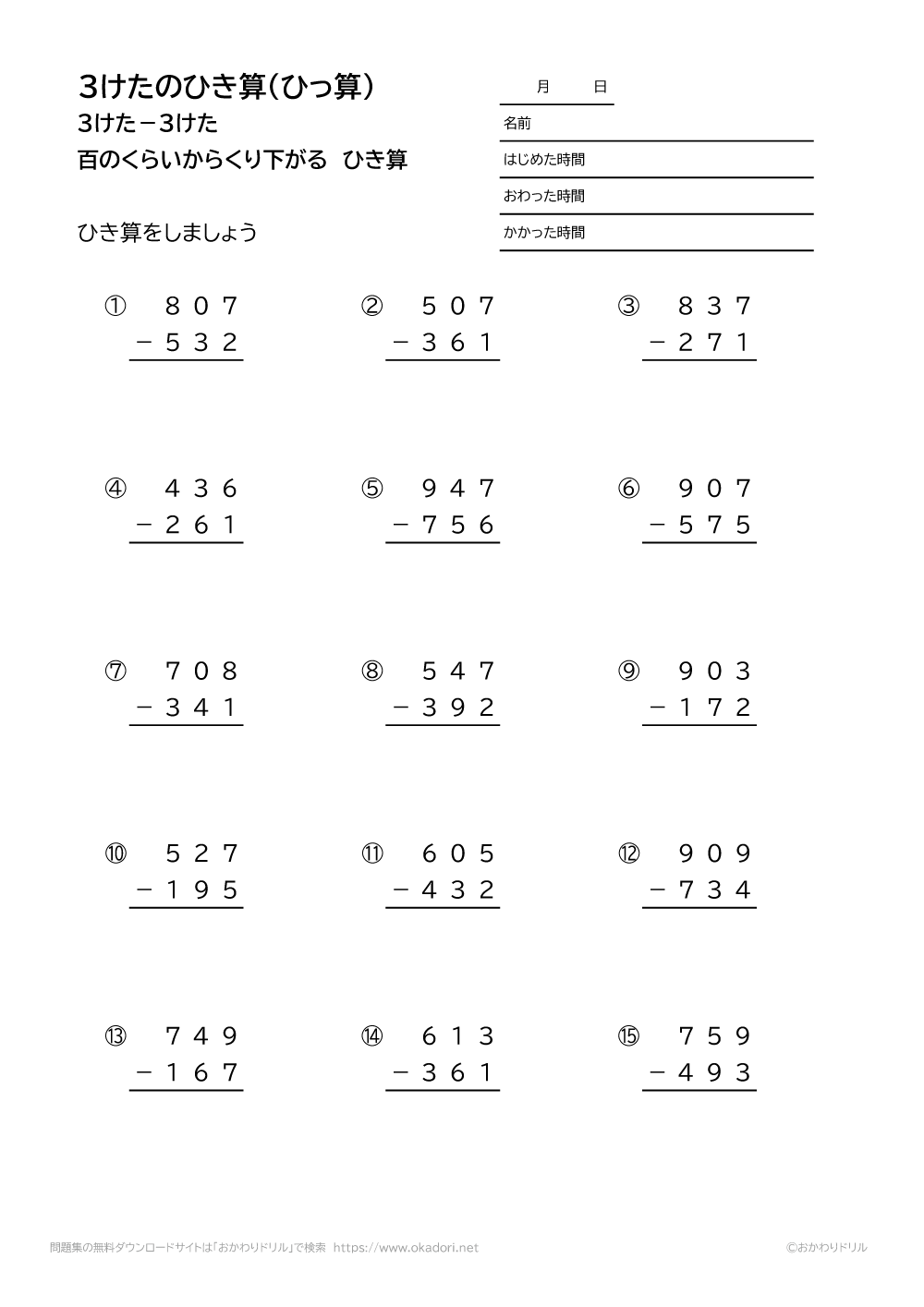 このページは、小学3年生で習う「3桁の引き算の筆算(くり下がりが1回ある)」が学 ...