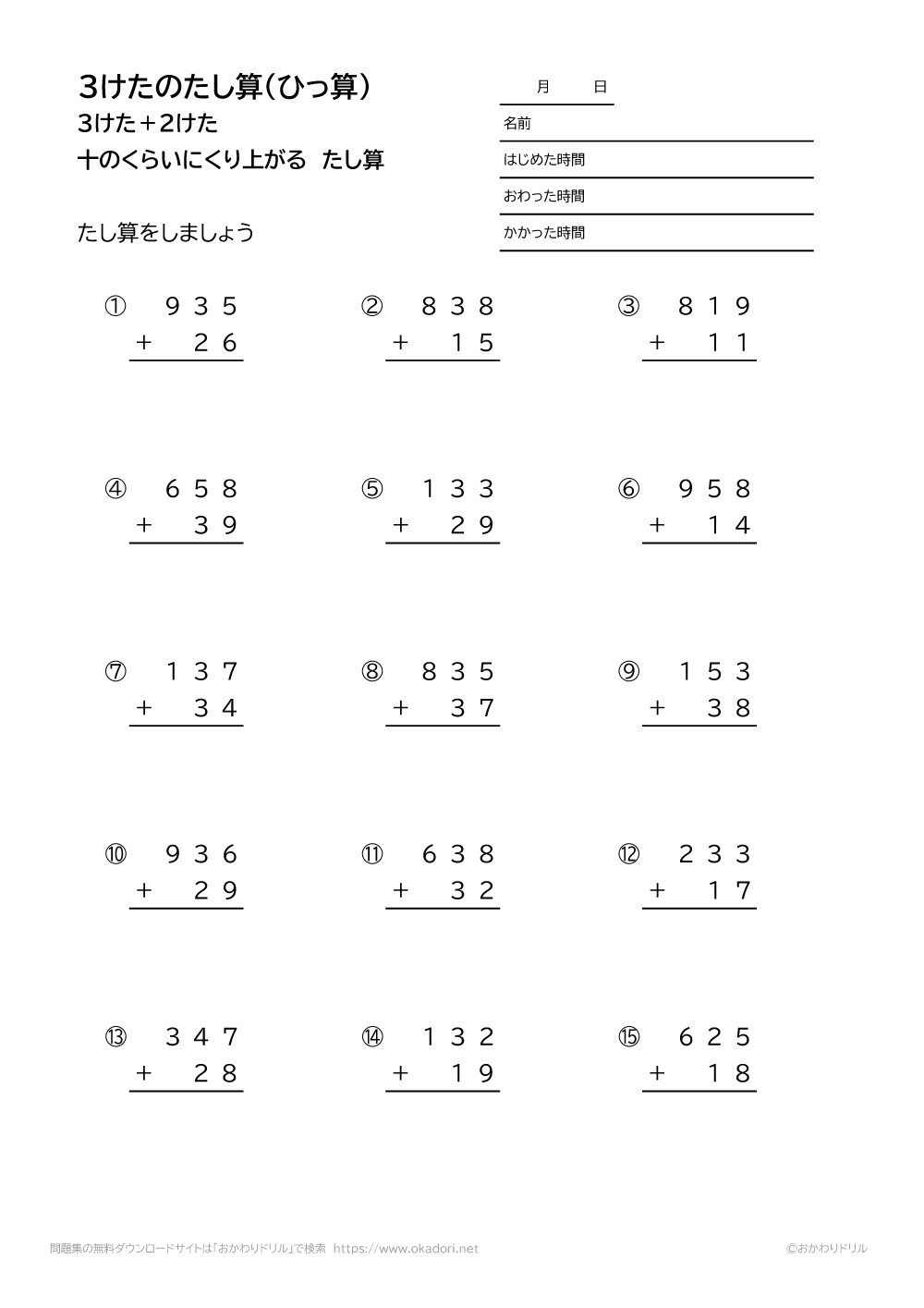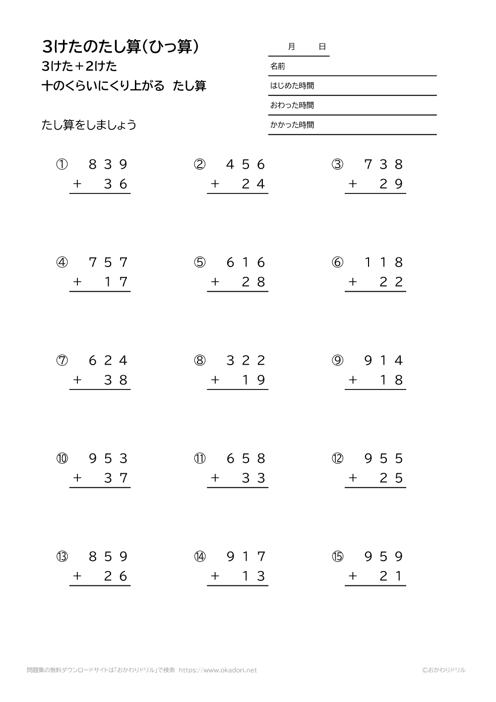 このページは、小学2年生で習う「2桁+2桁の足し算の筆算(くり上がりが2回ある) ...