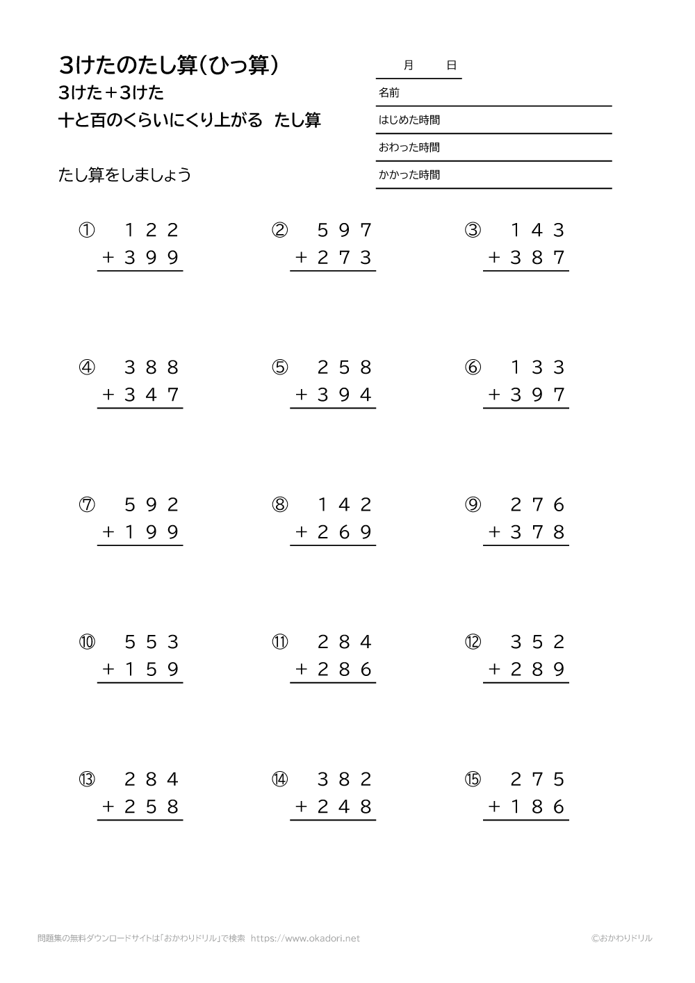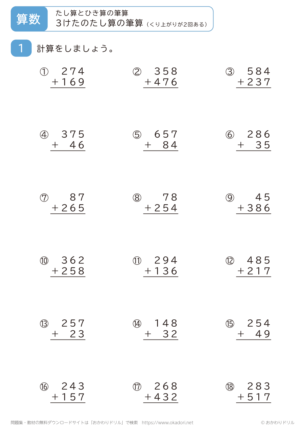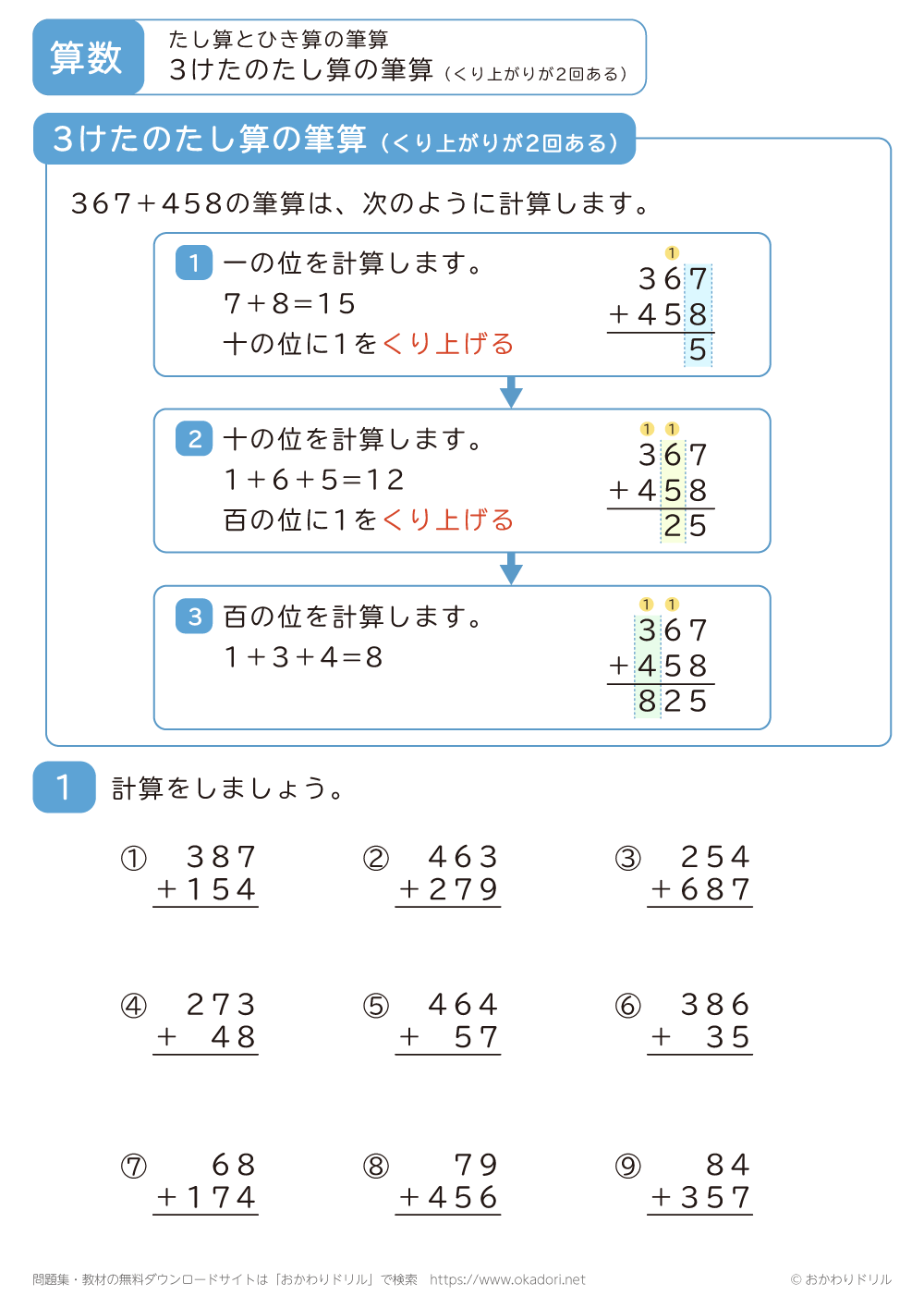 このページは、小学3年生で習う「3桁の足し算の筆算(くり上がりが2回ある)」が学 ...