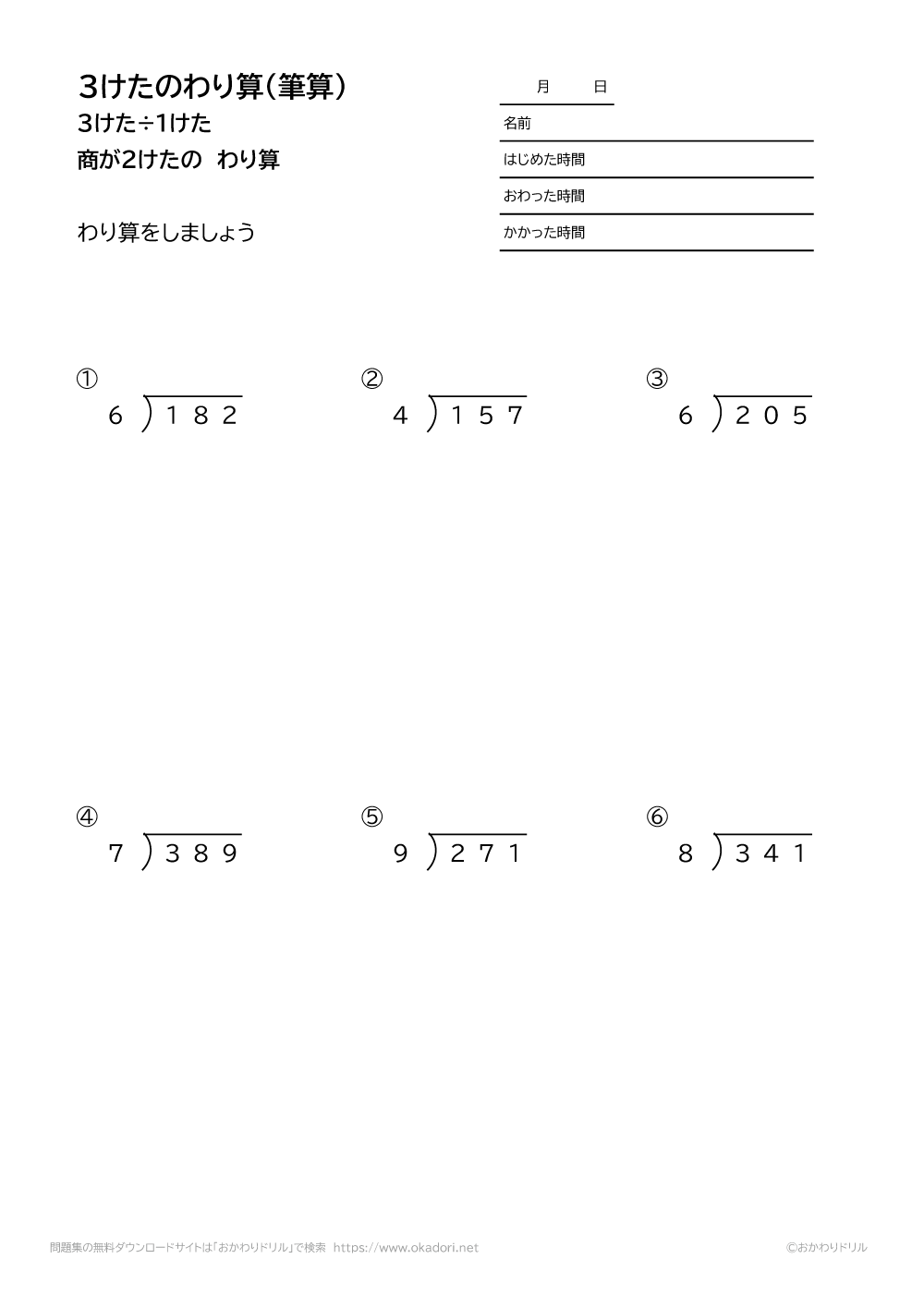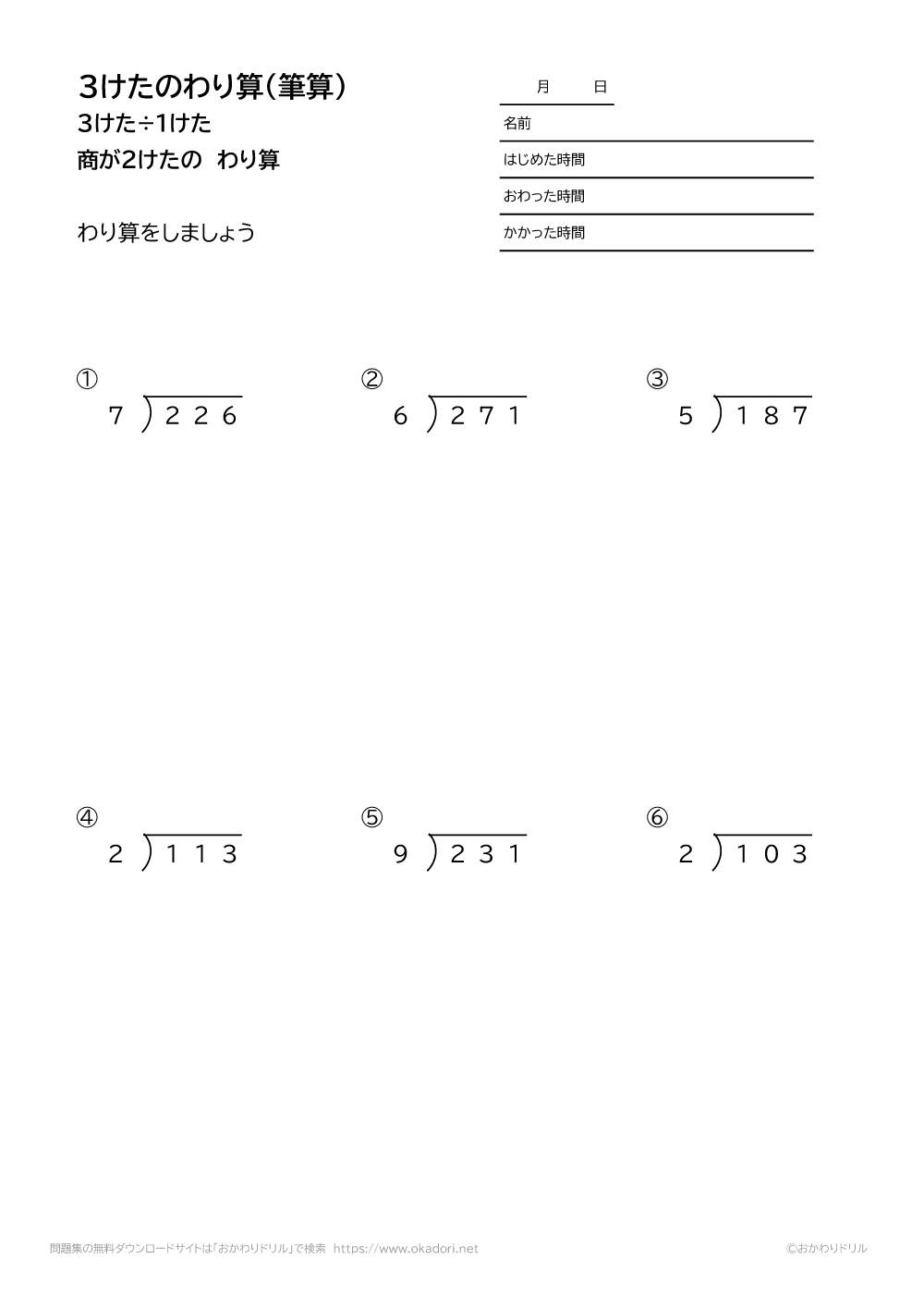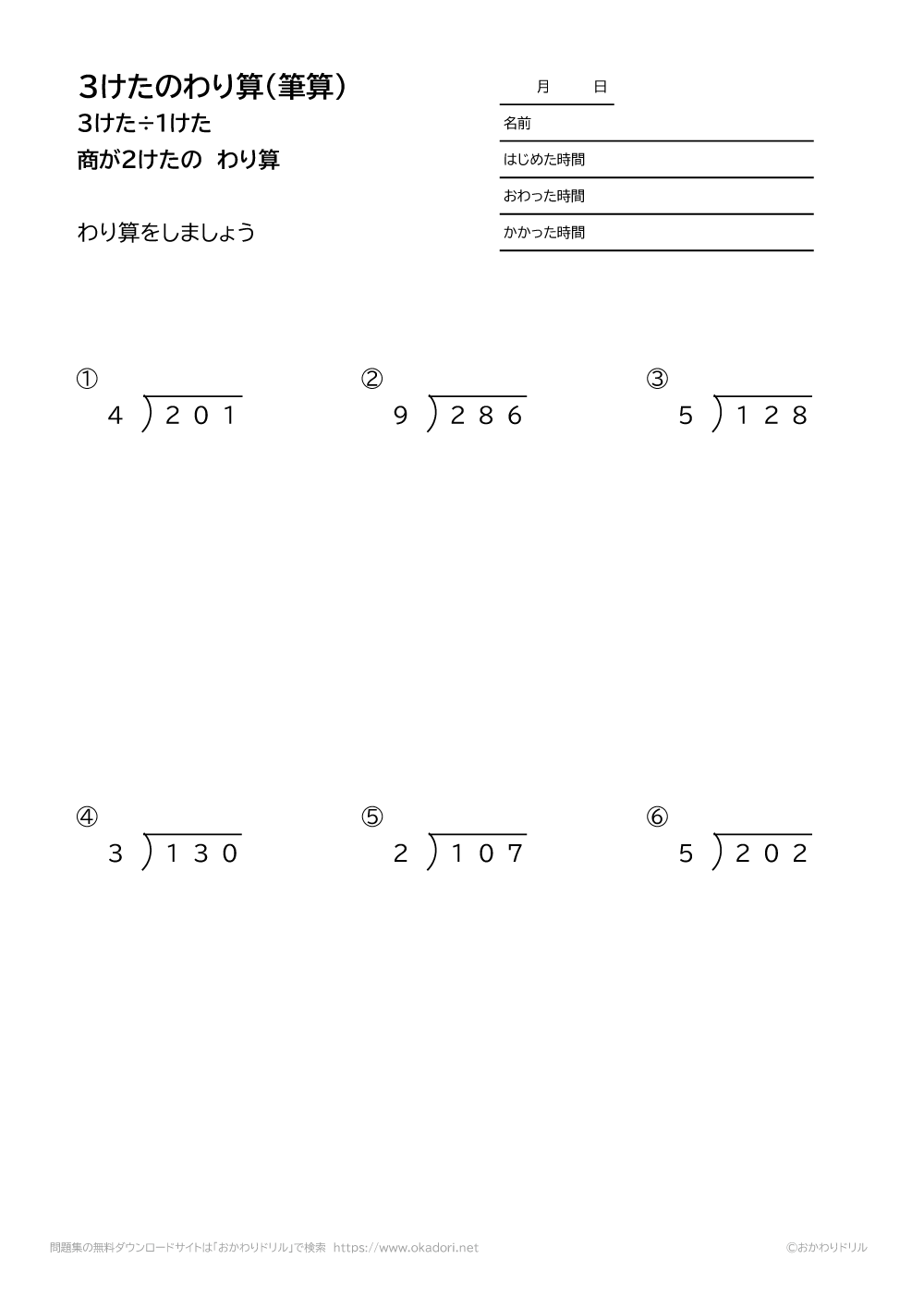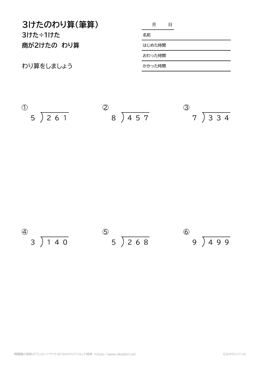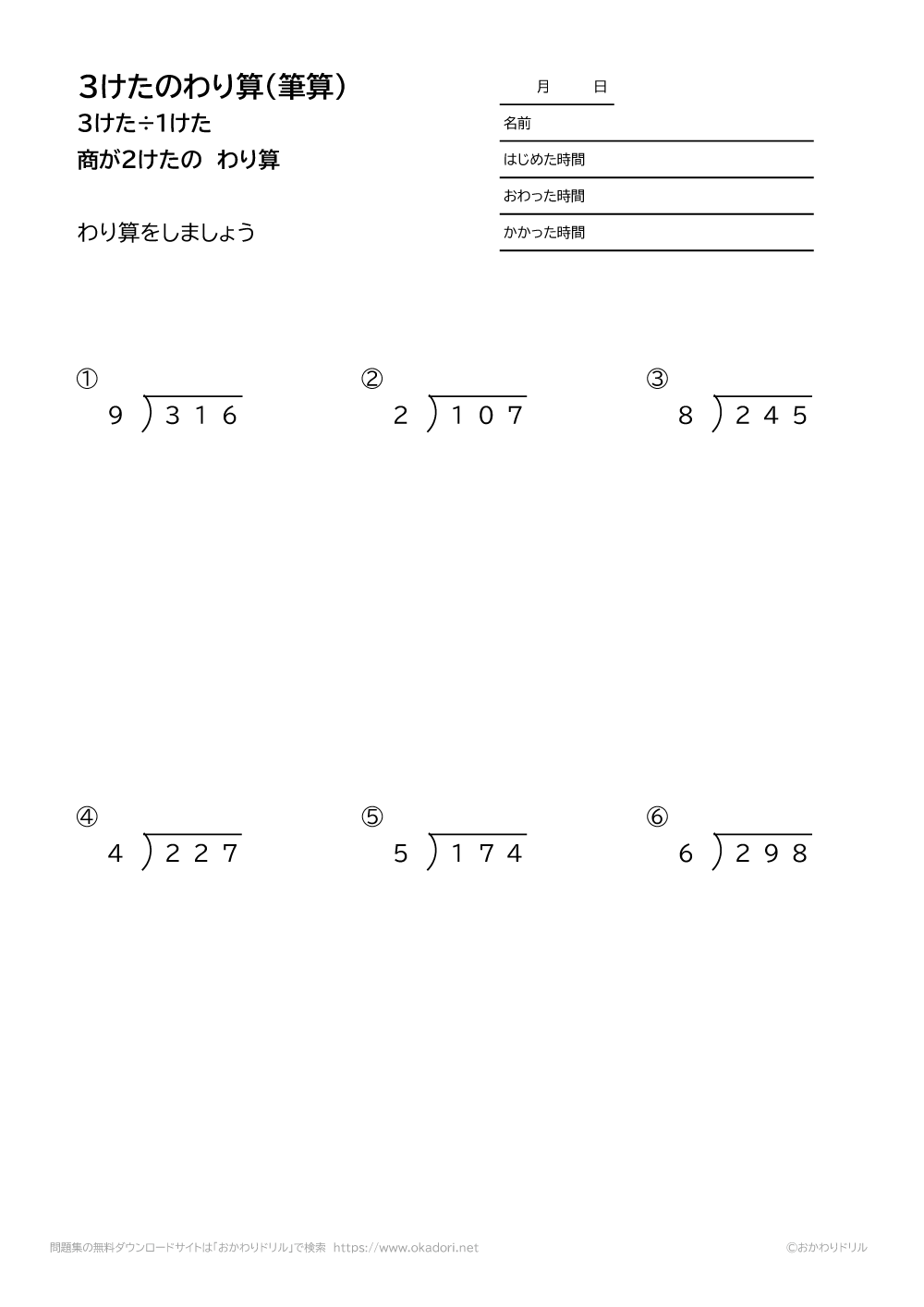 3桁と1桁の割り算の問題です。割り切れないときは余りが出ることに注意して割り算を解く問題です。