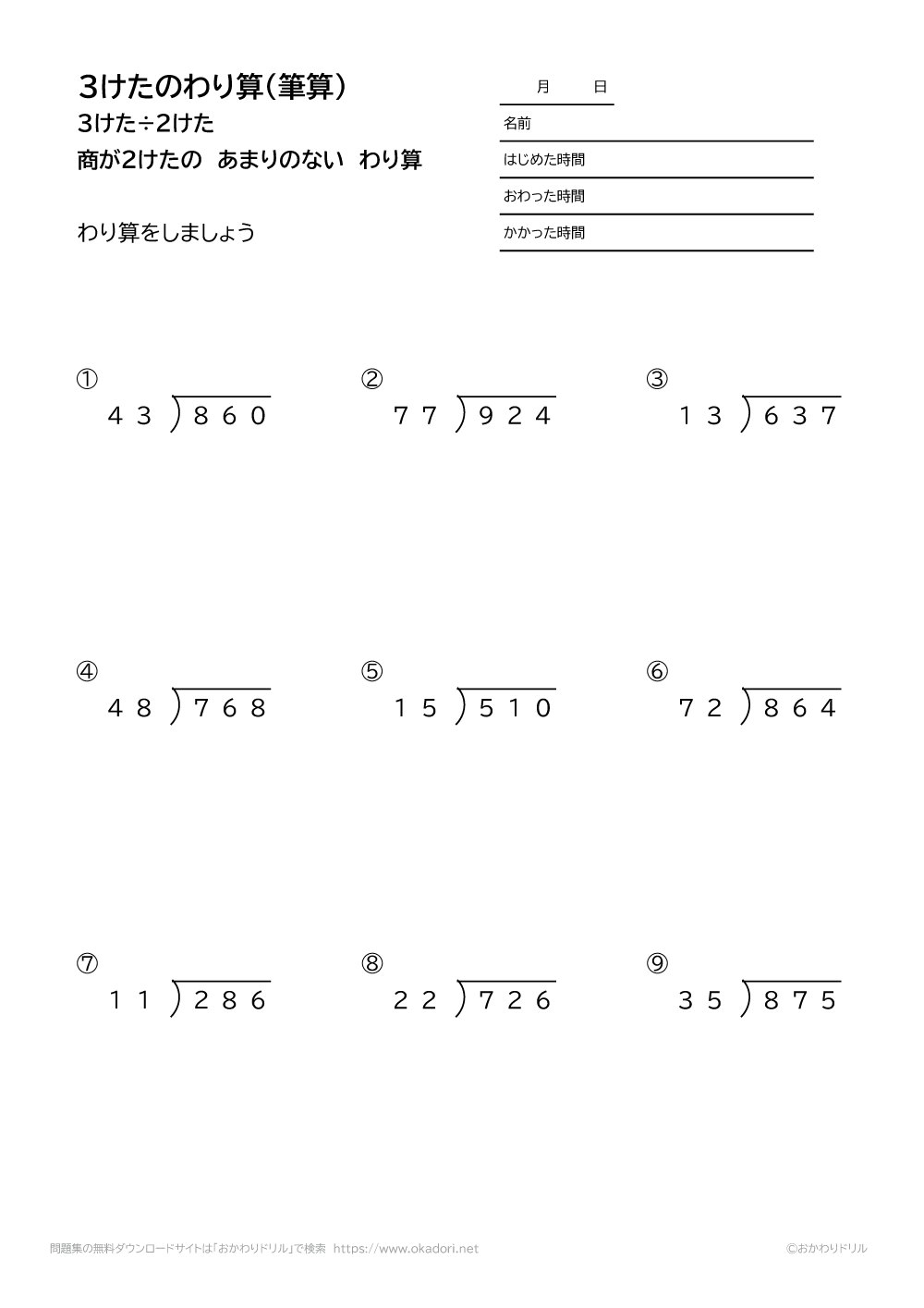 このページは、小学4年生が割り算の筆算を学習するための「3桁÷2桁の商が2桁になる余りの無い割り算」が学習できるページです。