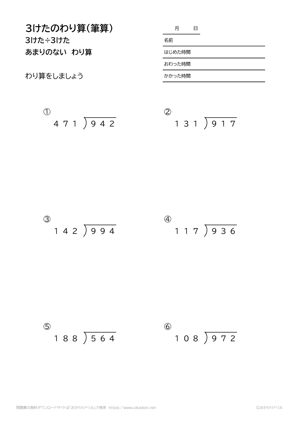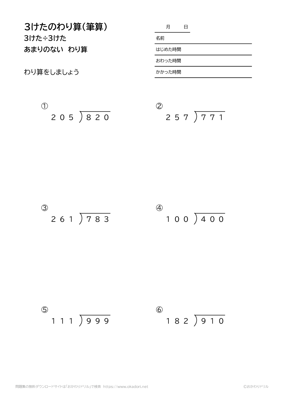 このページは、小学4年生が割り算の筆算を学習するための「3桁÷3桁の余りの無い割り算」が学習できるページです。