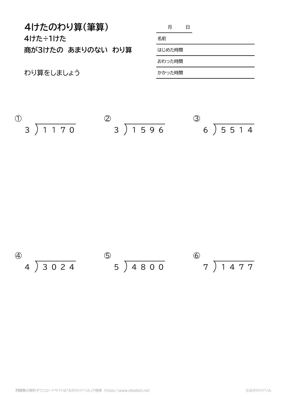 このページは、小学4年生が割り算の筆算を学習するための「4桁÷1桁の商が3桁になる余りの無い割り算」が学習できるページです。