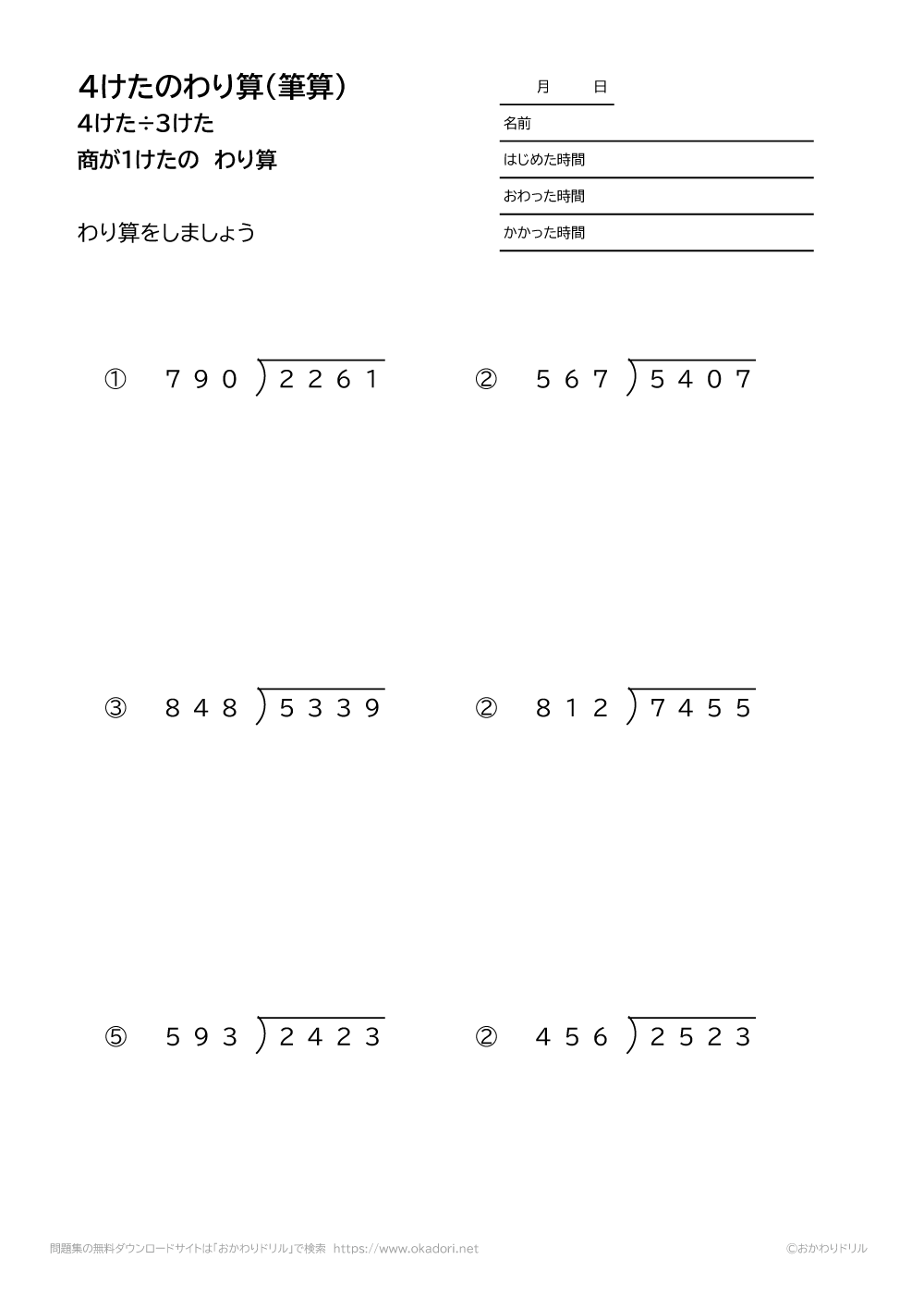 このページは、小学4年生が割り算の筆算を学習するための「4桁÷3桁の商が1桁になる割り算」が学習できるページです。