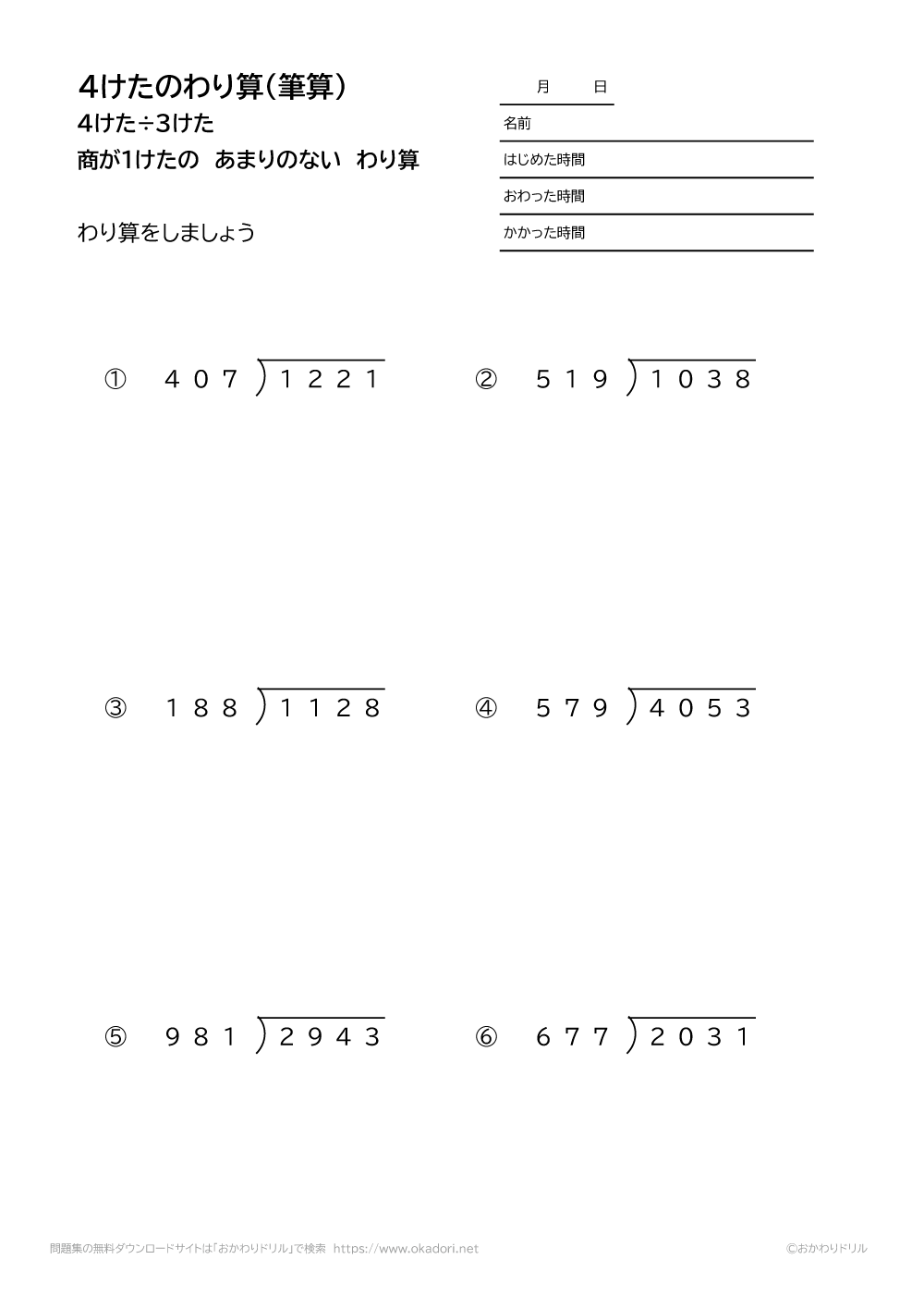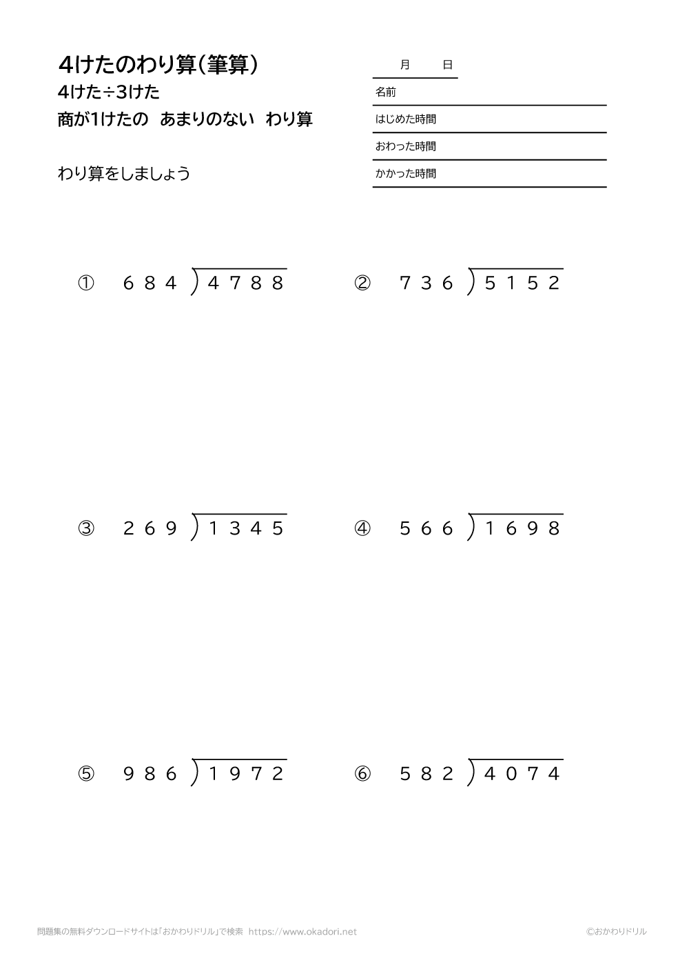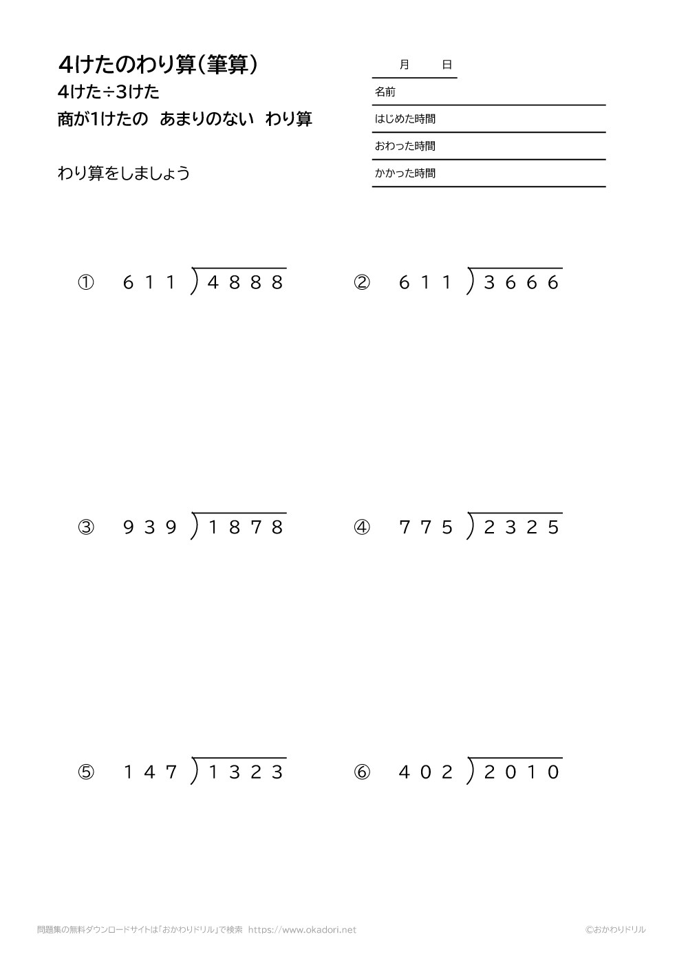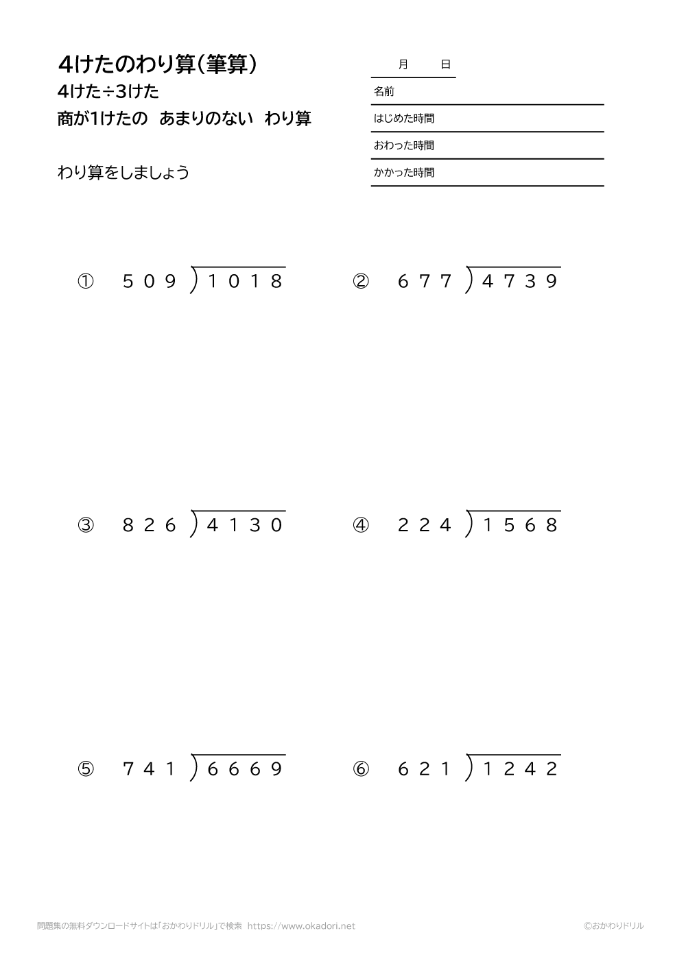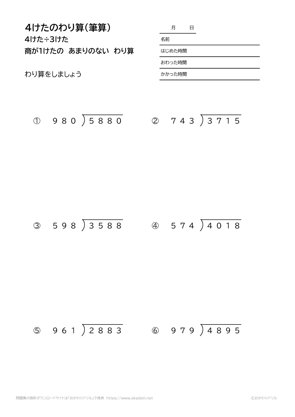 このページは、小学4年生が割り算の筆算を学習するための「4桁÷3桁の商が1桁になる余りの無い割り算」が学習できるページです。