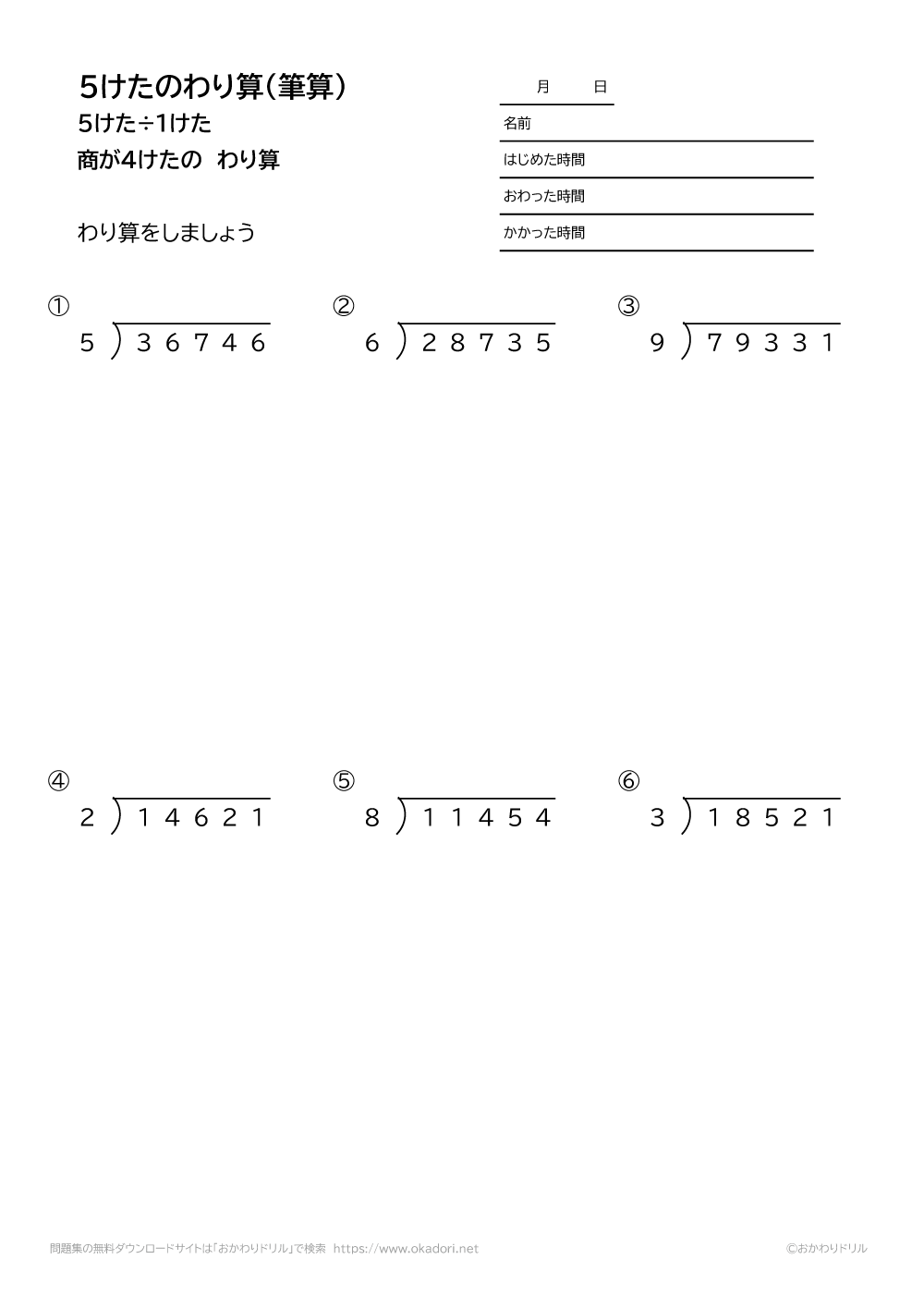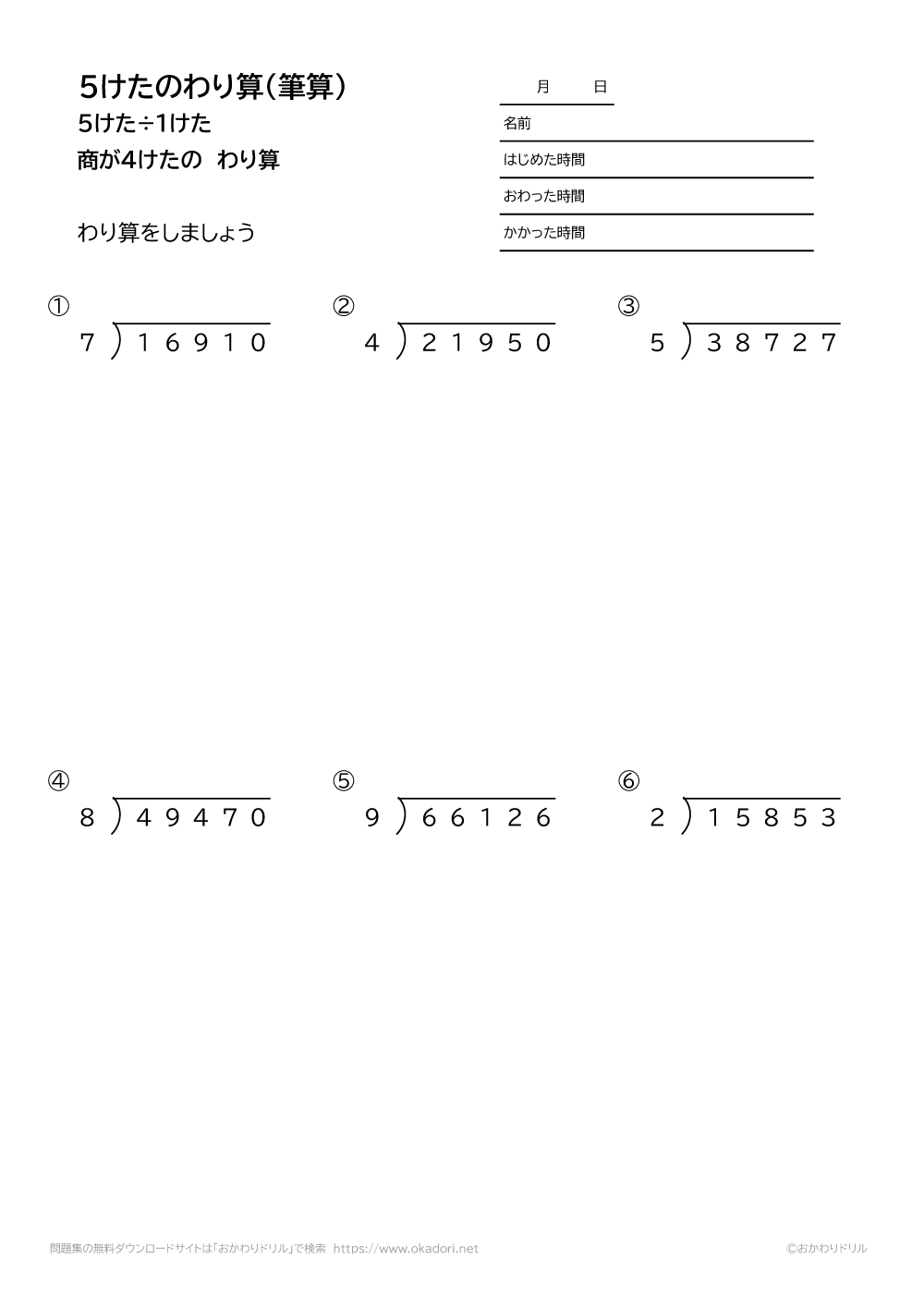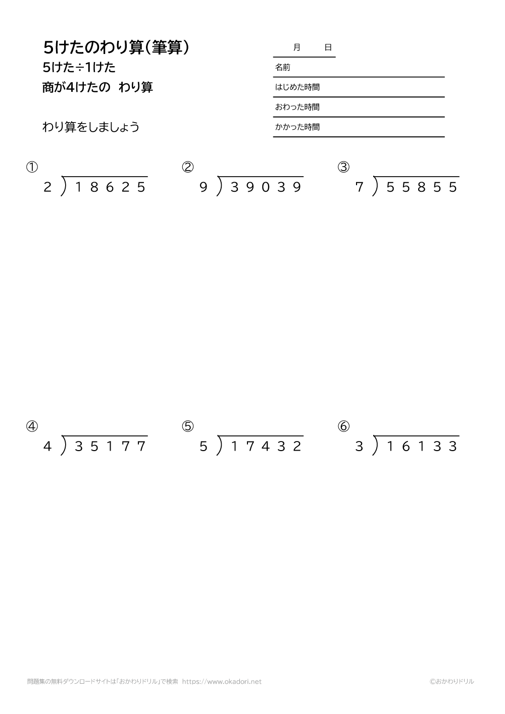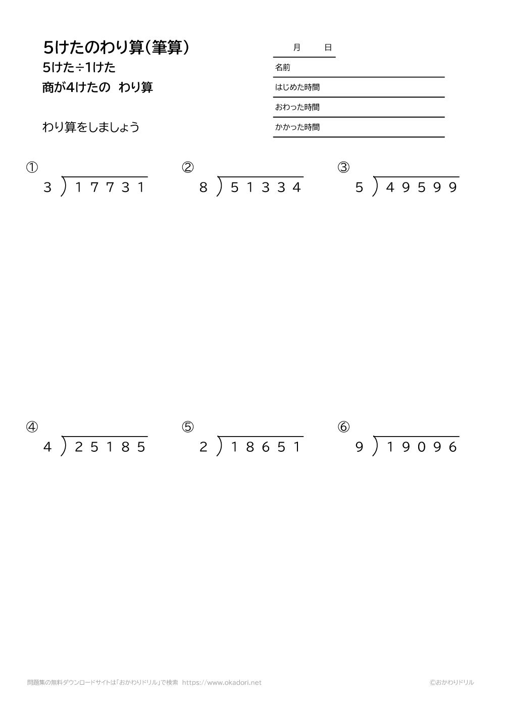このページは、小学4年生が割り算の筆算を学習するための「5桁÷1桁の商が4桁になる割り算」が学習できるページです。