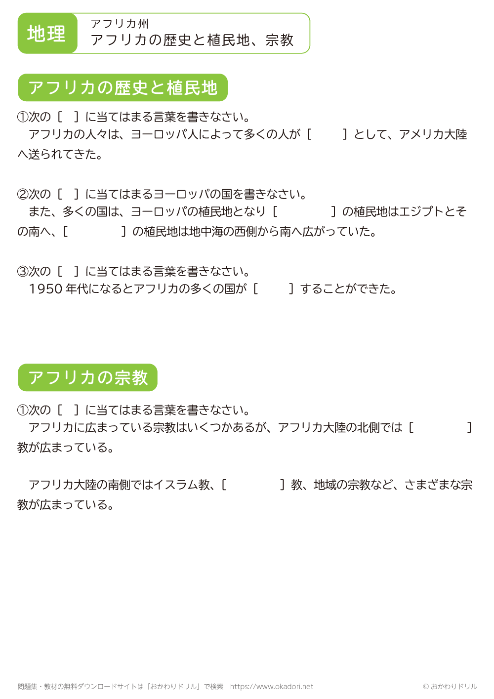 「アフリカの歴史と植民地、宗教」の学習プリントはこちら