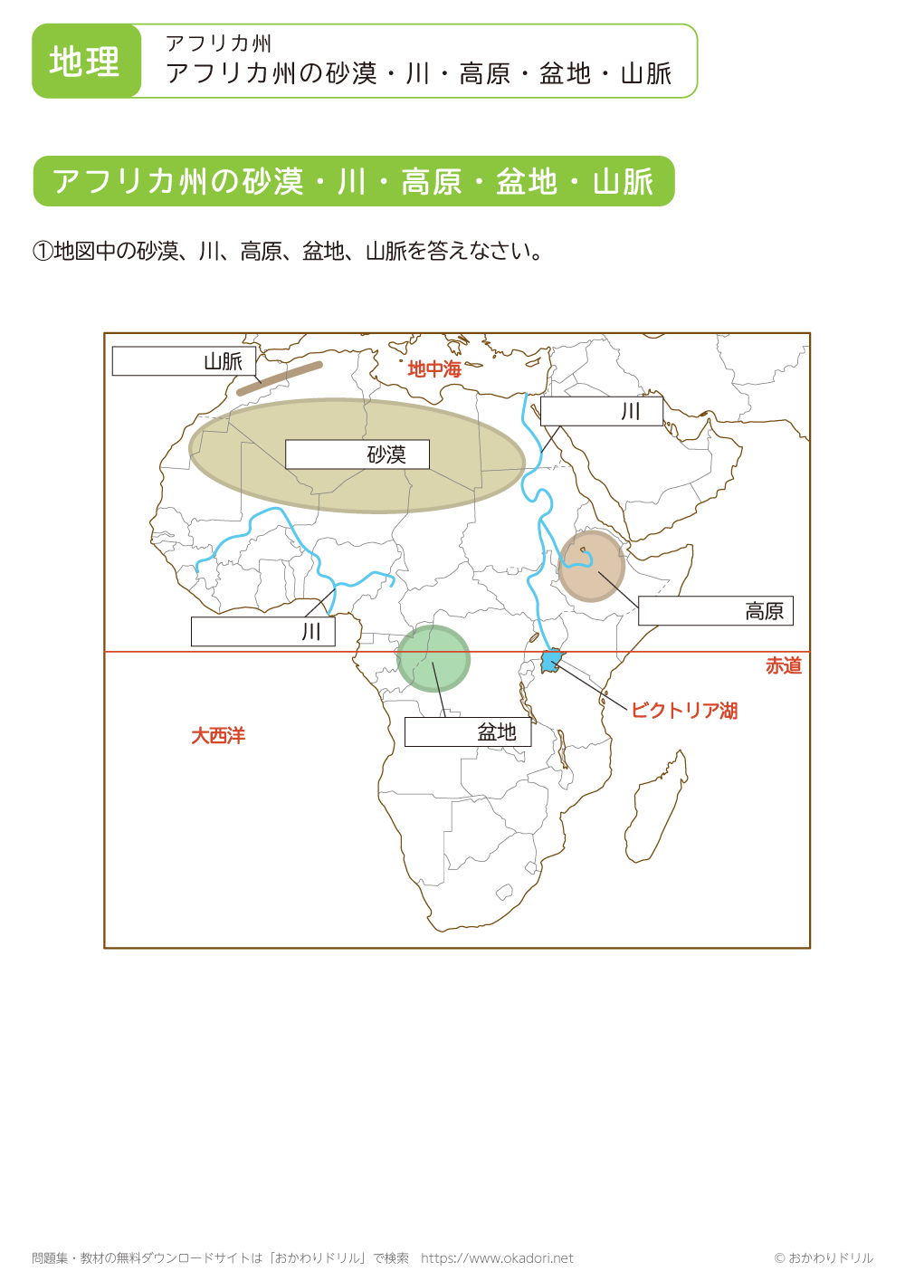 アフリカ州にはどのような砂漠、川、高原、盆地などがあるか学習するためのプリントを用意しています。覚えることができたかテストしたい時には、問題プリントを利用してみて下さい。