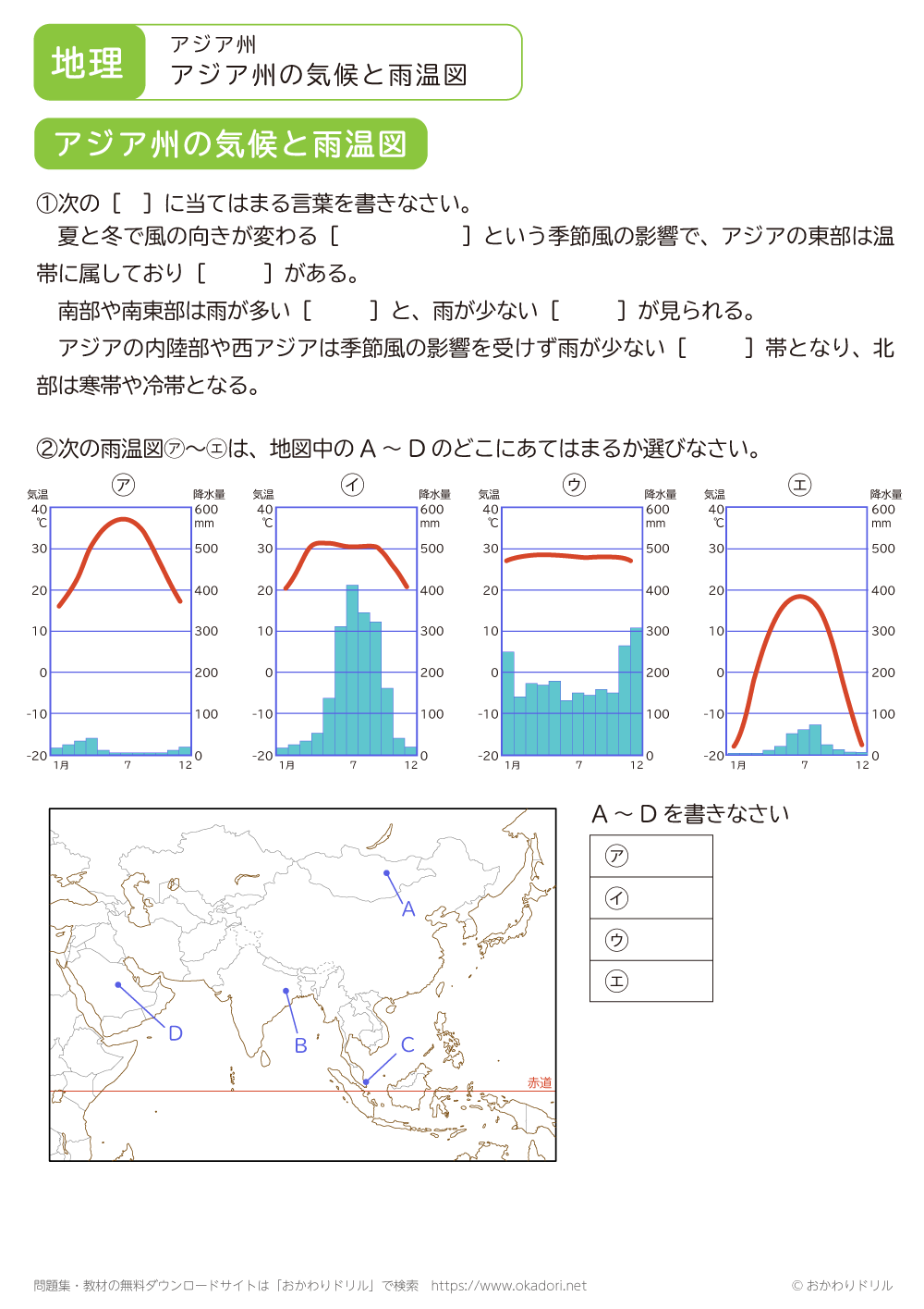 アジア州はそれぞれの地域で、どのような気候や雨温図となるかを学習するためのプリントを用意しています。覚えることができたかテストしたい時には、問題プリントを利用してみて下さい。