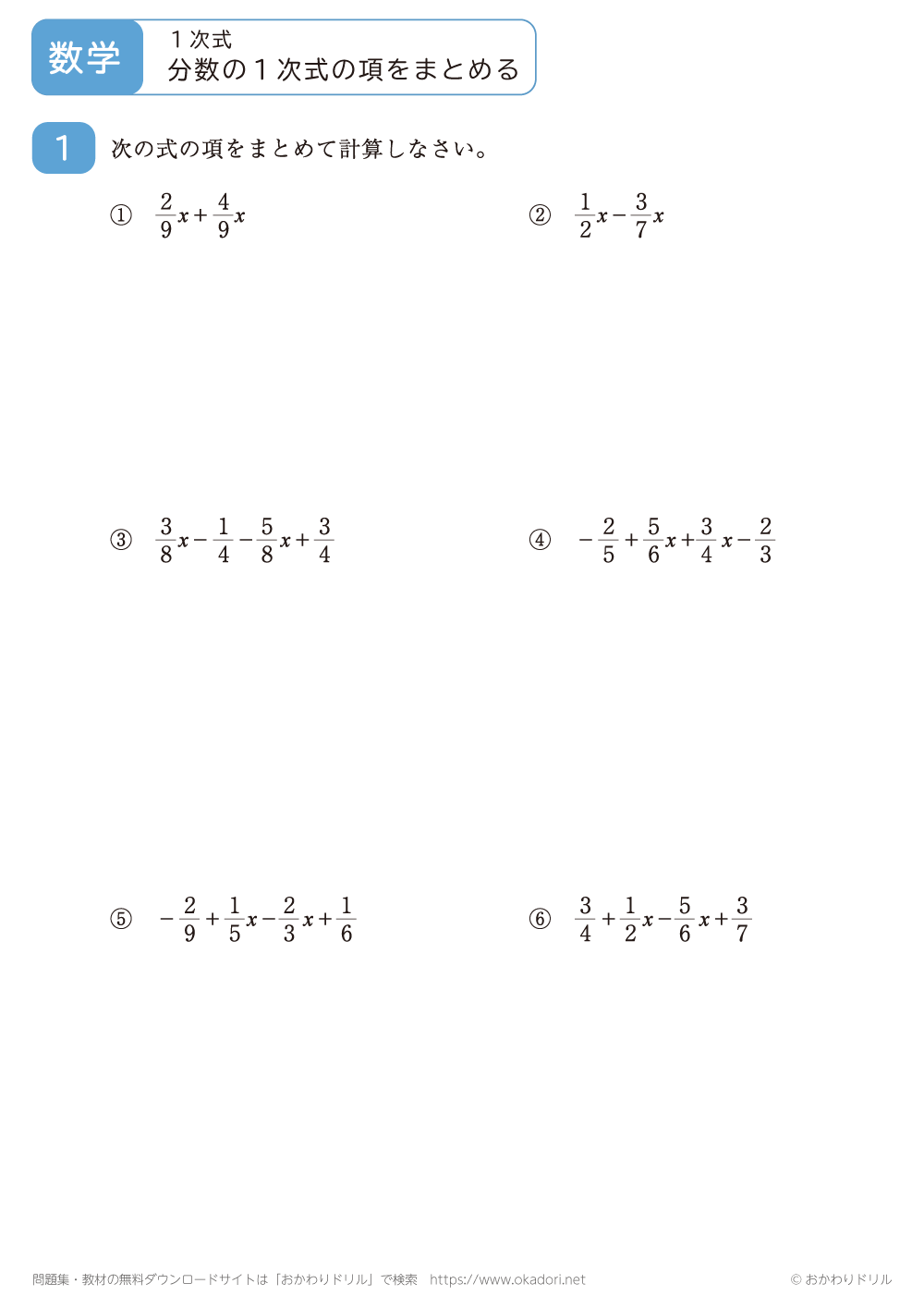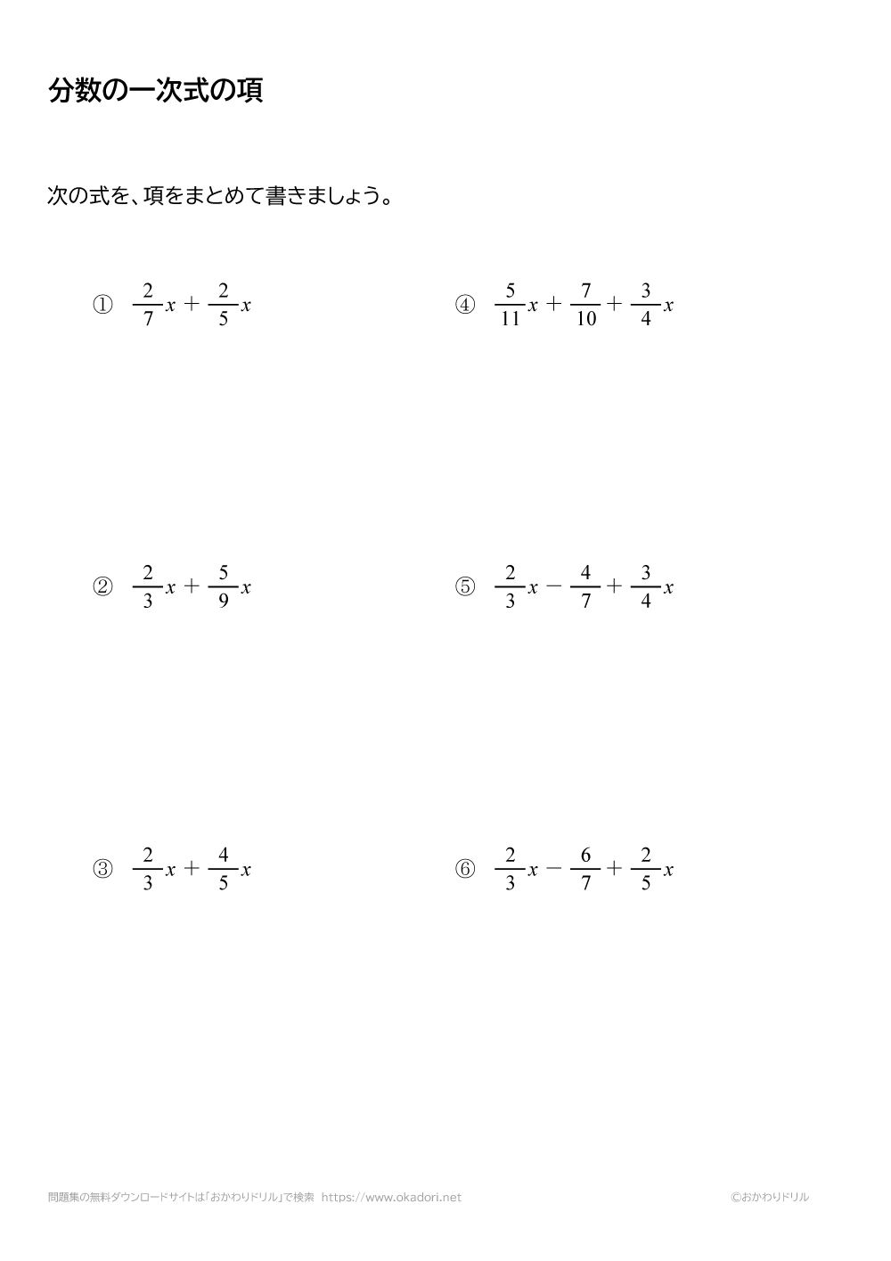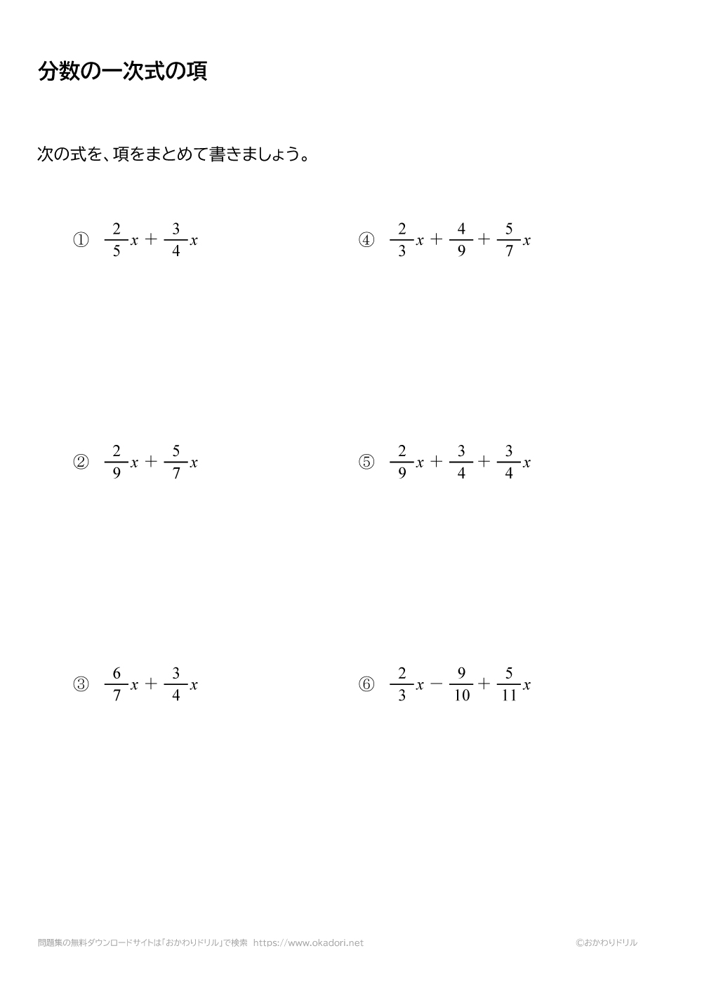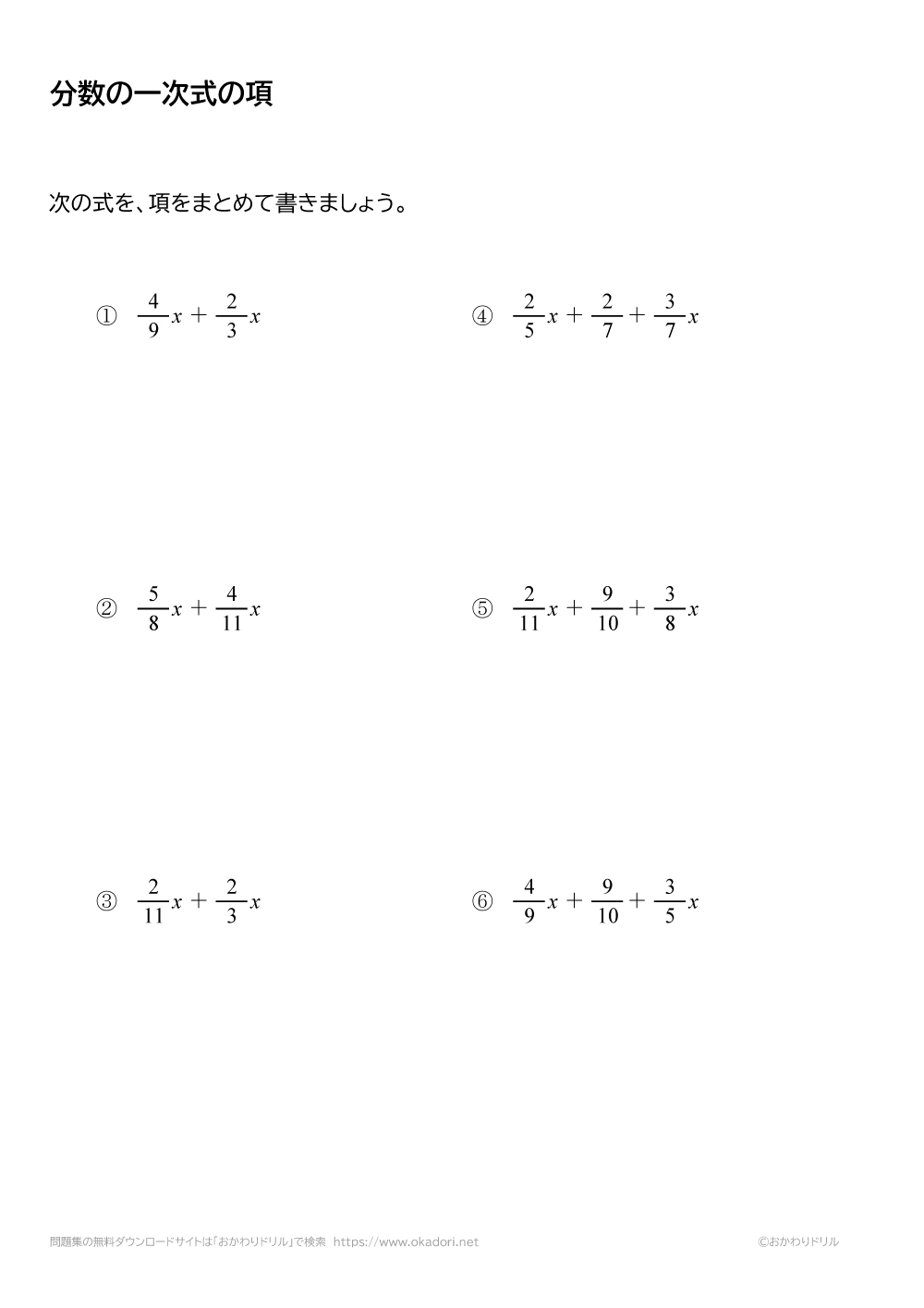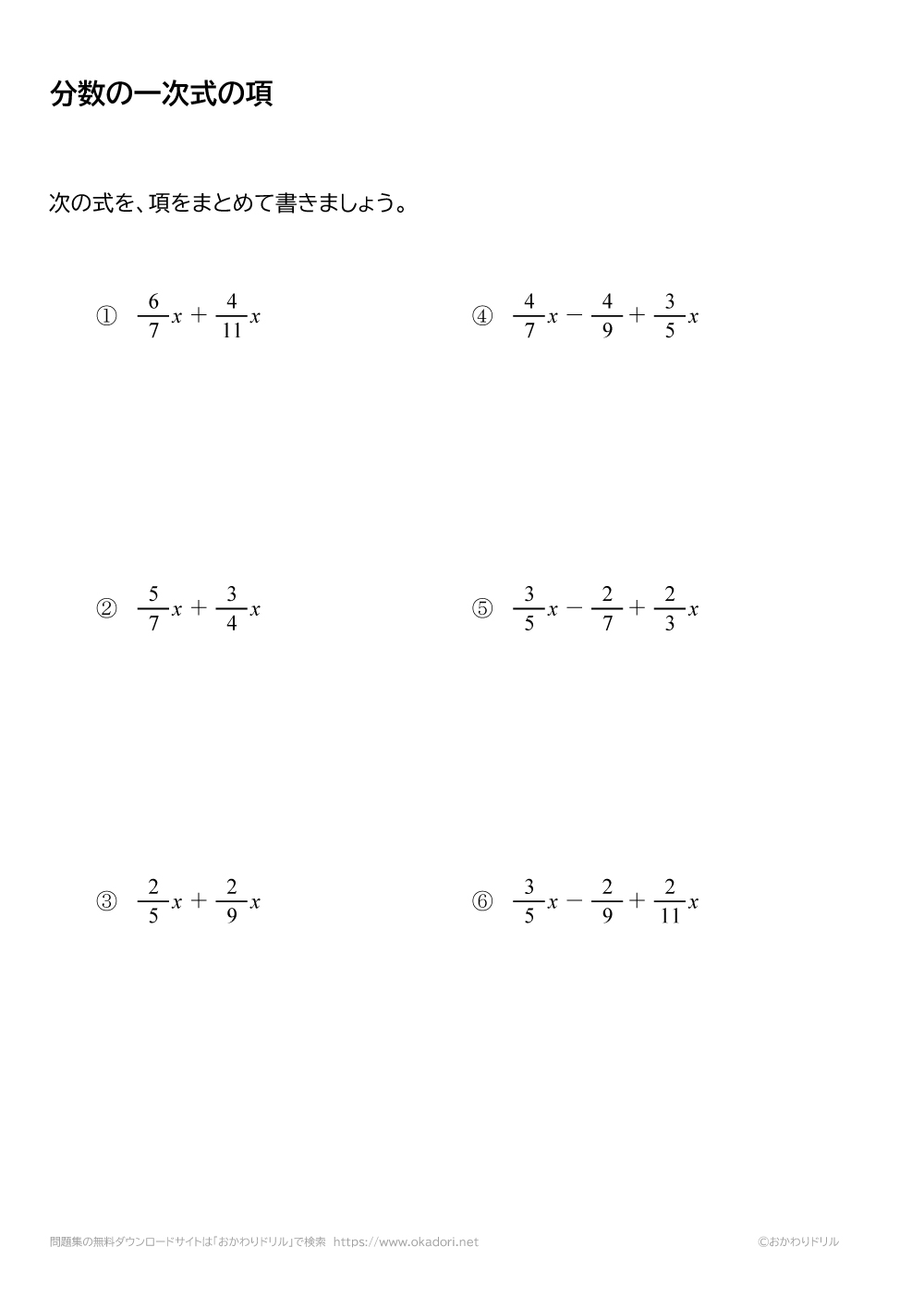 分数の1次式の項をまとめる問題です。分数の1次式の「1次の項」や「数の項」をまとめて簡単に書きましょう。
