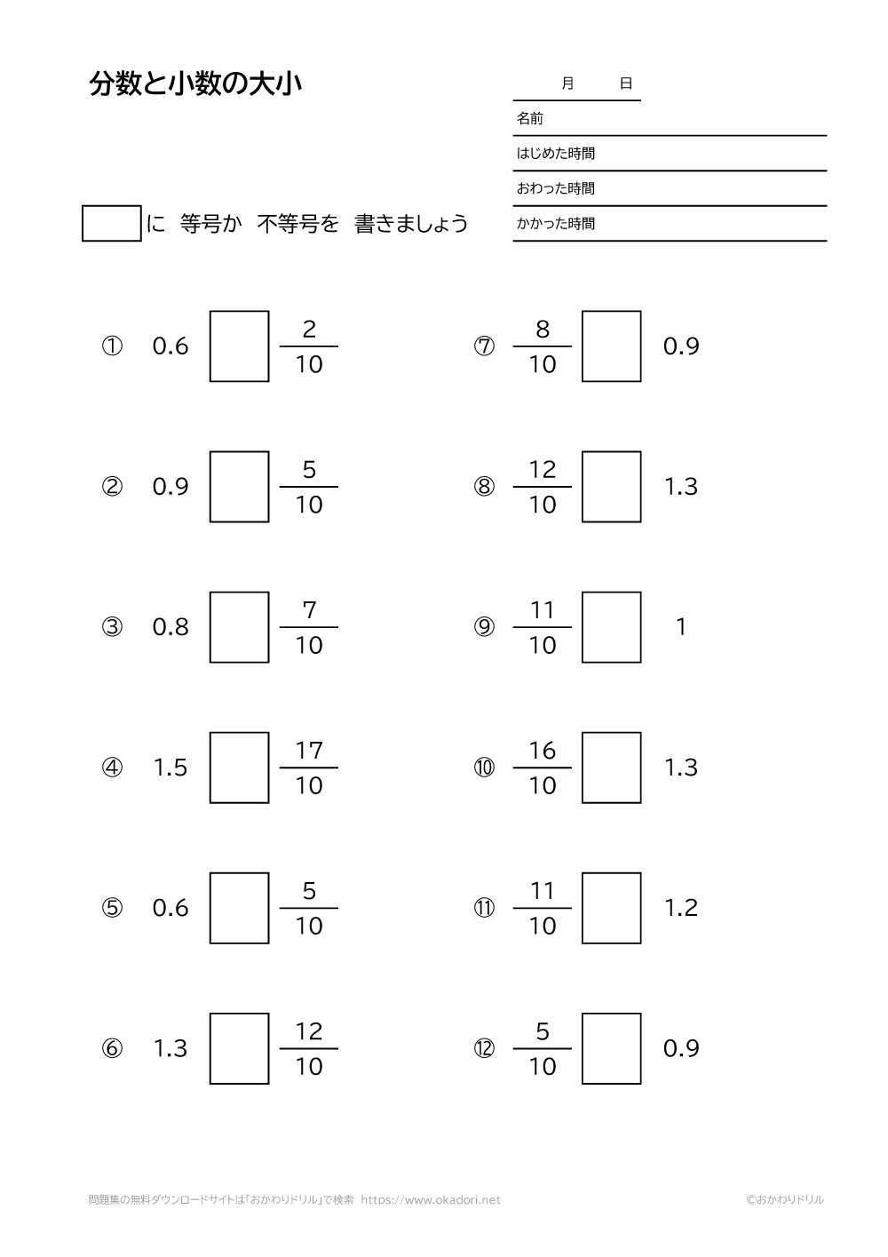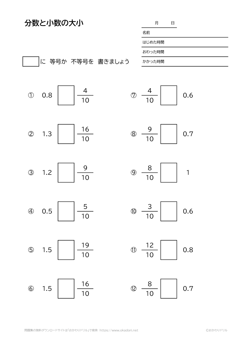 分数と小数で大小を考える問題を解いてみましょう。等号や不等号を使って数の大小を書き表します。