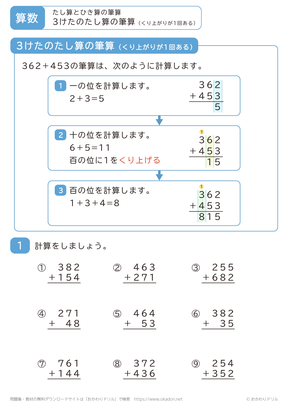 このページは、小学3年生で習う「3桁の足し算の筆算(くり上がりが2回ある)」が学 ...