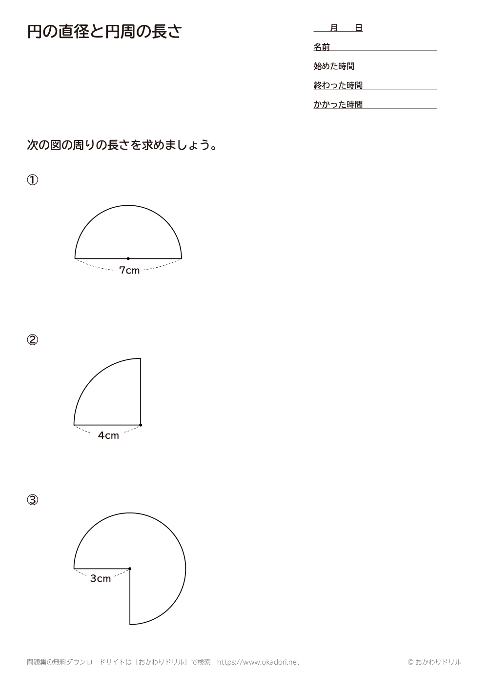 ・問題の後半には、いろいろな円を組み合わせた図形のまわりの長さを求める応用問題もあります。